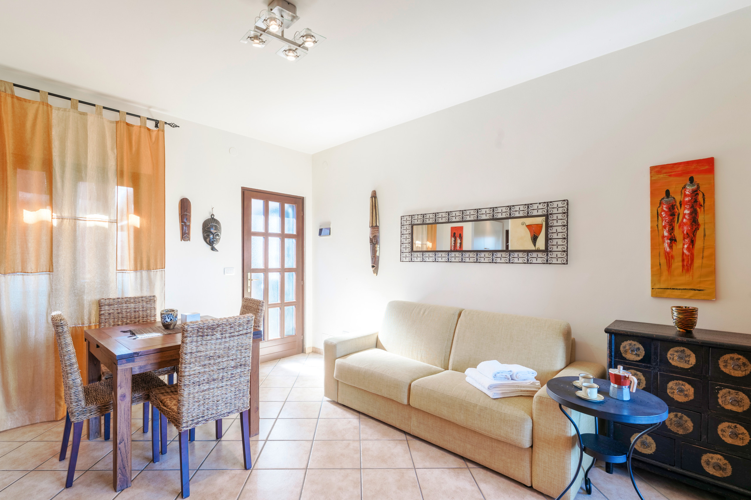 L’appartamento bilocale di circa 37mq, arredato con molta cura per ogni piccolo dettaglio, si sviluppa al secondo piano ed è composto da una confortevole zona giorno dotata di angolo cottura attrezzato con piccolo piano ad induzione, lavastoviglie, piccolo frigorifero e congelatore, tostapane, bollitore e macchina da caffè tedesca. Il soggiorno dispone di un comodo divano letto adatto ad ospitare due bambini o un adulto, Tv satellitare, Wifi ed aria condizionata. Moderno bagno con ampia cabina doccia ed asciugacapelli a disposizione degli ospiti.