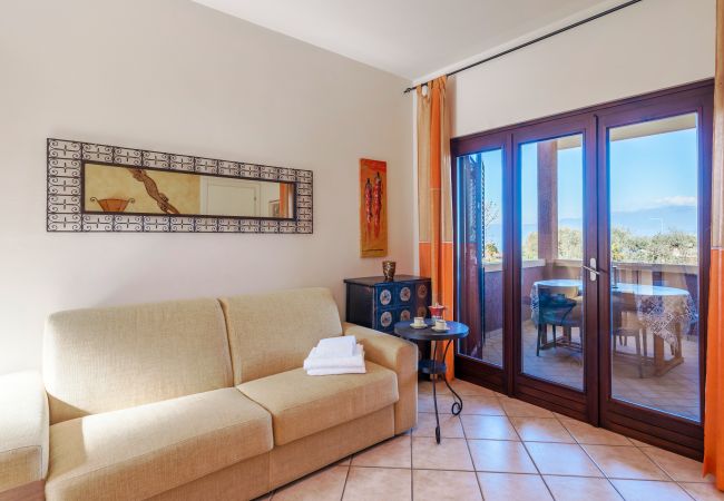 Dal terrazzo, attrezzato con tavolo e sedie, si può godere di una magnifica vista sul lago con tramonti mozzafiato e della vista della piscina per adulti e bambini (periodo di apertura garantito dal 01/06 al 30/09), lettini inclusi.