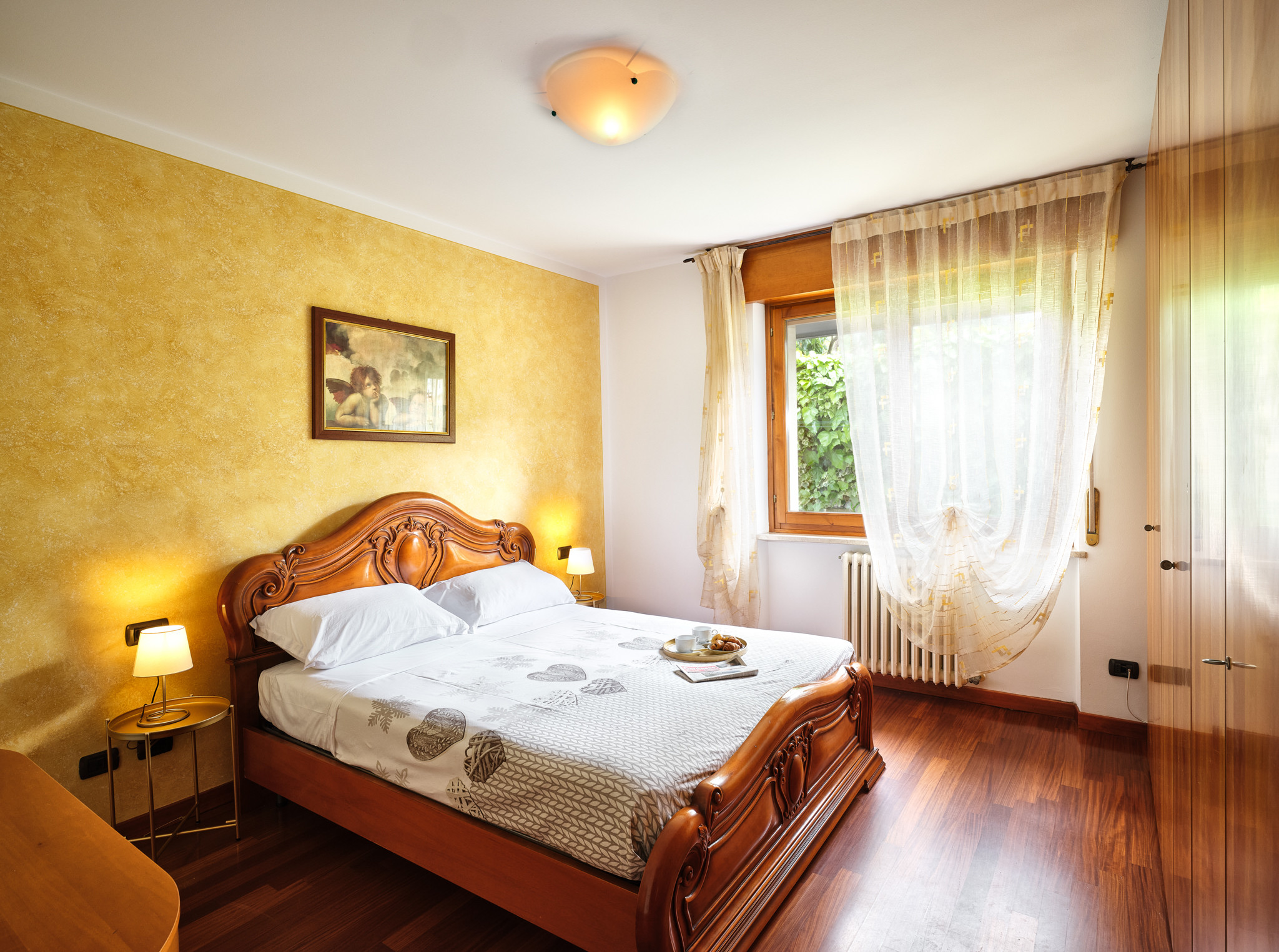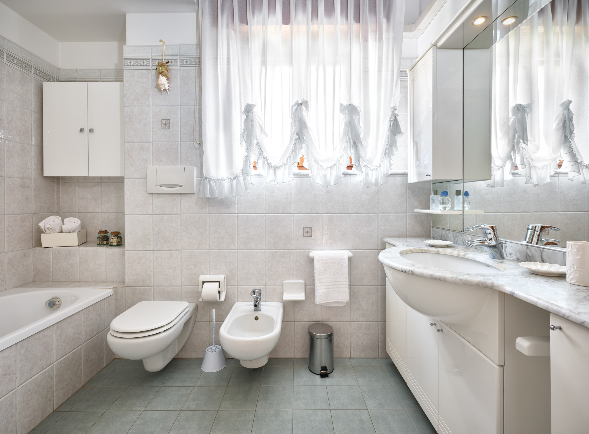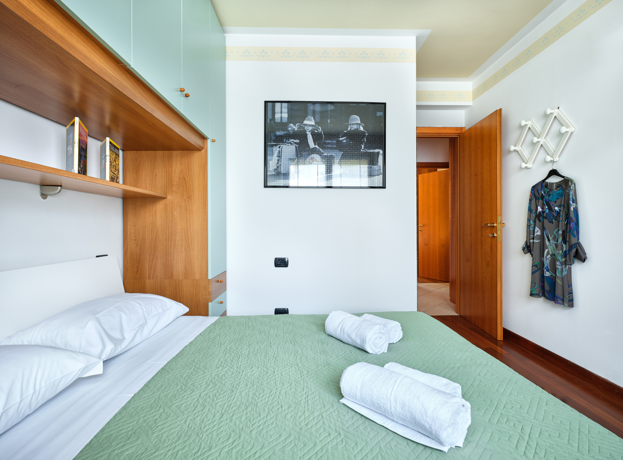 L'appartamento dispone di due camere con ampio guardaroba e letto matrimoniale, una camera con letto singolo ed un comodo spazio di lavoro. Un bambino in più può essere accomodato sul divano letto. Un bagno completo di wc, lavandino, bidet e vasca, secondo bagno completo di doccia.