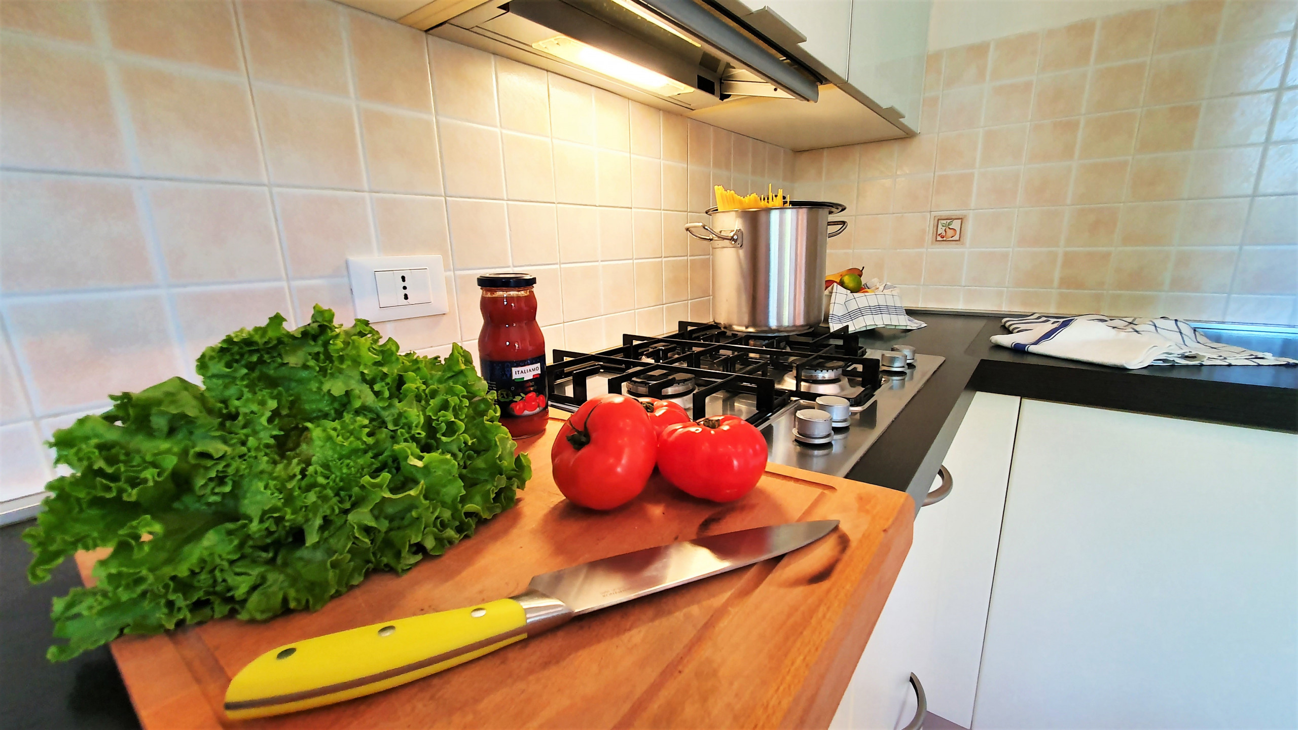 L’appartamento è situato al primo piano ed è composto da un’ampia zona giorno con moderna cucina, divano letto matrimoniale, spazioso tavolo da pranzo, Tv satellitare. La cucina è attrezzata con piatti e stoviglie e dispone di frigorifero, lavastoviglie, fornello con 4 fuochi, forno. Ampia terrazza abitabile con vista sul verde per piacevoli pranzi e cene all'aperto. La camera matrimoniale dispone di spazioso armadio con ante scorrevoli, la cameretta dispone di tre letti singoli e armadio a ponte. A disposizione degli ospiti un bagno finestrato con vasca da bagno ed un secondo bagno con doccia e lavatrice. L’appartamento dispone inoltre di aria condizionata. Parcheggio pubblico gratuito antistante l’abitazione. Garage privato 2x2.30 mt