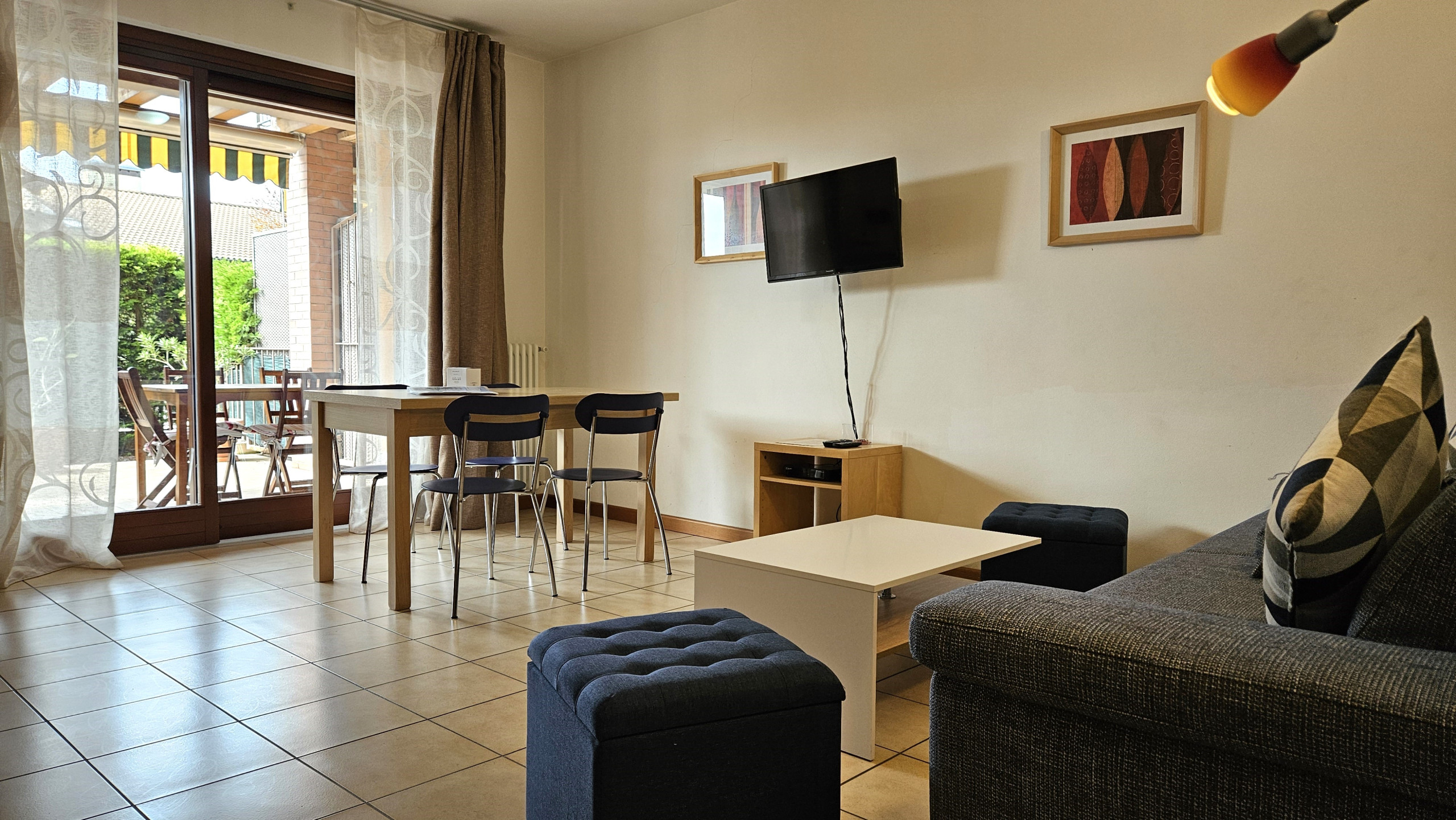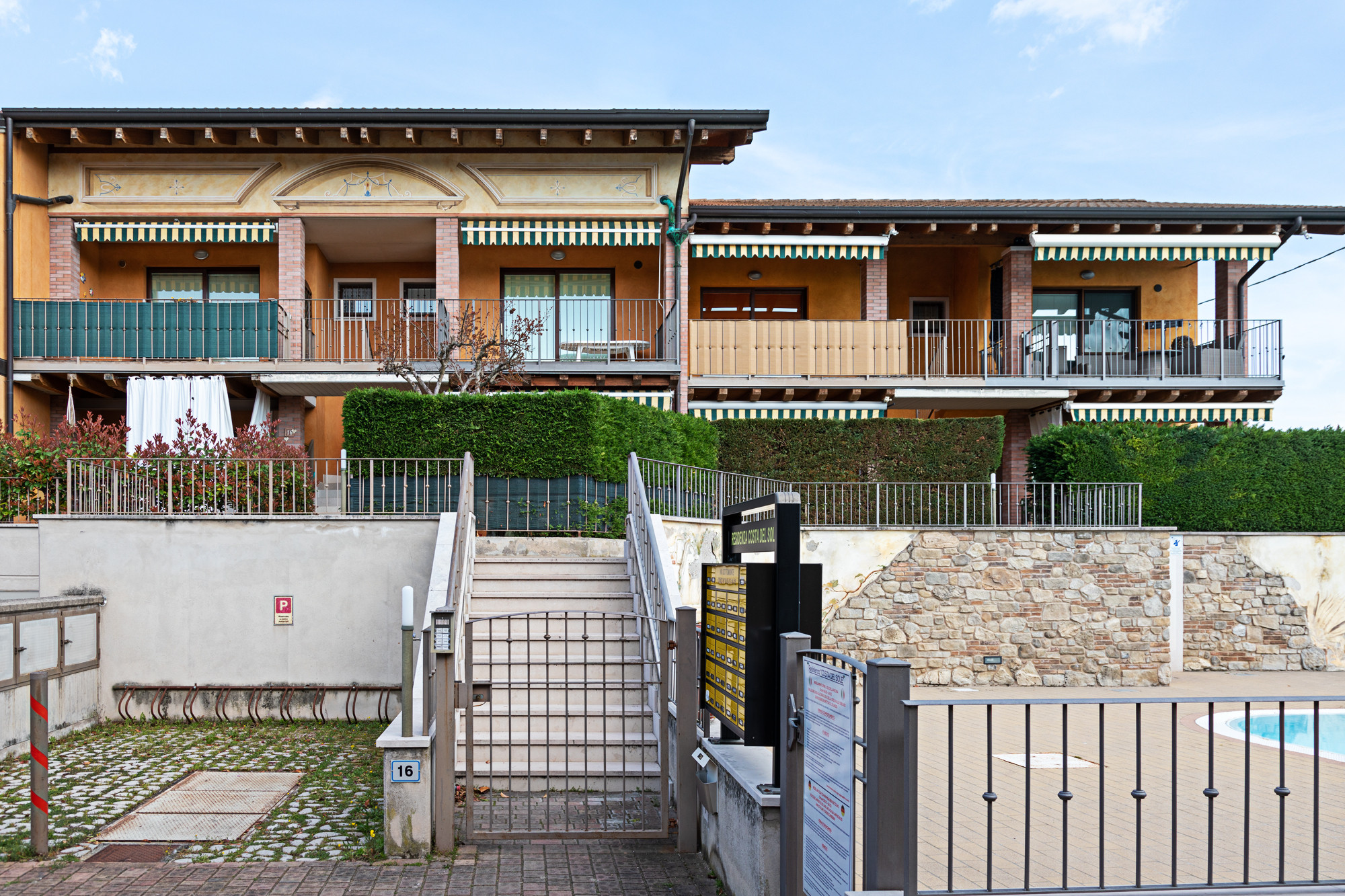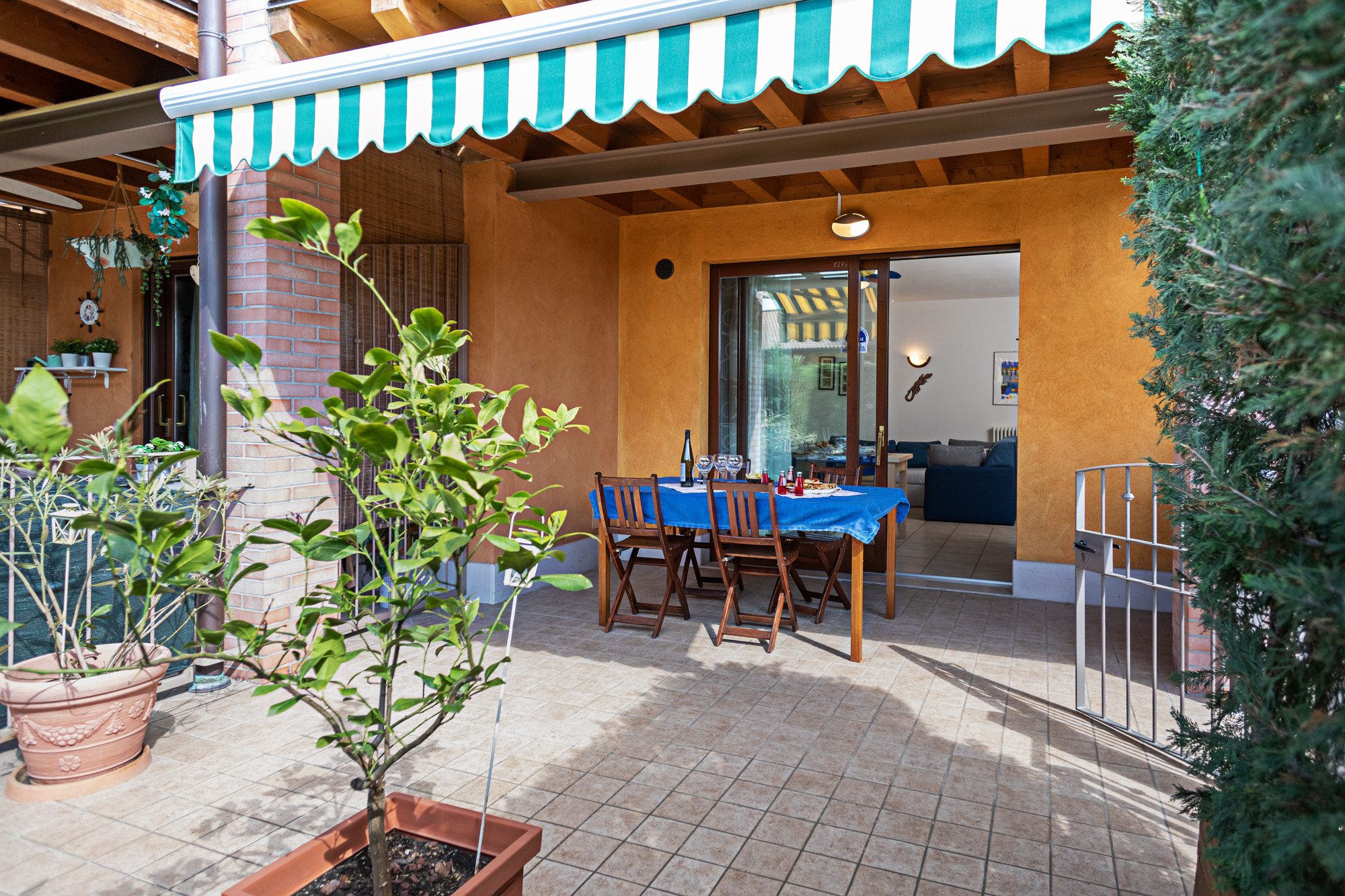 Grazioso appartamento bilocale situato presso il complesso residenziale Gardenia di Lazise, a circa 1.2 km dal centro di Lazise (15 minuti a piedi) e 1.5 km dalla spiaggia. L'intimo contesto residenziale di sole 8 unità, dispone di piscina (periodo di apertura garantito 15/05-30/09) ed ampia zona verde. L'appartamento completamente rinnovato, si apre su un’accogliente zona giorno con vista sulla piscina e sulla terrazza arredata con tavolo, sedie e tenda da sole. Il soggiorno dispone di angolo cottura con frigorifero, congelatore, forno, fornello a gas, lavastoviglie, tostapane, macchina da caffè americano e macchina da caffè a capsule. Angolo relax con tv satellitare, connessione wifi gratuita, aria condizionata e comodo divano letto matrimoniale. Moderno bagno con cabina doccia ed asciugacapelli a disposizione degli ospiti. Spazioso ripostiglio con spogliatoio e dispensa. La camera matrimoniale, con accesso diretto all’ombreggiato giardino posteriore arredato con ombrellone e sdraio, dispone di spazioso guardaroba e letto a baldacchino. Posto auto coperto in garage. Cantina con lavanderia e due biciclette a disposizione degli ospiti. Appartamento per non fumatori, animali domestici non ammessi. Consigliamo questo appartamento a coppie o famiglie che siano alla ricerca di un alloggio moderno, in un piccolo contesto comodo al centro storico di Lazise.
