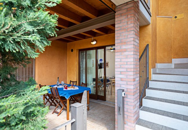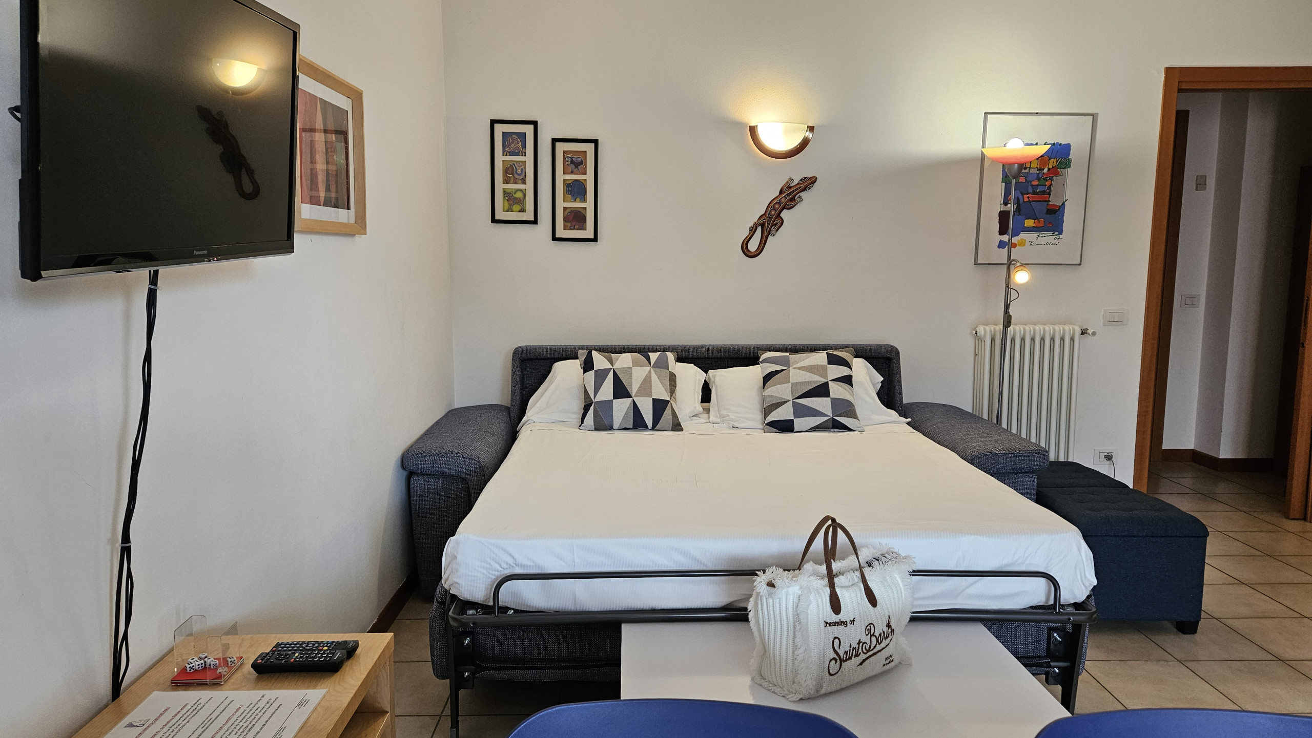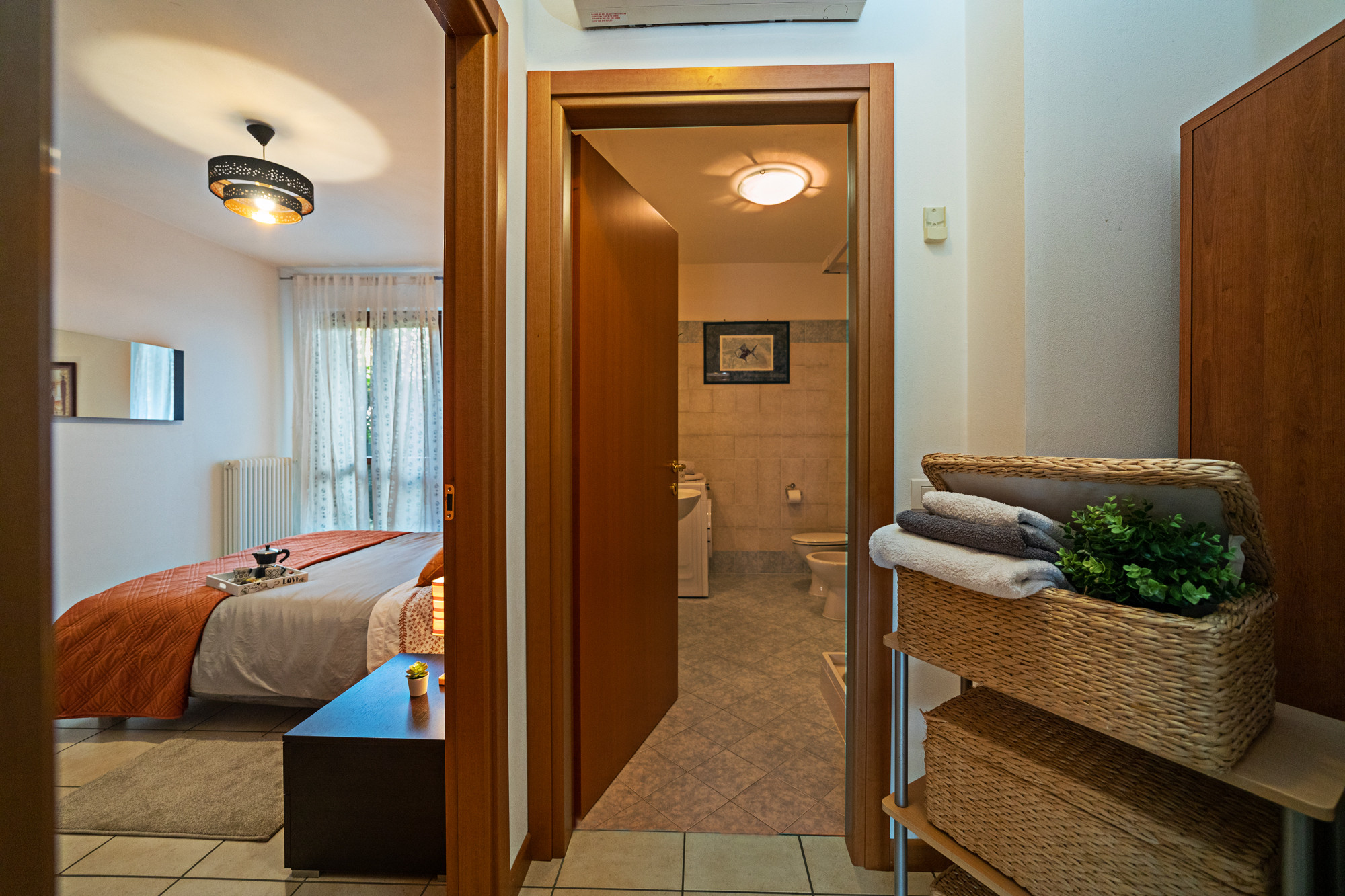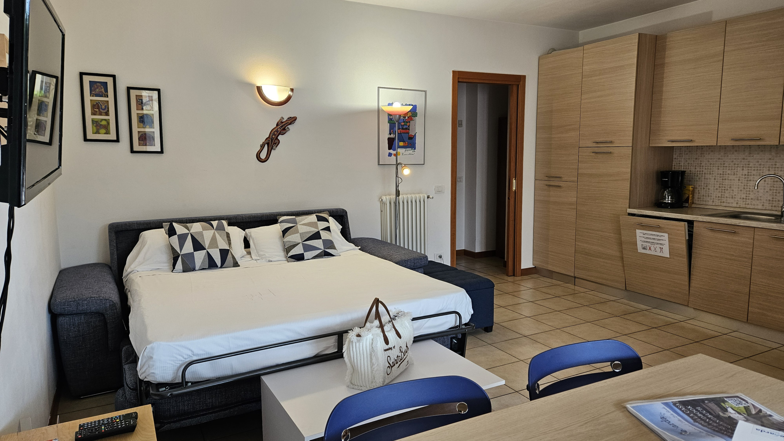 Grazioso appartamento bilocale situato presso il complesso residenziale Gardenia di Lazise, a circa 1.2 km dal centro di Lazise (15 minuti a piedi) e 1.5 km dalla spiaggia. L'intimo contesto residenziale di sole 8 unità, dispone di piscina (periodo di apertura garantito 15/05-30/09) ed ampia zona verde. L'appartamento completamente rinnovato, si apre su un’accogliente zona giorno con vista sulla piscina e sulla terrazza arredata con tavolo, sedie e tenda da sole. Il soggiorno dispone di angolo cottura con frigorifero, congelatore, forno, fornello a gas, lavastoviglie, tostapane, macchina da caffè americano e macchina da caffè a capsule. Angolo relax con tv satellitare, connessione wifi gratuita, aria condizionata e comodo divano letto matrimoniale. Moderno bagno con cabina doccia ed asciugacapelli a disposizione degli ospiti. Spazioso ripostiglio con spogliatoio e dispensa. La camera matrimoniale, con accesso diretto all’ombreggiato giardino posteriore arredato con ombrellone e sdraio, dispone di spazioso guardaroba e letto a baldacchino. Posto auto coperto in garage. Cantina con lavanderia e due biciclette a disposizione degli ospiti. Appartamento per non fumatori, animali domestici non ammessi. Consigliamo questo appartamento a coppie o famiglie che siano alla ricerca di un alloggio moderno, in un piccolo contesto comodo al centro storico di Lazise.
