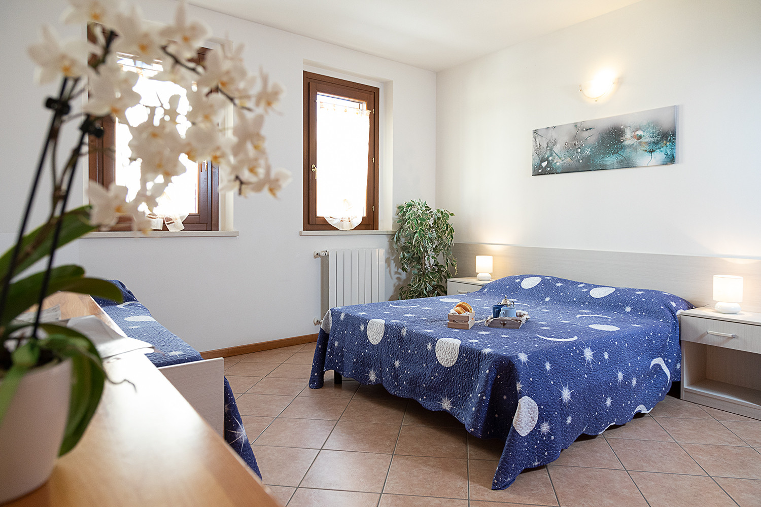 La zona giorno è dotata di angolo cottura completamente attrezzato con frigorifero, fornello a cinque fuochi, forno, forno a microonde, lavastoviglie, macchina da caffè tedesca, tostapane; divano letto doppio, Tv-satellitare ed aria condizionata. Camera con letto matrimoniale ed un letto singolo con 2 finestre ed aria condizionata. Cameretta con due letti singoli con uscita sulla terrazza vista lago, aria condizionata e bagno in camera dotato di doccia, WC, bidet, finestra. Secondo bagno con doccia, wc, bidet, lavatrice, finestra. Animali domestici su richiesta.