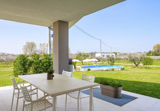 L'appartamento Apple è situato al primo piano all'interno del tranquillo complesso residenziale Vigneti del Garda, a circa 3 km da Lazise e dalla riva del lago, direttamente nel centro della frazione di Colà dove si trovano bar, alcuni ristoranti tipici, un piccolo supermercato e il Parco Termale del Garda. Il complesso residenziale dispone di una piscina per adulti con lettini, una piscina per bambini (date di apertura garantite dal 15.06 - 21.09 con orari esposti all'ingresso della piscina e presenza di bagnino), ping pong e un piccolo parco giochi. L'appartamento con due camere può ospitare 3 adulti o due adulti e due bambini e dispone di una camera da letto con balcone con vista, bagno con cabina doccia e lavatrice, zona soggiorno con divano-letto, TV satellitare, aria condizionata, wifi e una cucina attrezzata con lavastoviglie, frigorifero con congelatore, forno, macchina da caffè, tostapane. Terrazza arredata con tavolo e sedie per pasti all'aperto. Al piano terra, gli ospiti hanno accesso a un piccolo giardino privato con un'area di parcheggio semi-coperta per biciclette. Posto auto privato coperto all'interno del complesso. Piccoli animali ammessi con supplemento. Appartamento per non fumatori.