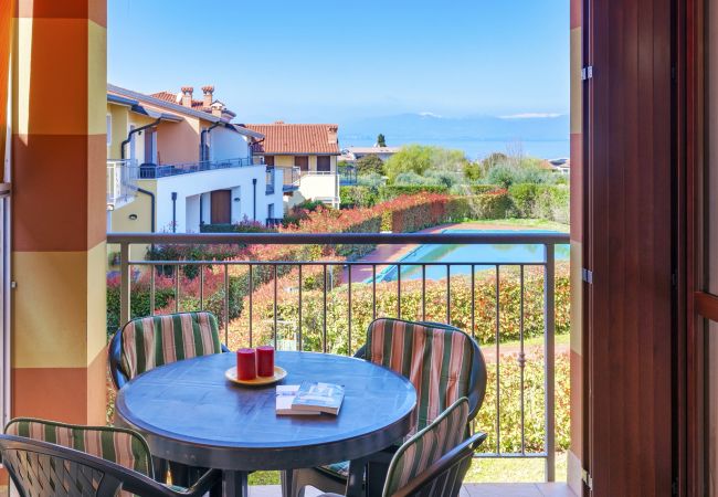 L'appartamento si trova in un piccolo e tranquillo complesso residenziale, può ospitare fino a 5 persone e dispone di una luminosa zona giorno con spaziosa cucina attrezzata con frigorifero, fornello a gas, forno, congelatore, lavastoviglie, stoviglie/posate, utensili da cucina, caffettiera e tostapane. La zona giorno è inoltre dotata di un letto a scomparsa alla francese, un comodo divano, una tv satellitare, wifi e l'aria condizionata. Spaziosa camera da letto matrimoniale, camera con due letti singoli. Bagno finestrato con lavatrice e box doccia. La spaziosa terrazza con meravigliosa vista lago vi accoglierà per cene al tramonto e pranzi all'aperto grazie alla presenza di una comoda tenda da sole. Il complesso residenziale dispone di una graziosa piscina (periodo di apertura garantito 15/05-30/09) e di un verde giardino condominiale. Parcheggio all'aperto vicino alla struttura. Animali non ammessi.