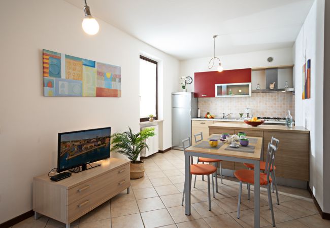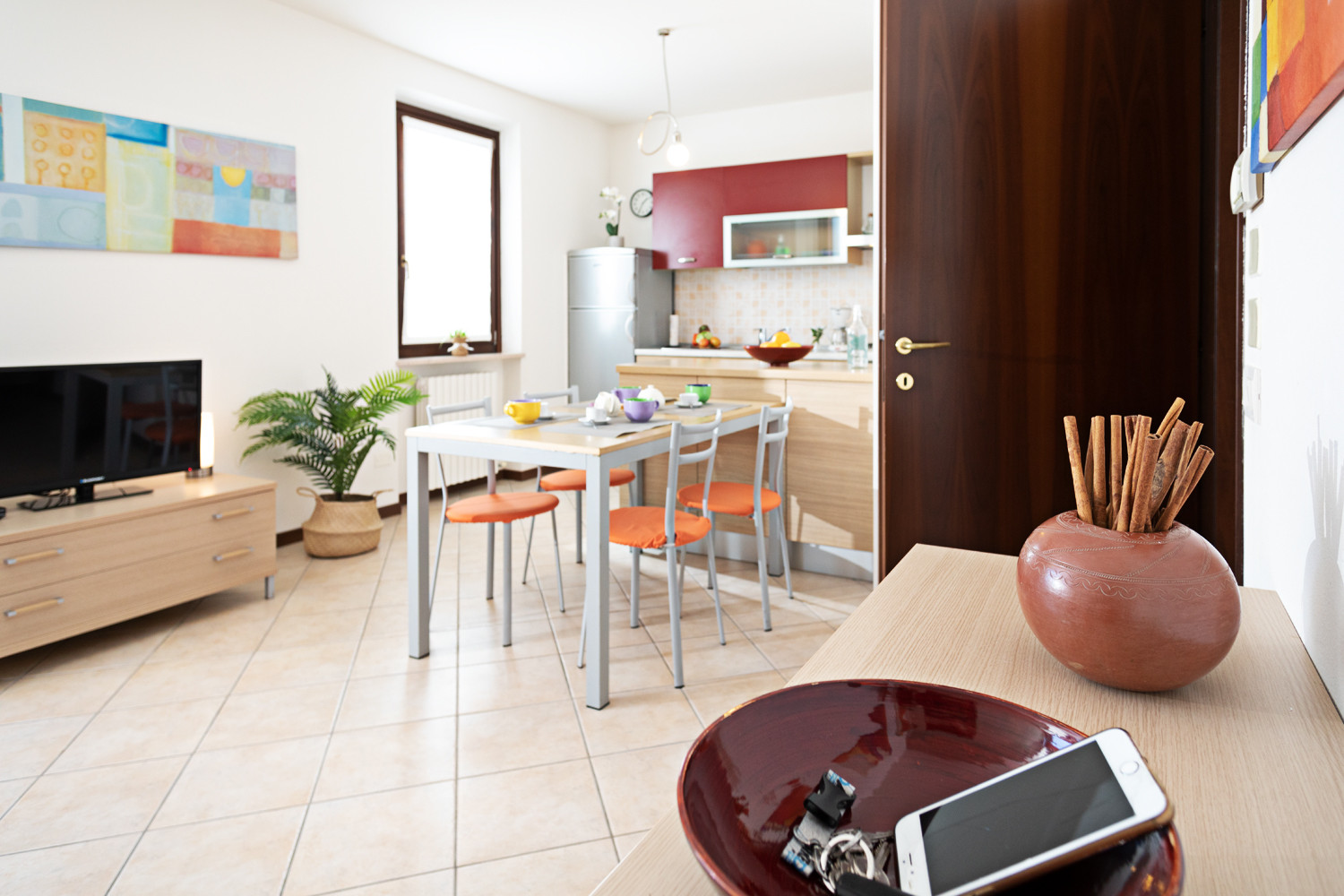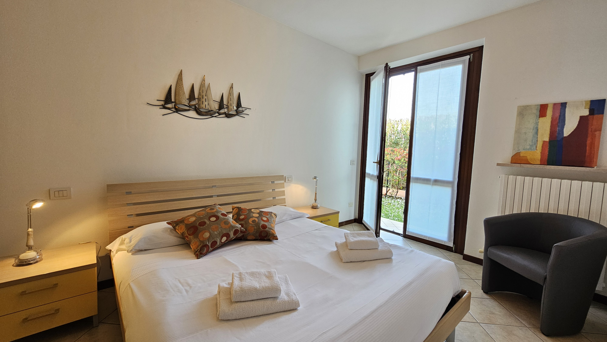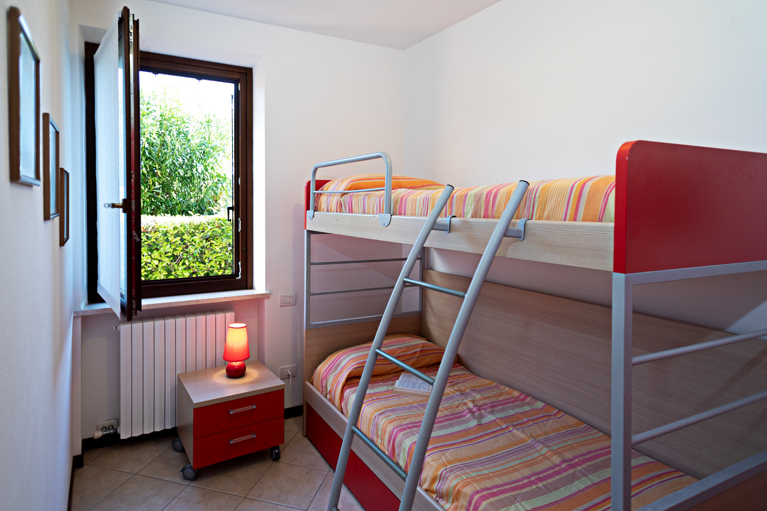 L’appartamento è composto da luminosa zona giorno con angolo cottura con fornello a gas, frigorifero e congelatore, lavastoviglie, forno elettrico/microonde, bollitore, tostapane e macchina da caffè. Tavolo in legno stile country chic adatto ad ospitare fino a 6 persone. Un comodo divano letto matrimoniale (consigliato per un adulto o due bambini) ed una poltrona da lettura completano il soggiorno. Aria condizionata, tv satellitare e wifi a disposizione degli ospiti. Camera matrimoniale con guardaroba, cameretta con letto a castello e guardaroba. Bagno finestrato con cabina doccia e comoda lavatrice. Un posto auto coperto all’interno del complesso a disposizione, manovra di accesso con spazio limitato (larghezza 235 cm, altezza 200 cm, profondità 600 cm). Cantina dove è possibile parcheggiare le biciclette in sicurezza, lettini a disposizione degli ospiti per l’utilizzo in piscina (cuffia obbligatoria - utilizzo della piscina garantito 15/06-15/09 - aperta solo in orari di presenza bagnino 11.00/13.00 e 15.30/19.30). Animali domestici non ammessi, appartamento per non fumatori.