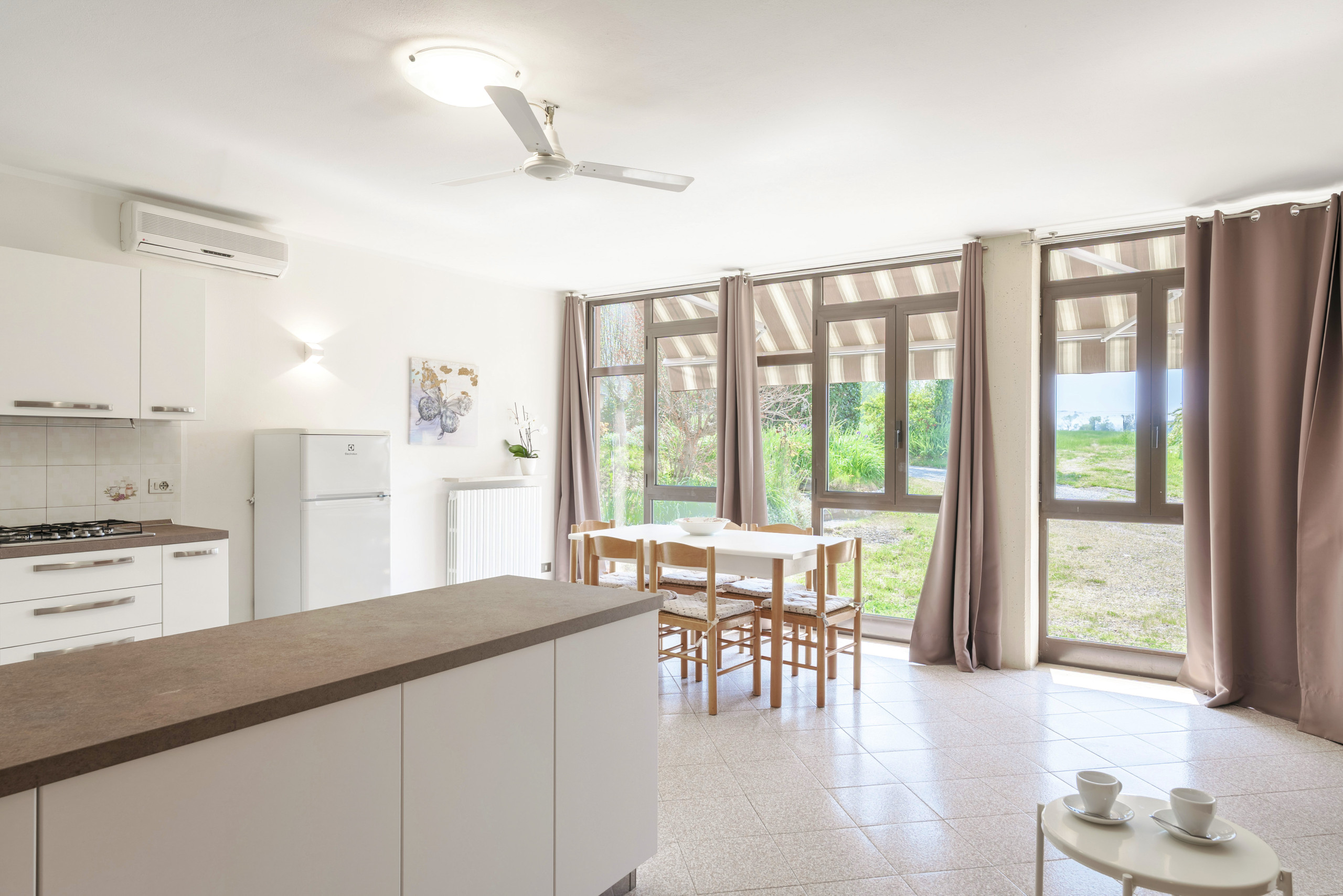 Appartamento trilocale a piano terra composto da una luminosa zona living con nuova cucina attrezzata con frigorifero con congelatore, tavolo e sedie, macchina da caffè, tostapane, piano cottura a 4 fuochi, forno a microonde e lavastoviglie. Divano letto matrimoniale, Sat-Tv, Wi-fi, aria condizionata/riscaldamento. Nuova camera matrimoniale con letto matrimoniale, armadio, cassaforte. Nuova camera con due letti singoli, piccolo armadio. Bagno con finestra, box doccia, bidet e specchio. Accesso diretto al grande giardino arredato con tavoli, sedie e ombrelloni. Suggeriamo questo appartamento a famiglie con bambini o gruppi di amici in cerca di un luogo vicino al lago, in posizione tranquilla con tutti i comfort di un villaggio turistico.