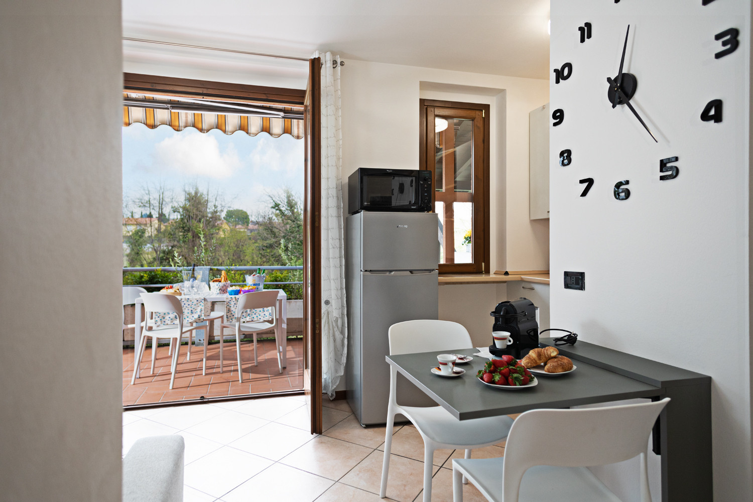 L'appartamento Apple è situato al primo piano all'interno del tranquillo complesso residenziale Vigneti del Garda, a circa 3 km da Lazise e dalla riva del lago, direttamente nel centro della frazione di Colà dove si trovano bar, alcuni ristoranti tipici, un piccolo supermercato e il Parco Termale del Garda. Il complesso residenziale dispone di una piscina per adulti con lettini, una piscina per bambini (date di apertura garantite dal 15.06 - 21.09 con orari esposti all'ingresso della piscina e presenza di bagnino), ping pong e un piccolo parco giochi. L'appartamento con due camere può ospitare 3 adulti o due adulti e due bambini e dispone di una camera da letto con balcone con vista, bagno con cabina doccia e lavatrice, zona soggiorno con divano-letto, TV satellitare, aria condizionata, wifi e una cucina attrezzata con lavastoviglie, frigorifero con congelatore, forno, macchina da caffè, tostapane. Terrazza arredata con tavolo e sedie per pasti all'aperto. Al piano terra, gli ospiti hanno accesso a un piccolo giardino privato con un'area di parcheggio semi-coperta per biciclette. Posto auto privato coperto all'interno del complesso. Piccoli animali ammessi con supplemento. Appartamento per non fumatori.