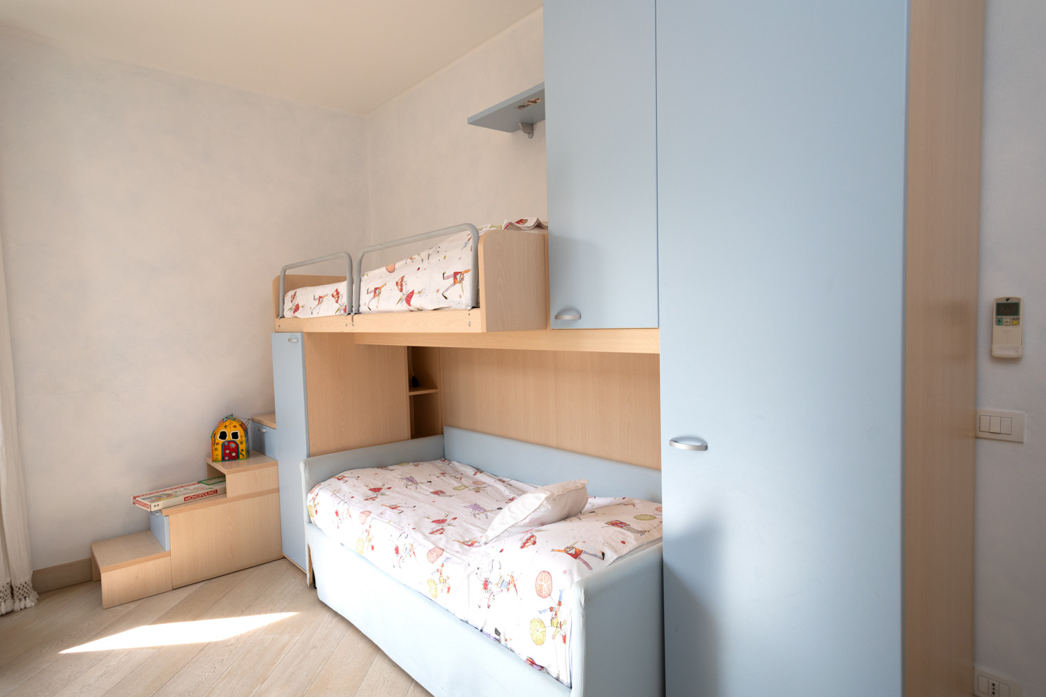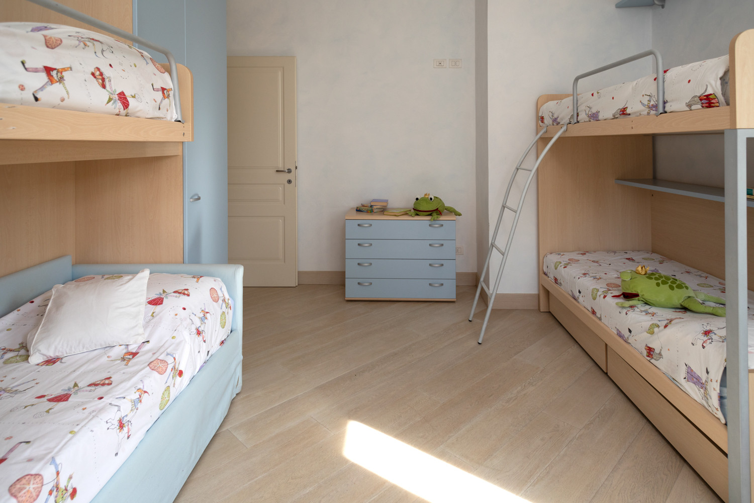 Nella zona notte troviamo tre camere da letto dal gusto classico, arredate con cassettiera o guardaroba. Due di esse dispongono di letto matrimoniale, la terza è ammobiliata con due letti a castello con comoda scaletta in legno (totale 4 posti letto). Due bagni finestrati completi di lavabo, wc, bidet, box doccia, lavatrice completano la zona notte.
