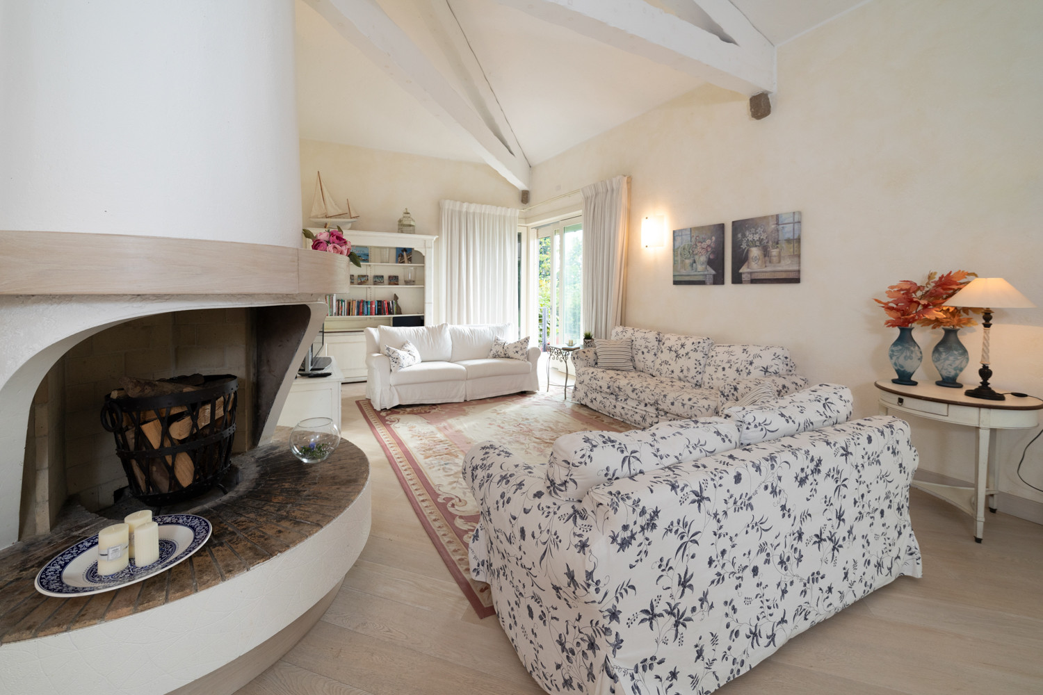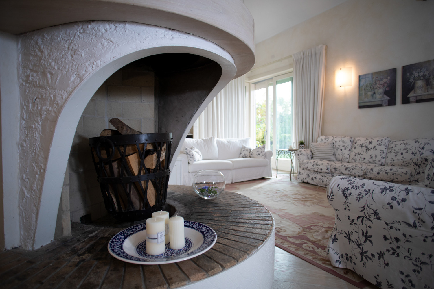 L’ingresso si apre sul salone principale, con caminetto decorativo in pietra (non utilizzabile), tre confortevoli divani, una TV satellitare e una piccola biblioteca che garantiscono momenti di relax per tutta la famiglia. La zona pranzo adiacente, arredata con tavolo in legno massello e 8 posti a sedere offre una vista panoramica sul portico e sul Lago di Garda.