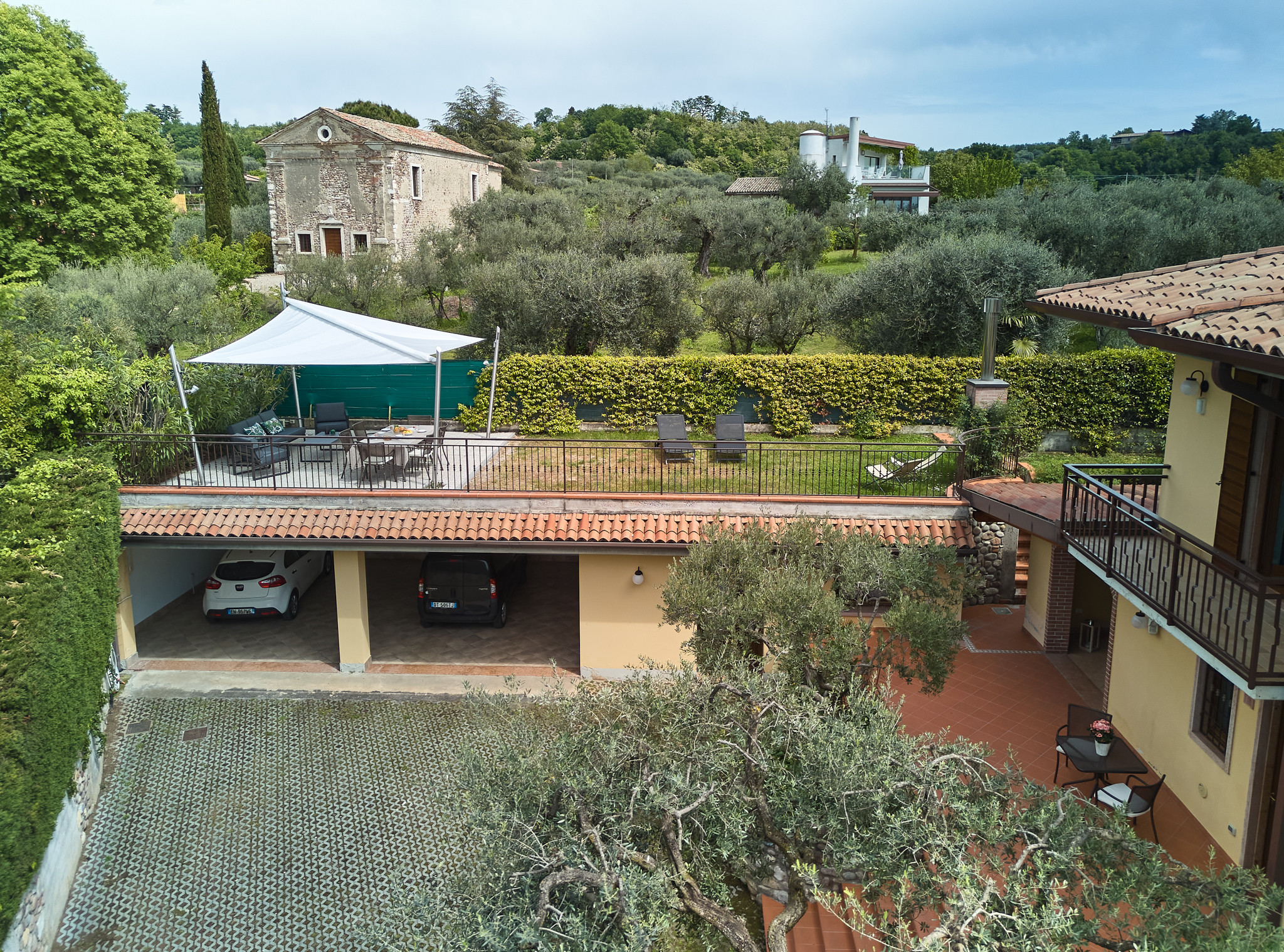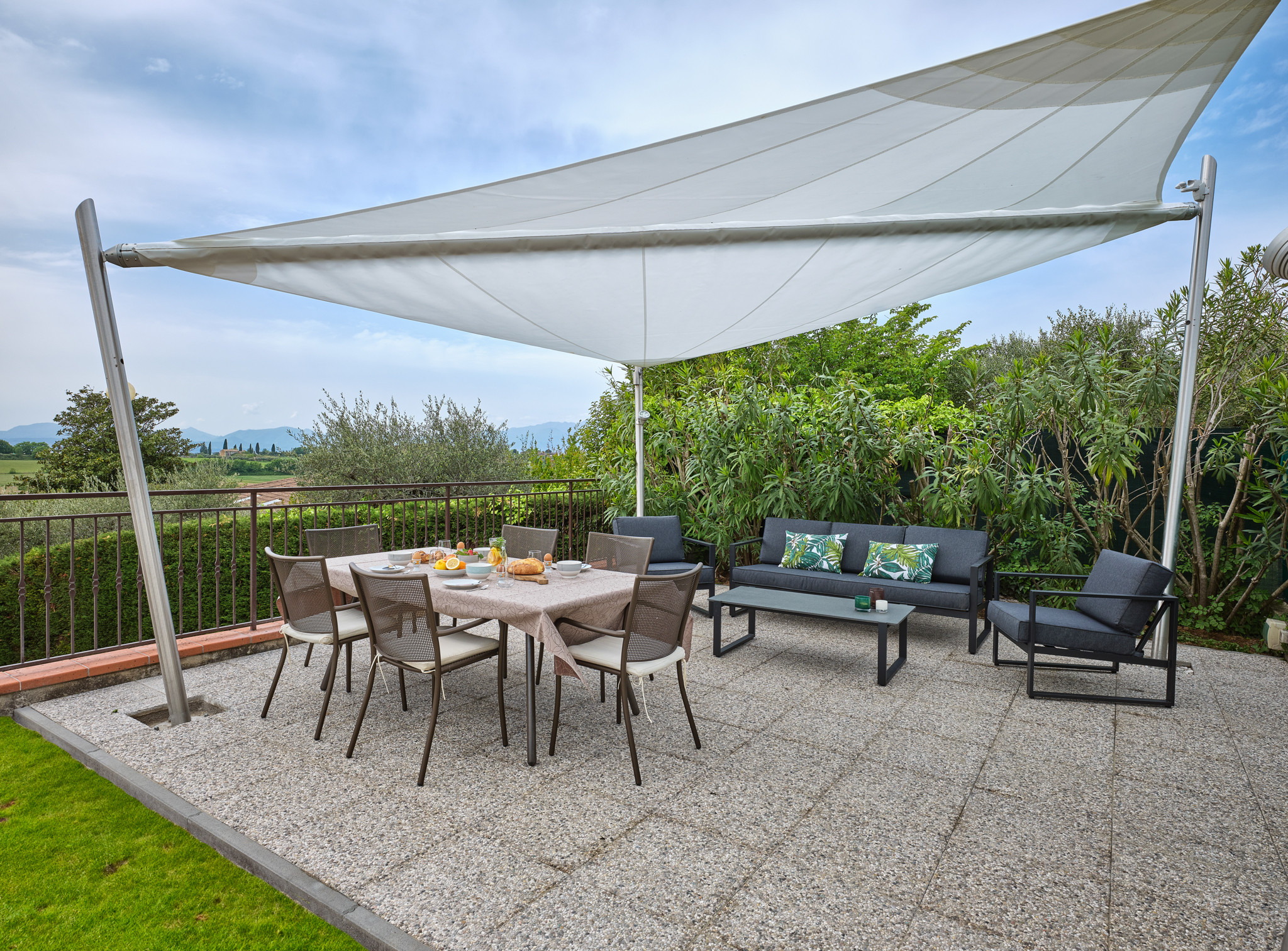 Ampio portico coperto attrezzato con tavolo e sedie. Piscina privata con doccia solare e solarium. Zona lounge all’aperto con splendida vista lago