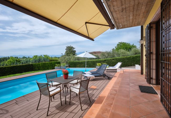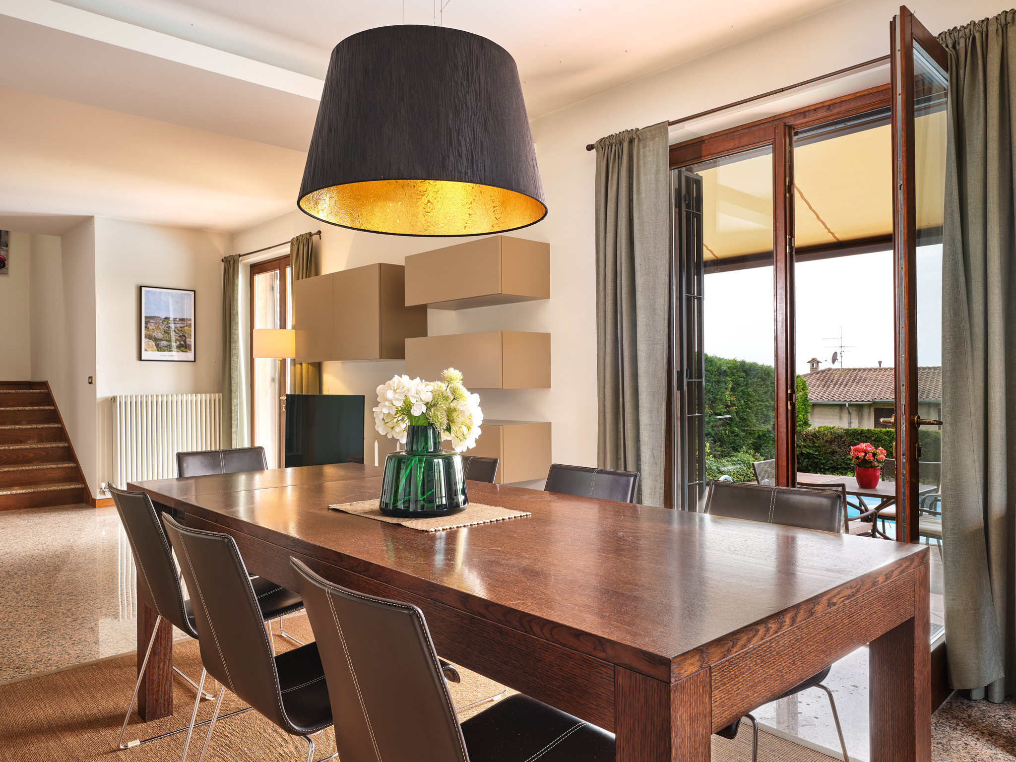 La villa di 170 mq è dislocata su due piani. Il piano terra dispone di ampia zona giorno con vista sulla piscina e sul giardino, con stufa in maiolica e TV (no satellite), cucina separata attrezzata con frigorifero, piano cottura a gas, forno, lavastoviglie, tostapane e macchina da caffè, pentole e stoviglie. Deposito bagagli e ricovero per biciclette elettriche a disposizione degli ospiti. Bagno di servizio con doccia e lavanderia separata con lavatrice.