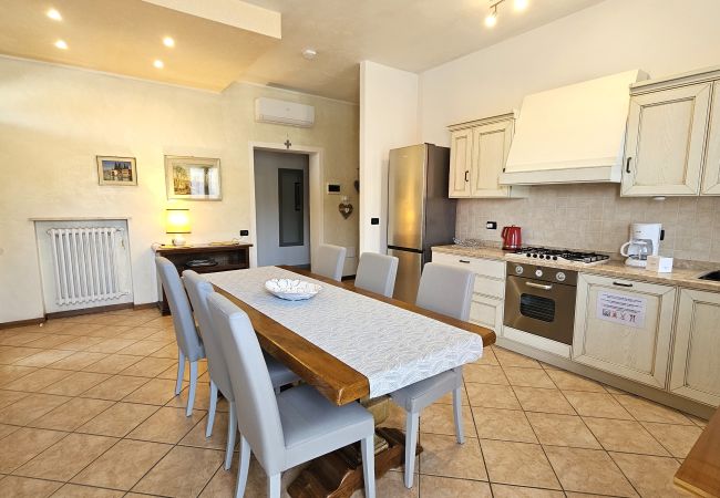 Spaziosa villa indipendente con giardino su quattro lati situata a Lazise ad 1 km dal centro storico (15 minuti a piedi), composta da nuova cucina abitabile con forno, piano cottura, frigorifero, microonde e lavastoviglie. Zona giorno con Tv-satellitare, camino decorativo (non utilizzabile), divano letto matrimoniale, tavolo da pranzo per 8 persone, aria condizionata, wifi. Due camere da letto matrimoniali con armadio e mobili classici in legno, una cameretta con due letti singoli ed armadio, bagno finestrato con cabina doccia e lavatrice, secondo bagno con cabina doccia. Grande terrazza coperta attrezzata con tavolo e sedie per rilassanti cene all’aperto. Grande giardino, piccolo barbecue, sdraio e portico arredato con piccolo salottino a disposizione. Parcheggio auto scoperto all’interno della proprietà. Animali non ammessi.