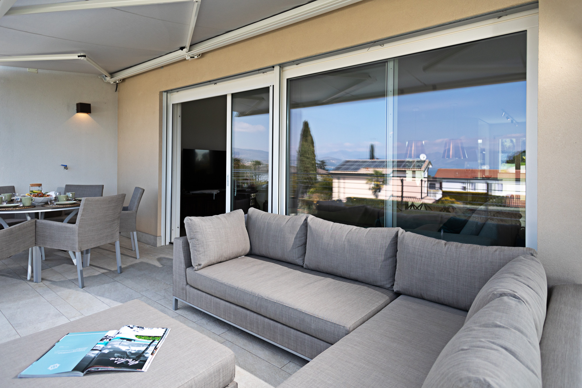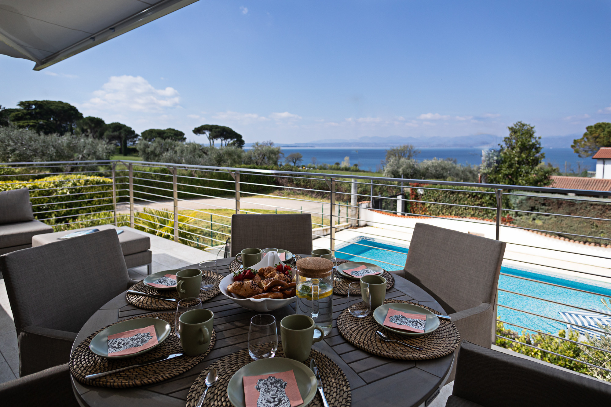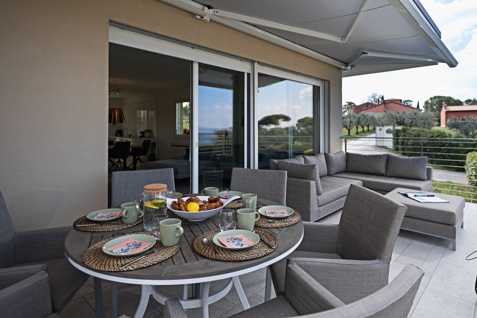 Al primo piano di Villa Julia, l'area living presenta una cucina completamente attrezzata con elettrodomestici di alta qualità Miele come piano a induzione con cappa Bora, forno, forno a vapore, lavastoviglie, frigorifero con congelatore, cantina vini, macchina da caffè e tostapane. Il soggiorno con vista panoramica sull'area della piscina e sulla costa meridionale del Lago di Garda è arredato con un ampio divano e una smart TV. L'area pranzo con un tavolo in legno naturale può ospitare fino a 8 persone. Attraverso la porta scorrevole con grandi finestre si accede alla terrazza con tenda da sole elettrica arredata con un'area relax e un tavolo per piacevoli colazioni all'aperto. Un terzo bagno finestrato completo si trova al primo piano ed è dotato di una comoda lavatrice-asciugatrice per l'uso degli ospiti.