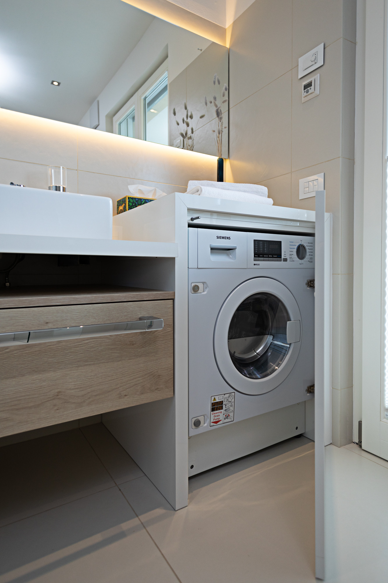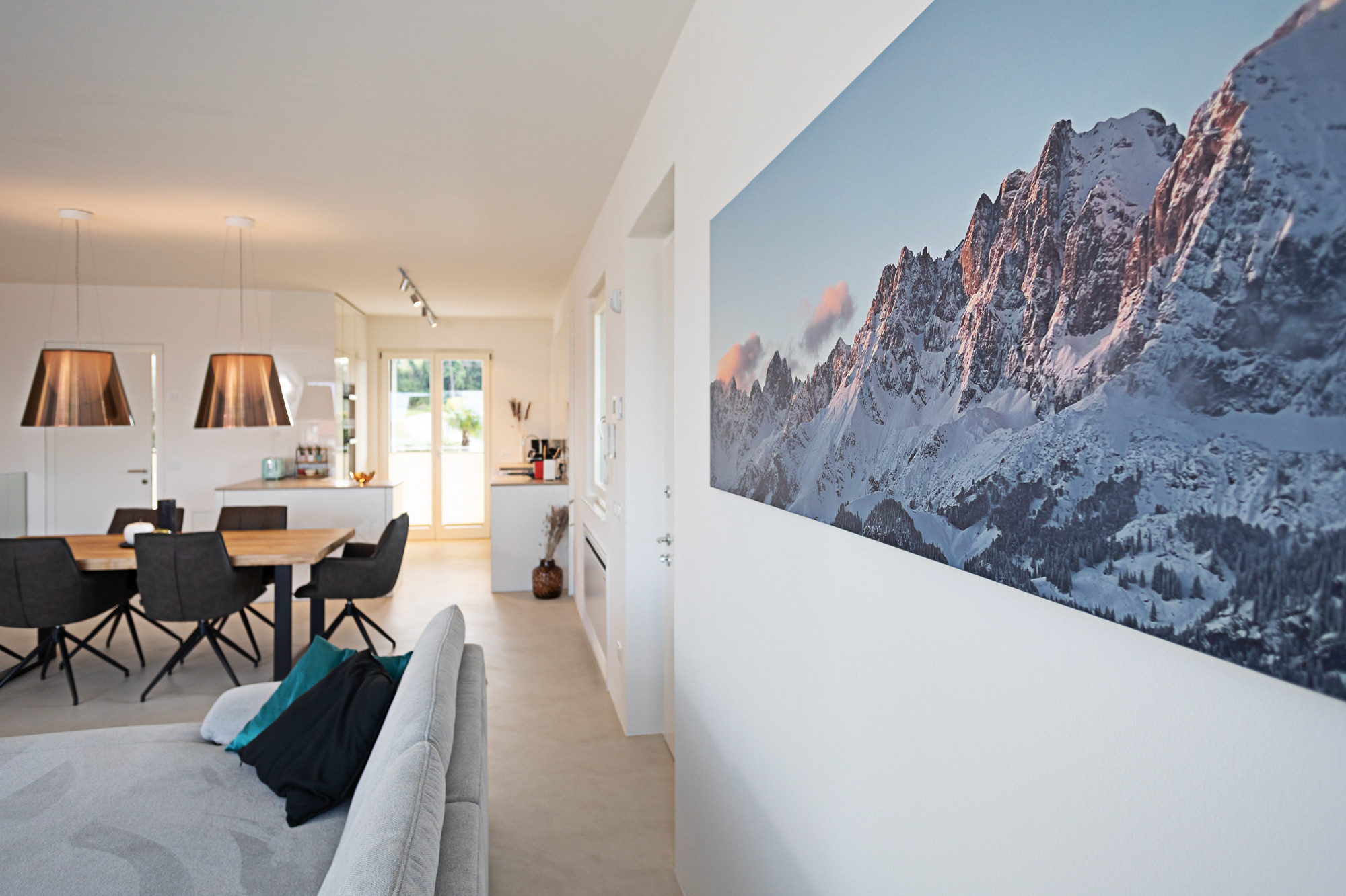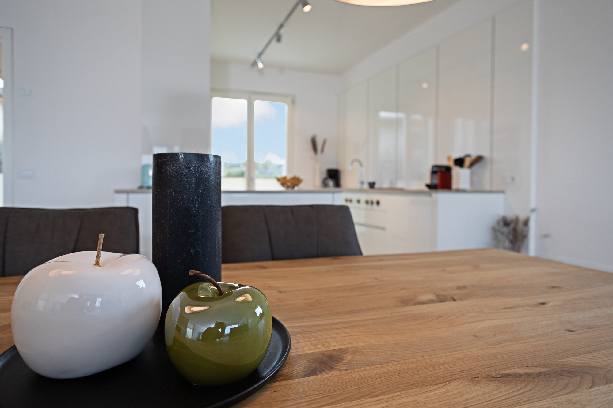 Al primo piano di Villa Julia, l'area living presenta una cucina completamente attrezzata con elettrodomestici di alta qualità Miele come piano a induzione con cappa Bora, forno, forno a vapore, lavastoviglie, frigorifero con congelatore, cantina vini, macchina da caffè e tostapane. Il soggiorno con vista panoramica sull'area della piscina e sulla costa meridionale del Lago di Garda è arredato con un ampio divano e una smart TV. L'area pranzo con un tavolo in legno naturale può ospitare fino a 8 persone. Attraverso la porta scorrevole con grandi finestre si accede alla terrazza con tenda da sole elettrica arredata con un'area relax e un tavolo per piacevoli colazioni all'aperto. Un terzo bagno finestrato completo si trova al primo piano ed è dotato di una comoda lavatrice-asciugatrice per l'uso degli ospiti.