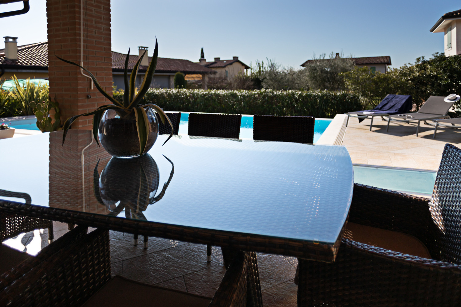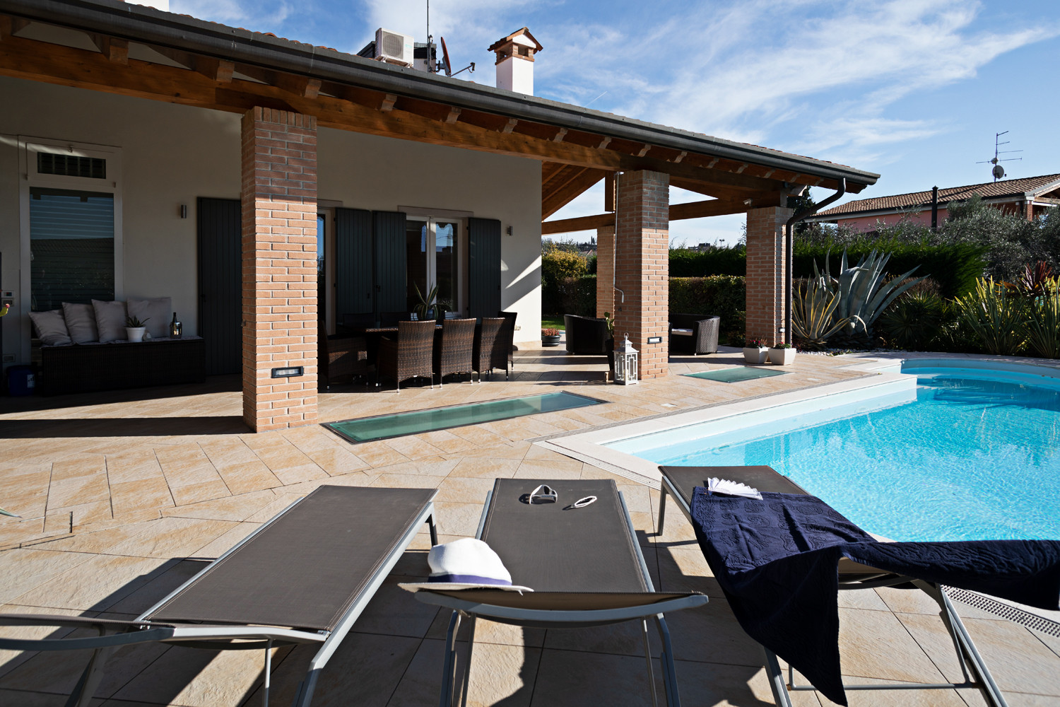 Due porte finestre permettono l’affaccio sul curatissimo giardino e sull’ampio portico coperto dotato di camino per organizzare indimenticabili barbecue a bordo piscina. Il patio è arredato con tavolo per 8 persone e zona relax con divanetto e poltroncine. A disposizione degli ospiti 3 sdraio, una comodissima doccia esterna, piscina privata di 8x4 metri con zona idromassaggio. Dal giardino si gode anche di uno scorcio di vista lago, che nelle giornate estive regala tramonti mozzafiato.