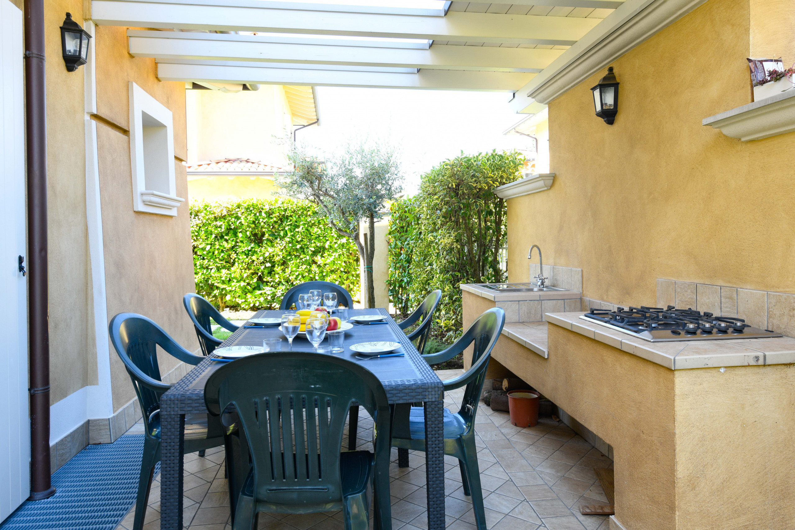 La proprietà è circondata da un ampio spazio esterno privato allestito con tavolo, lettini, cucina esterna e divanetti situati a bordo della piscina.