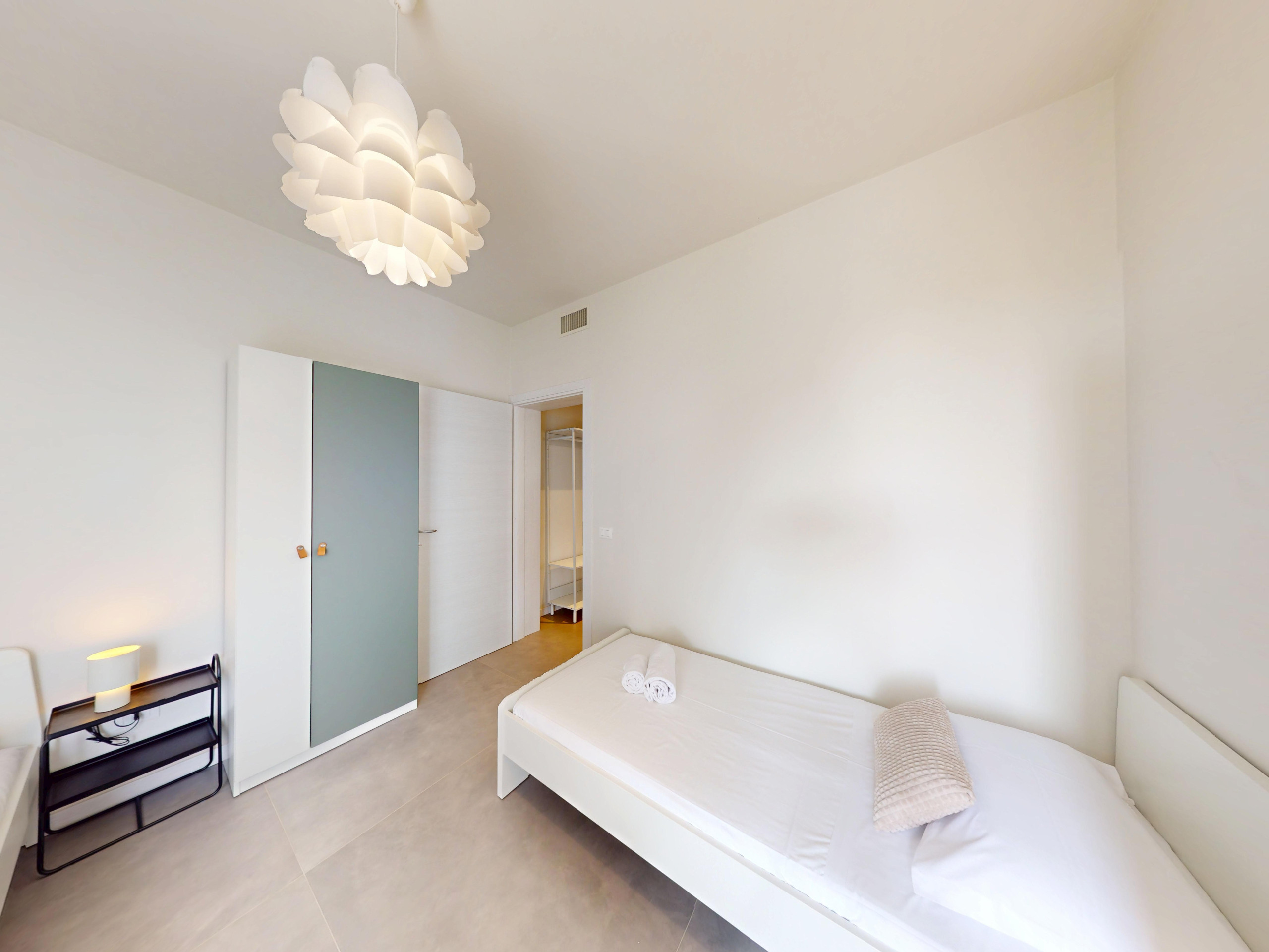 Die Wohnung verfügt über zwei sorgfältig eingerichtete Schlafzimmer mit einer Kombination von Betten, die ein Kingsize-Bett, ein Schlafsofa und zwei Einzelbetten umfasst. Diese flexible Anordnung gewährleistet Komfort und Privatsphäre für alle Gäste.