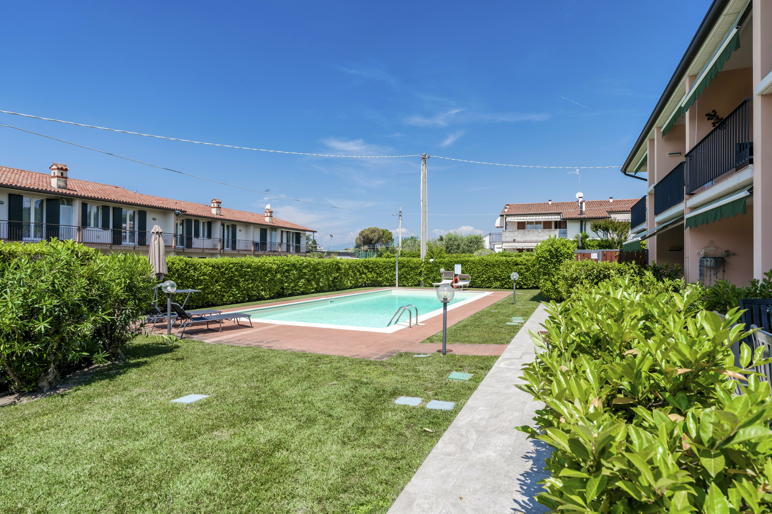 Charmante Zwei-Zimmer-Wohnung, die sich im Wohnkomplex Gardenia in Lazise befindet, etwa 1,2 km vom Zentrum von Lazise (15 Gehminuten) und 1,5 km vom Strand entfernt. Der intime Wohnkomplex mit nur 8 Einheiten verfügt über einen Swimmingpool (Öffnungszeit garantiert vom 15.05.-30.09.) und eine große Grünfläche. Die vollständig renovierte Wohnung öffnet sich zu einem einladenden Wohnbereich mit Blick auf den Pool und die Terrasse, die mit Tisch, Stühlen und Sonnensegel ausgestattet ist. Der Wohnbereich verfügt über eine Küchenzeile mit Kühlschrank, Gefrierschrank, Backofen, Gasherd, Geschirrspüler, Toaster, Kaffeemaschine und Kapselmaschine. Relaxecke mit Satelliten-TV, kostenlosem WLAN, Klimaanlage und bequemem Doppelbettsofa. Modernes Badezimmer mit Duschkabine und Haartrockner für Gäste. Geräumiger Abstellraum mit Umkleidekabine und Vorratskammer. Das Schlafzimmer mit direktem Zugang zum schattigen Hinterhofgarten, ausgestattet mit Sonnenschirm und Liegestuhl, verfügt über einen geräumigen Kleiderschrank und ein Himmelbett. Überdachter Parkplatz in der Garage. Kellerraum mit Waschmaschine und zwei Fahrrädern für Gäste. Nichtraucherwohnung, Haustiere nicht erlaubt. Wir empfehlen diese Wohnung Paaren oder Familien, die eine moderne Unterkunft in einem kleinen Komplex in der Nähe des historischen Zentrums von Lazise suchen.
