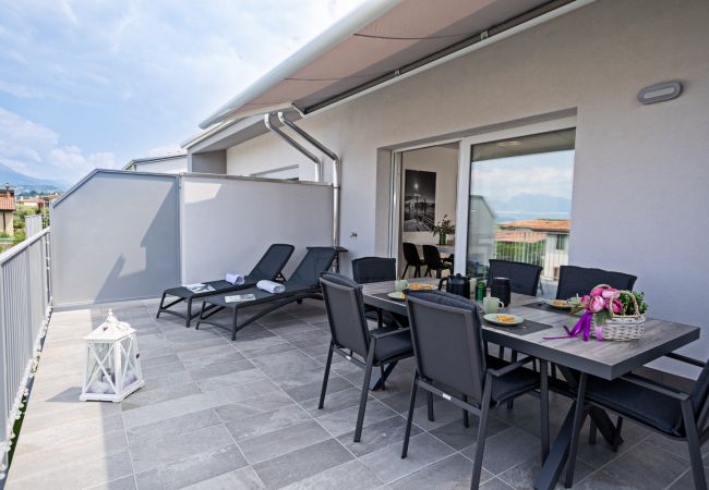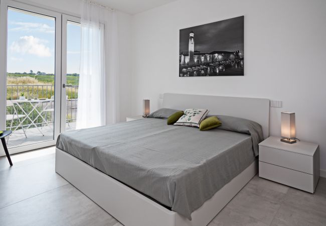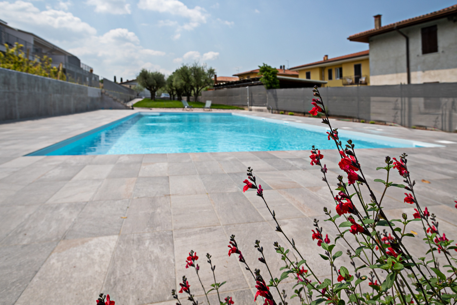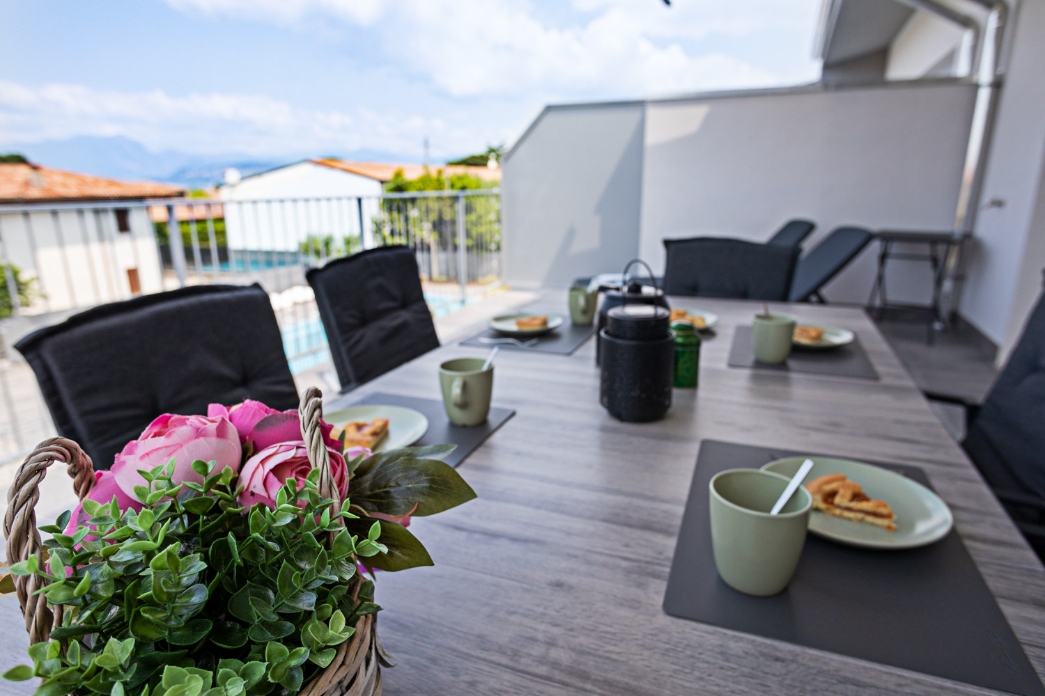 Die Aufmerksamkeit der Gäste wird sofort von der großen Terrasse mit teilweisem Seeblick auf sich gezogen, perfekt, um gesellige Momente zu verbringen und die Urlaubstage in vollen Zügen zu genießen. Die Terrasse ist mit Tisch, Stühlen, Liegestühlen und Markise ausgestattet. Das Apartment Casa Erika befindet sich im ersten Stock und bietet Platz für bis zu 6 Personen. Es verfügt über einen hellen Wohnbereich mit einer modernen Küche, die mit einem Induktionsherd, einem Kühlschrank, einem Gefrierschrank, einem Backofen, einem Geschirrspüler, einer Kaffeemaschine, einem Wasserkocher und einem Toaster ausgestattet ist. Das warme Wohnzimmer ist mit besonderer Liebe zum Detail eingerichtet, es gibt ein bequemes Schlafsofa (empfohlen für einen Erwachsenen oder zwei Kinder), Sat-TV. Die Wohnung verfügt über zwei Doppelschlafzimmer mit Schränken und Balkonen. Fensterbad mit Duschkabine, Technikraum mit Waschmaschine. Klimaanlage in jedem Zimmer und WLAN für die Gäste verfügbar. Der Komplex bietet einen schönen Swimmingpool mit Sonnenterrasse (garantierte Öffnungszeiten 15/05-30/09) und einen Garten im Schatten von Olivenbäumen. Ein Parkplatz im Freien steht den Gästen zur Verfügung.