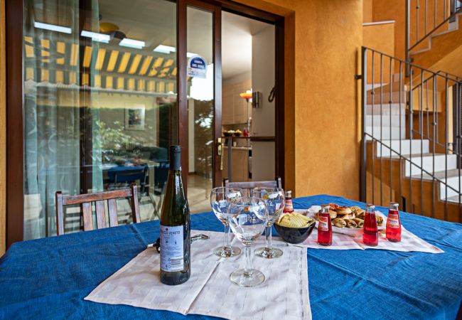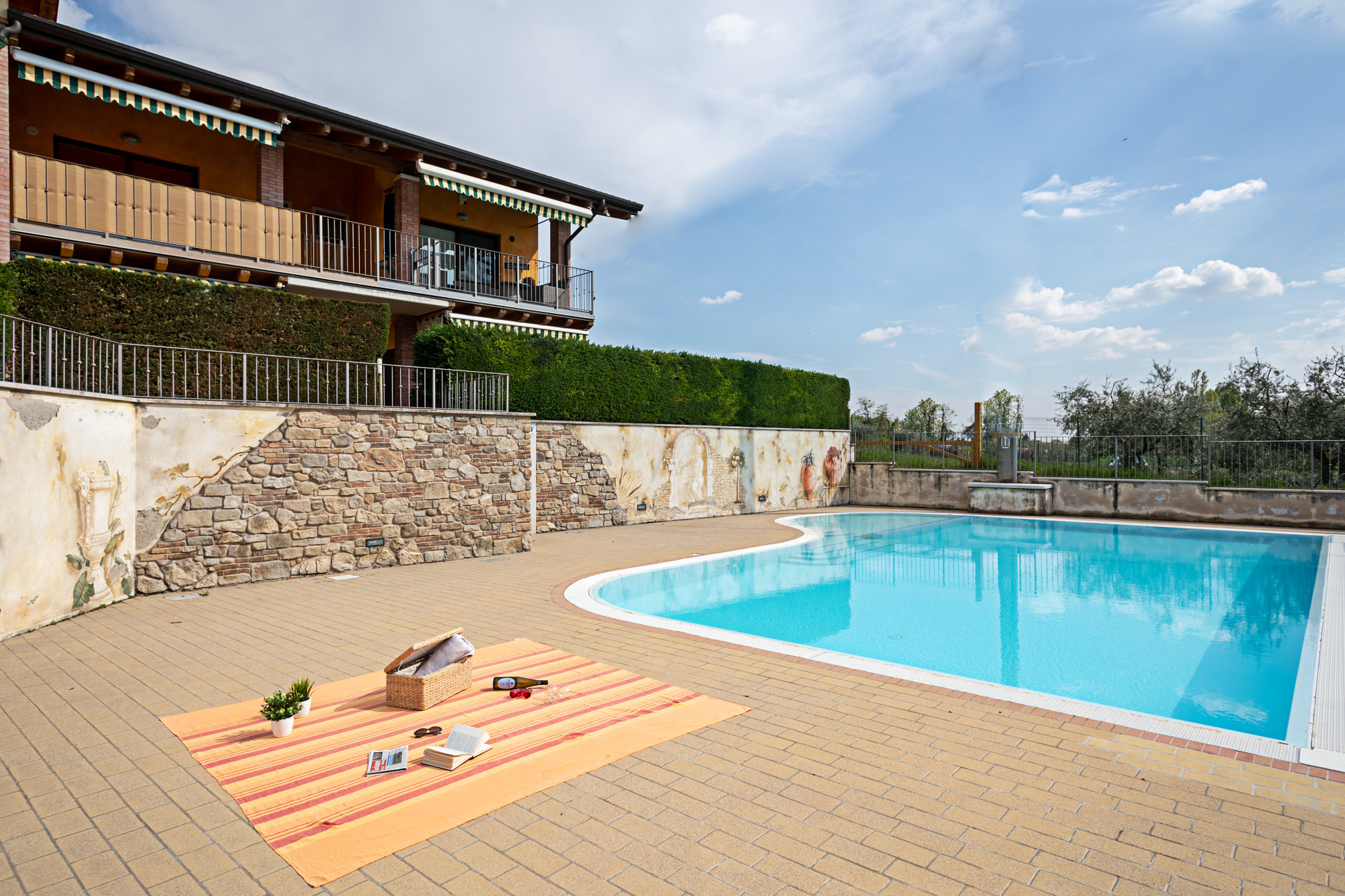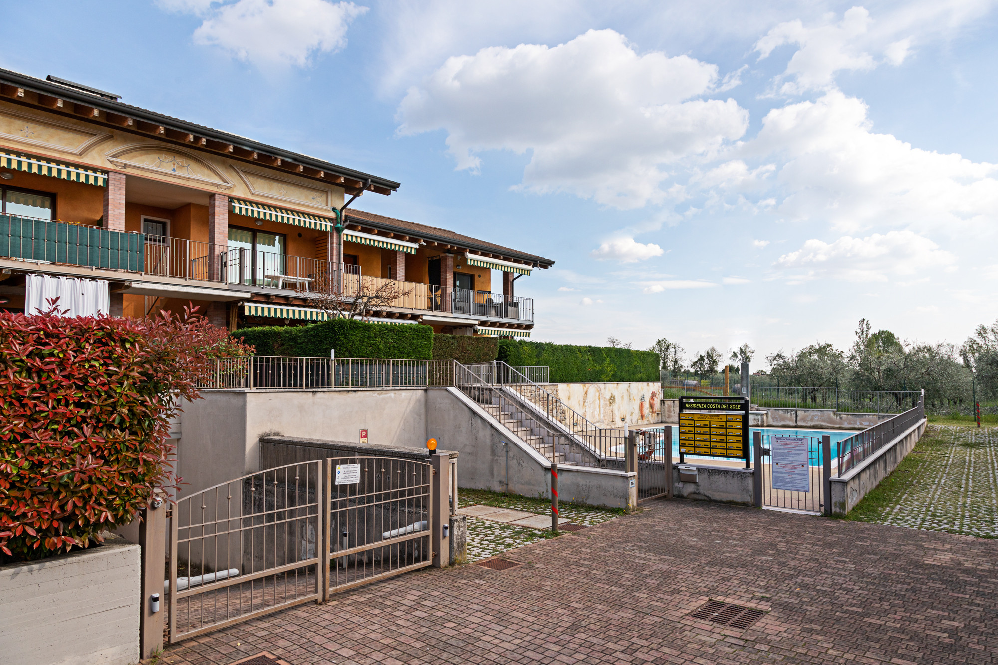 Die Apple-Wohnung befindet sich im ersten Stock innerhalb des ruhigen Wohnkomplexes Vigneti del Garda, etwa 3 km von Lazise und dem Seeufer entfernt, direkt im Zentrum der Fraktion Colà, wo sich Bars, einige typische Restaurants, ein kleiner Supermarkt und der Garda-Thermalbadepark befinden. Der Wohnkomplex verfügt über einen Erwachsenenpool mit Liegen, einen Kinderpool (Öffnungszeiten garantiert vom 15.06. - 21.09. mit ausgehängten Öffnungszeiten und Anwesenheit eines Rettungsschwimmers), Tischtennis und einen kleinen Kinderspielplatz. Die Zweizimmerwohnung kann 3 Erwachsene oder zwei Erwachsene und zwei Kinder aufnehmen und verfügt über ein Schlafzimmer mit Balkon und Aussicht, ein Badezimmer mit Duschkabine und Waschmaschine, einen Wohnbereich mit Schlafsofa, Satelliten-TV, Klimaanlage, WLAN und eine Küche mit Geschirrspüler, Kühlschrank mit Gefrierfach, Ofen, Kaffeemaschine, Toaster. Möblierte Terrasse mit Tisch und Stühlen für Mahlzeiten im Freien. Im Erdgeschoss haben die Gäste Zugang zu einem kleinen privaten Garten mit einem teilweise überdachten Fahrradabstellbereich. Überdachter privater Parkplatz innerhalb des Komplexes.