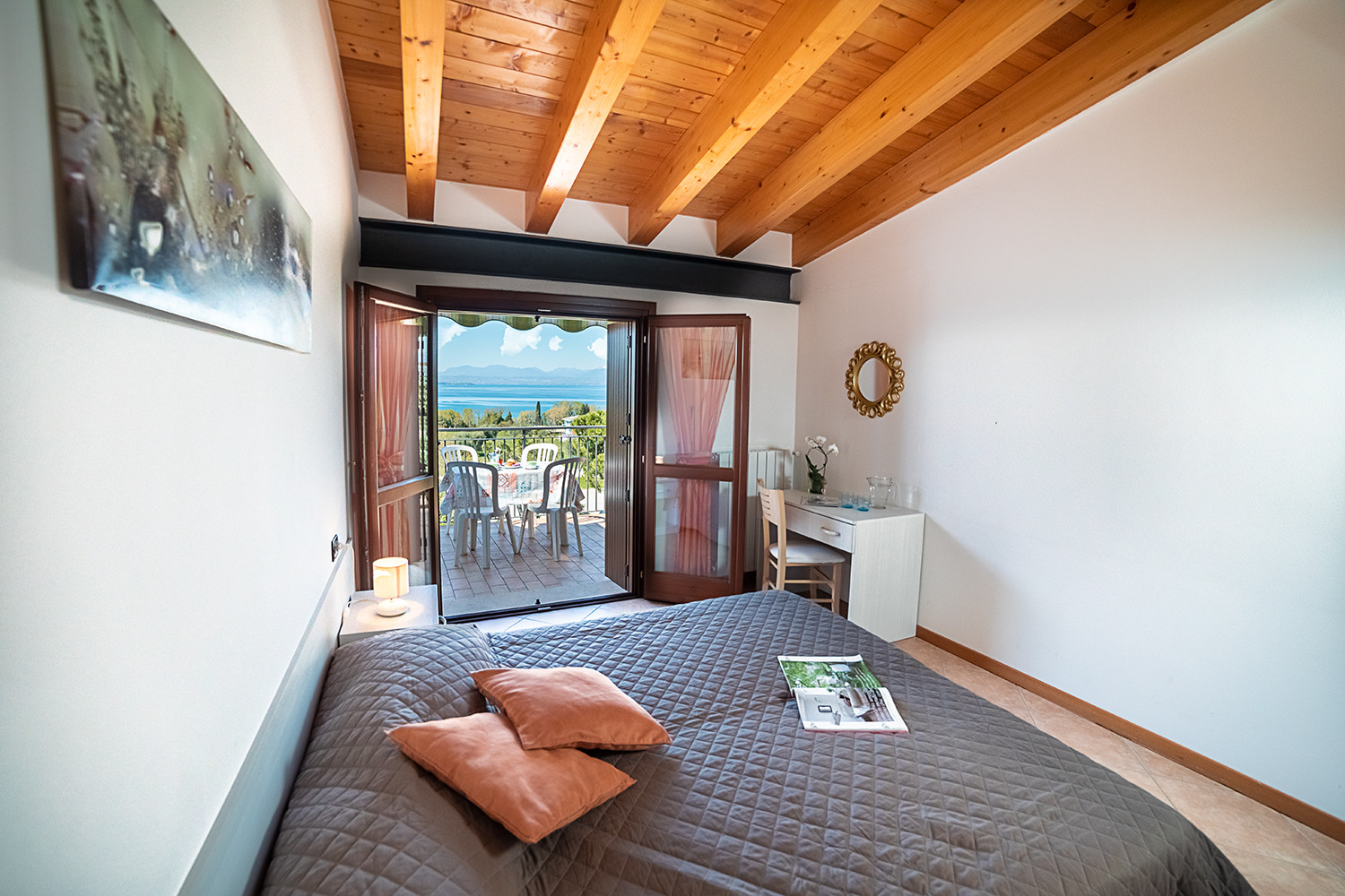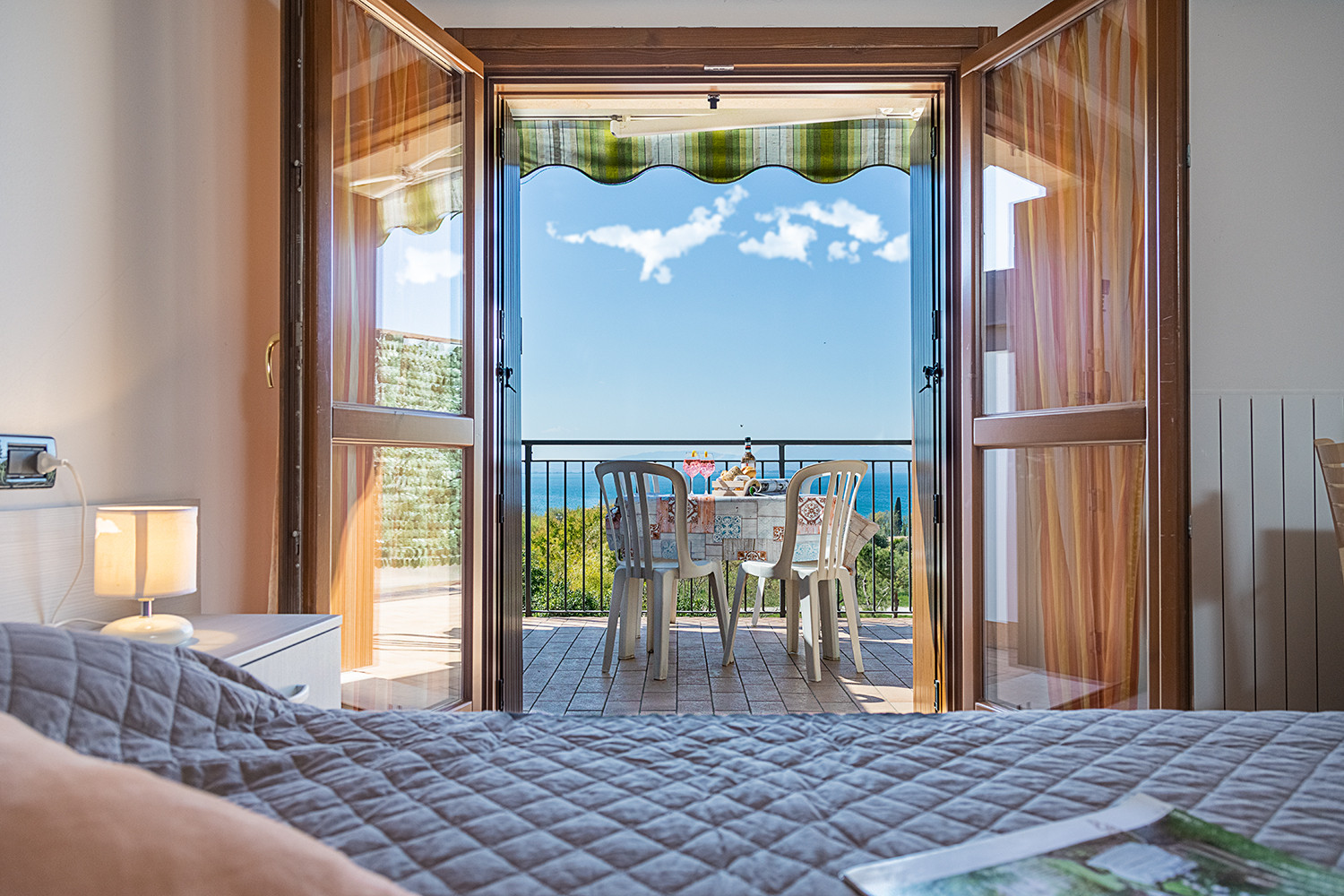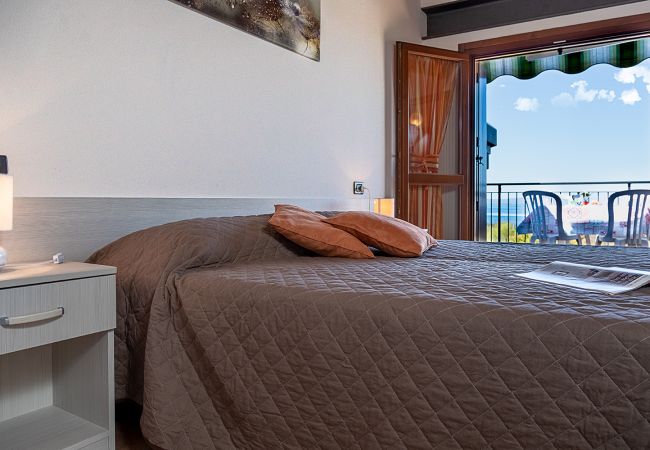 Die Wohnung liegt in einer kleinen und ruhigen Wohnanlage, bietet Platz für bis zu 5 Personen und verfügt über einen hellen Wohnbereich mit einer geräumige Küche, die mit Kühlschrank, Gasherd, Backofen, Gefrierschrank, Spülmaschine, Geschirr/Besteck, Kochutensilien, Kaffeemaschine und Toaster komplett ausgestattet ist. Der Wohnbereich verfügt über einem ausklappbaren französischen Bett, einem bequemen Sofa, Sat-TV, WLan und Klimaanlage. Geräumiges Schlafzimmer mit Doppelbett, zweites Schlafzimmer mit zwei Einzelbetten. Badezimmer mit Fenster, Waschmaschine und Dusche.Die geräumige Terrasse mit herrlichem Blick auf den See lädt dank einer komfortablen Markise zum Abendessen bei Sonnenuntergang und zum Essen im Freien ein. Die Wohnanlage verfügt über einen schönen Swimmingpool (garantierte Öffnungsperiode 15/05-30/09) und einen Garten zur gemeinsamen Nutzung. Öffentlicher Parkplatz in der Nähe der Unterkunft. Nicht-Raucher Wohnung. Tiere nicht erlaubt.