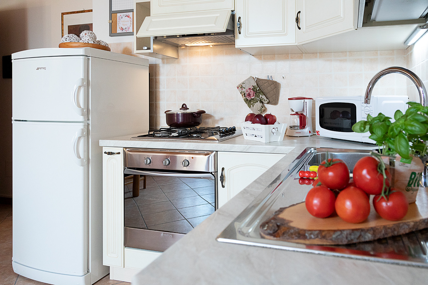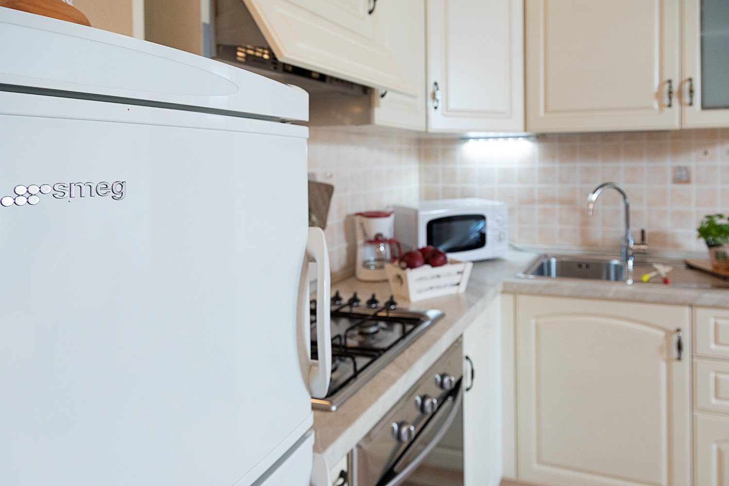 Die Wohnung verfügt über eine Küchenzeile mit Gasherd mit vier Kochstellen, Mikrowelle, Wasserkocher, Toaster, deutscher Kaffeemaschine, Kühlschrank mit Gefrierfach, Tisch mit 4 Stühlen. Satelliten-TV und Klimaanlage sind im Preis inbegriffen. Der Schlafbereich besteht aus einem geräumigen Doppelzimmer im klassischen Stil mit großem Kleiderschrank und Kommode sowie einem hübschen Kinderzimmer mit Etagenbett und Kleiderschrank. Beide Schlafzimmer verfügen über eine Tür-Fenster-Kombination, die einen direkten Blick auf den grünen Garten ermöglicht. Badezimmer mit Fenster, Duschkabine, Haartrockner und Waschmaschine für die Gäste. Reservierter Parkplatz in der Garage. Nichtraucherwohnung. Kleine Haustiere nach Anfrage erlaubt.