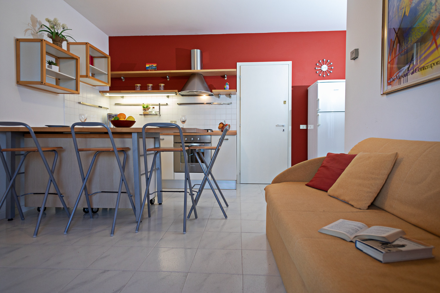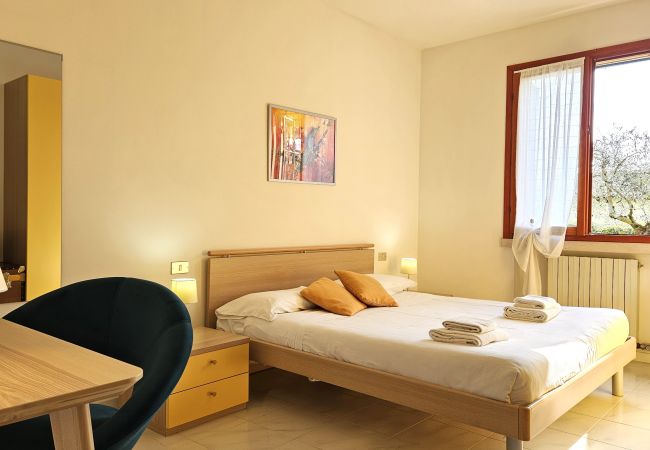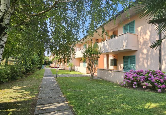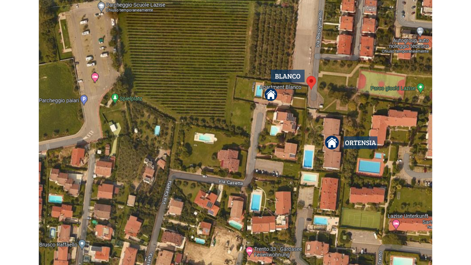 Die Apple-Wohnung befindet sich im ersten Stock innerhalb des ruhigen Wohnkomplexes Vigneti del Garda, etwa 3 km von Lazise und dem Seeufer entfernt, direkt im Zentrum der Fraktion Colà, wo sich Bars, einige typische Restaurants, ein kleiner Supermarkt und der Garda-Thermalbadepark befinden. Der Wohnkomplex verfügt über einen Erwachsenenpool mit Liegen, einen Kinderpool (Öffnungszeiten garantiert vom 15.06. - 21.09. mit ausgehängten Öffnungszeiten und Anwesenheit eines Rettungsschwimmers), Tischtennis und einen kleinen Kinderspielplatz. Die Zweizimmerwohnung kann 3 Erwachsene oder zwei Erwachsene und zwei Kinder aufnehmen und verfügt über ein Schlafzimmer mit Balkon und Aussicht, ein Badezimmer mit Duschkabine und Waschmaschine, einen Wohnbereich mit Schlafsofa, Satelliten-TV, Klimaanlage, WLAN und eine Küche mit Geschirrspüler, Kühlschrank mit Gefrierfach, Ofen, Kaffeemaschine, Toaster. Möblierte Terrasse mit Tisch und Stühlen für Mahlzeiten im Freien. Im Erdgeschoss haben die Gäste Zugang zu einem kleinen privaten Garten mit einem teilweise überdachten Fahrradabstellbereich. Überdachter privater Parkplatz innerhalb des Komplexes.