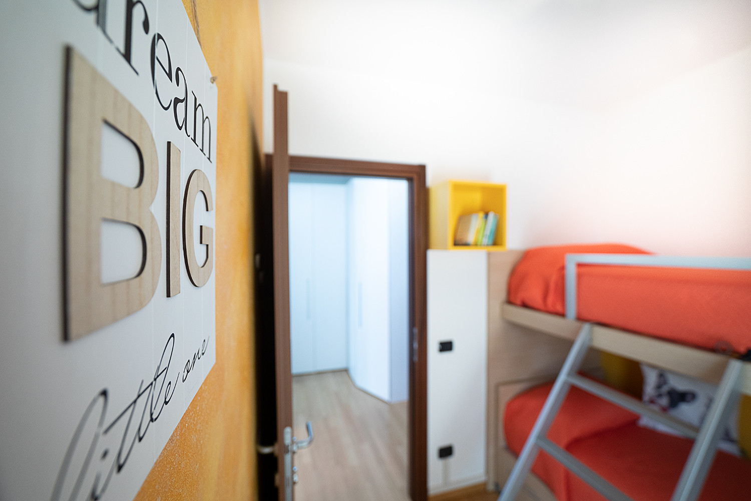 Schlafzimmer mit Doppelbett und Satelliten-TV, kleines Zimmer mit Etagenbett. Großer, im Flur befindlicher Kleiderschrank, gemeinsam für beide Zimmer. Fensterreiches Badezimmer mit Duschkabine, WC, Bidet und Waschmaschine.