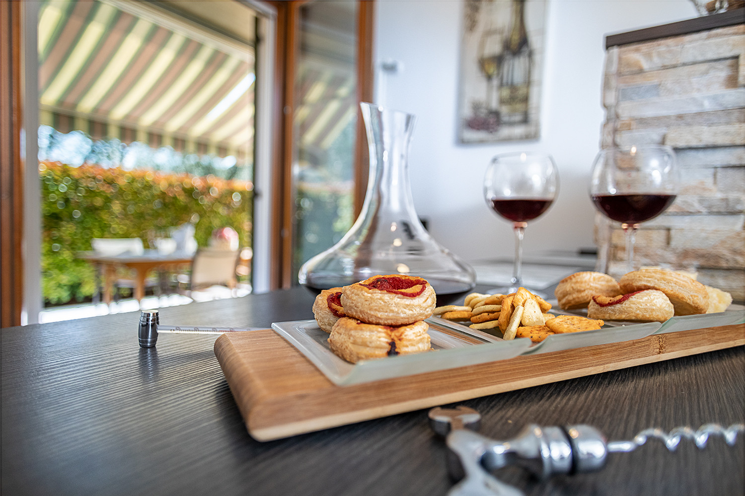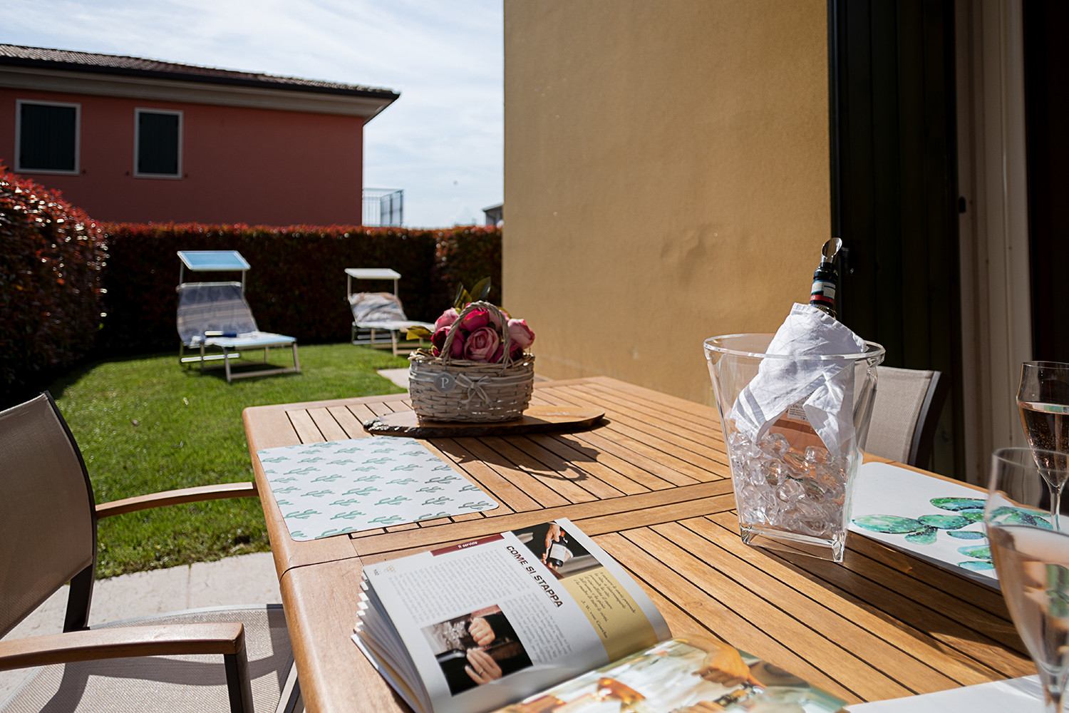 Der Wohnbereich ist komplett für 4/6 Personen ausgestattet und verfügt über eine moderne Küche mit großem Kühlschrank, Weinkühler, Kochfeld mit 4 Platten, Backofen, Geschirrspüler, Toaster, Wasserkocher und deutscher Kaffeemaschine. Satelliten-TV, Doppelbettsofa und Klimaanlage stehen den Gästen zur Verfügung. Der Wohnbereich blickt auf einen hübschen Garten, der sich über zwei Seiten der Wohnung erstreckt, mit einer gepflasterten Terrasse, die durch ein Sonnensegel beschattet wird, für angenehme Mahlzeiten im Freien.