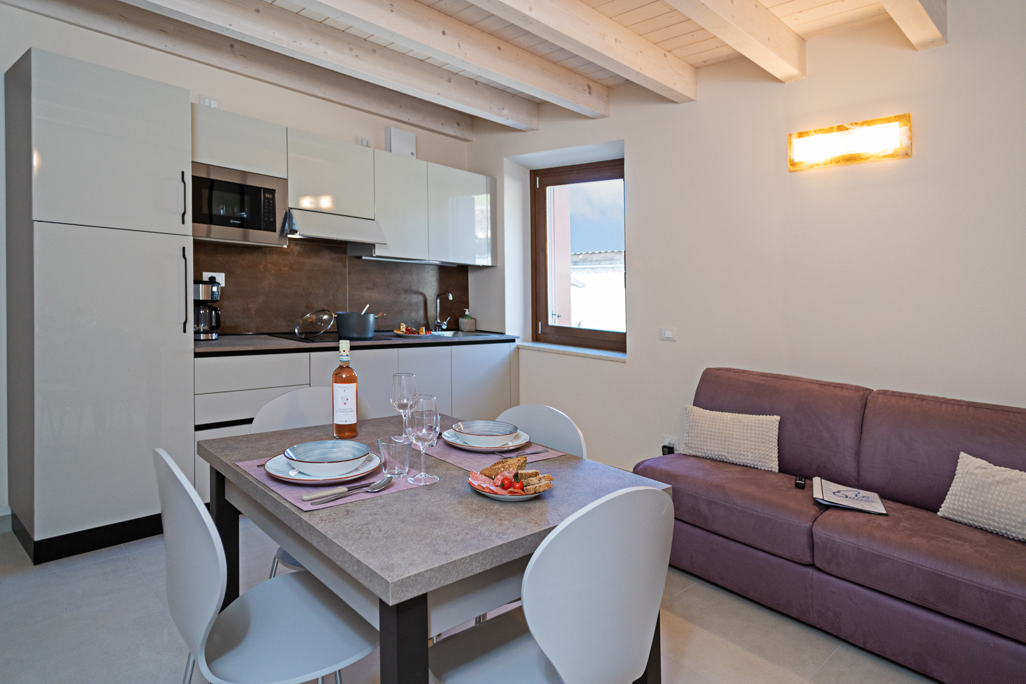 Die Apple-Wohnung befindet sich im ersten Stock innerhalb des ruhigen Wohnkomplexes Vigneti del Garda, etwa 3 km von Lazise und dem Seeufer entfernt, direkt im Zentrum der Fraktion Colà, wo sich Bars, einige typische Restaurants, ein kleiner Supermarkt und der Garda-Thermalbadepark befinden. Der Wohnkomplex verfügt über einen Erwachsenenpool mit Liegen, einen Kinderpool (Öffnungszeiten garantiert vom 15.06. - 21.09. mit ausgehängten Öffnungszeiten und Anwesenheit eines Rettungsschwimmers), Tischtennis und einen kleinen Kinderspielplatz. Die Zweizimmerwohnung kann 3 Erwachsene oder zwei Erwachsene und zwei Kinder aufnehmen und verfügt über ein Schlafzimmer mit Balkon und Aussicht, ein Badezimmer mit Duschkabine und Waschmaschine, einen Wohnbereich mit Schlafsofa, Satelliten-TV, Klimaanlage, WLAN und eine Küche mit Geschirrspüler, Kühlschrank mit Gefrierfach, Ofen, Kaffeemaschine, Toaster. Möblierte Terrasse mit Tisch und Stühlen für Mahlzeiten im Freien. Im Erdgeschoss haben die Gäste Zugang zu einem kleinen privaten Garten mit einem teilweise überdachten Fahrradabstellbereich. Überdachter privater Parkplatz innerhalb des Komplexes.