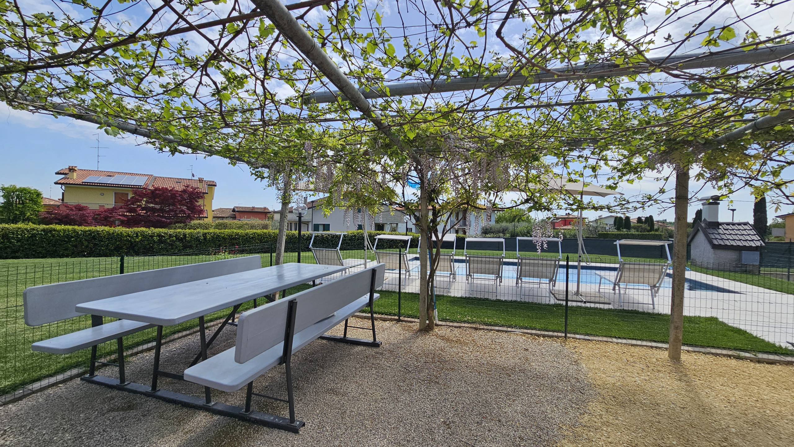 Geräumige freistehende Villa mit Garten auf vier Seiten, gelegen in Lazise, 1 km vom historischen Stadtzentrum entfernt (15 Gehminuten), bestehend aus neuer bewohnbarer Küche mit Ofen, Kochfeld, Kühlschrank, Mikrowelle und Geschirrspüler. Wohnbereich mit Satelliten-TV, dekorativem Kamin (nicht nutzbar), Doppelbettsofa, Esstisch für 8 Personen, Klimaanlage, WLAN. Zwei Doppelschlafzimmer mit Kleiderschrank und klassischen Holzmöbeln, ein Kinderzimmer mit zwei Einzelbetten und Kleiderschrank, ein fensteriertes Badezimmer mit Duschkabine und Waschmaschine, ein zweites Badezimmer mit Duschkabine. Große überdachte Terrasse, ausgestattet mit Tisch und Stühlen für entspannende Abendessen im Freien. Großer Garten, kleiner Grill, Liegestühle und überdachte Veranda mit kleiner Sitzecke. Offener Autoparkplatz innerhalb des Grundstücks. Haustiere nicht erlaubt.