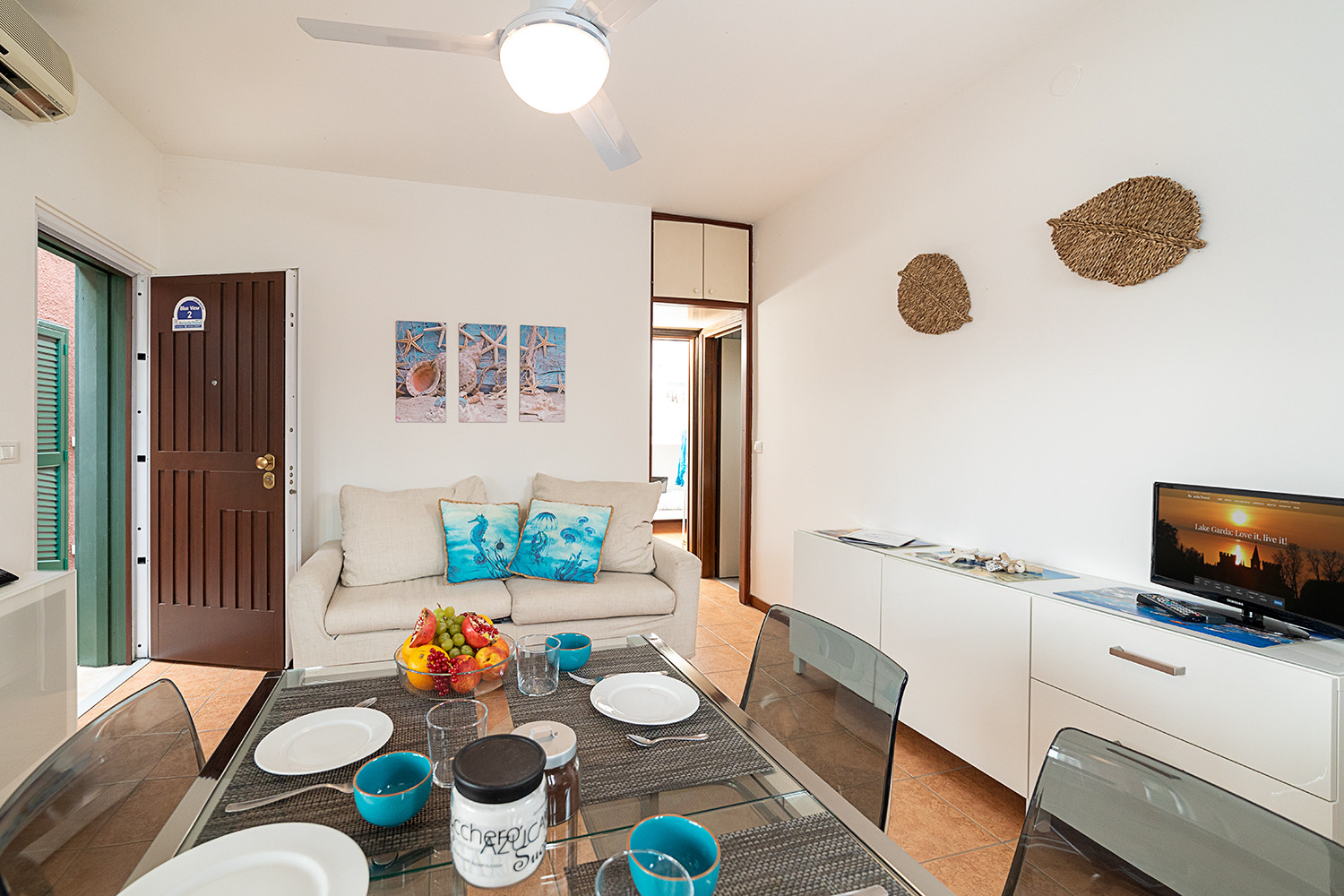 Nice three-room apartment located on the first hill of Bardolino, in a panoramic position, within the Miralago residential complex. The apartment, located on the ground floor, has a living area with a kitchenette equipped with an induction hob, microwave, dishwasher, washing machine, toaster. The apartment does not have gas, so hot water is produced by a small boiler located in the bathroom. A comfortable double sofa bed can accommodate an adult or two children, TV (no satellite) available to guests. Double bedroom with bridge wardrobe, small bedroom with bunk bed, bathroom with shower and hairdryer.