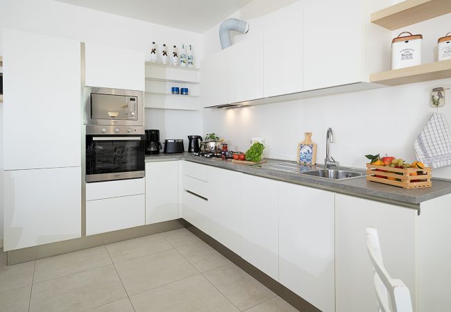 The bright apartment has been furnished with taste and elegance by the owner and consists of a spacious living area with a modern equipped kitchen and a double sofa bed. The kitchen is equipped with a refrigerator, hob, microwave, oven, dishwasher, toaster, kettle and German coffee machine. Satellite TV, wifi and air conditioning available. The living area overlooks the covered terrace furnished with a table and chairs for outdoor dining. Modern windowed bathroom with glass shower cabin. Double bedroom with television, large wardrobe and direct access to the rear terrace, also equipped with a small table and chairs for romantic outdoor breakfasts. Single room with large wardrobe. A convenient storage room houses the washing machine, ironing board and iron. Sunbeds available. Pets not allowed.