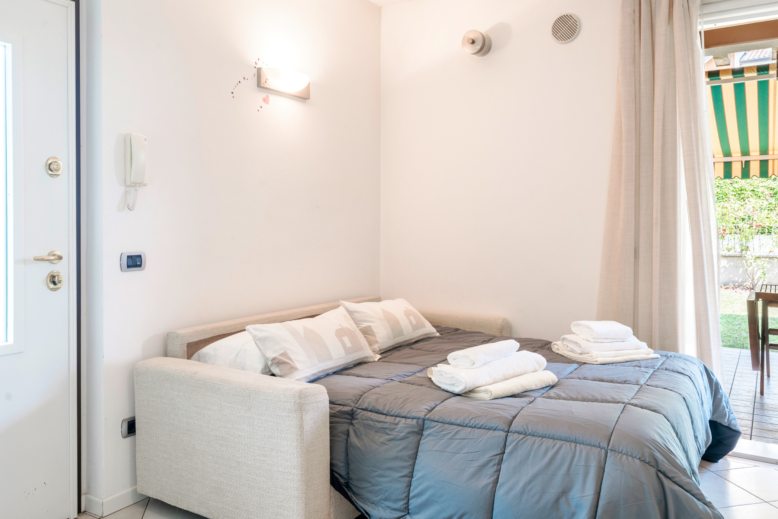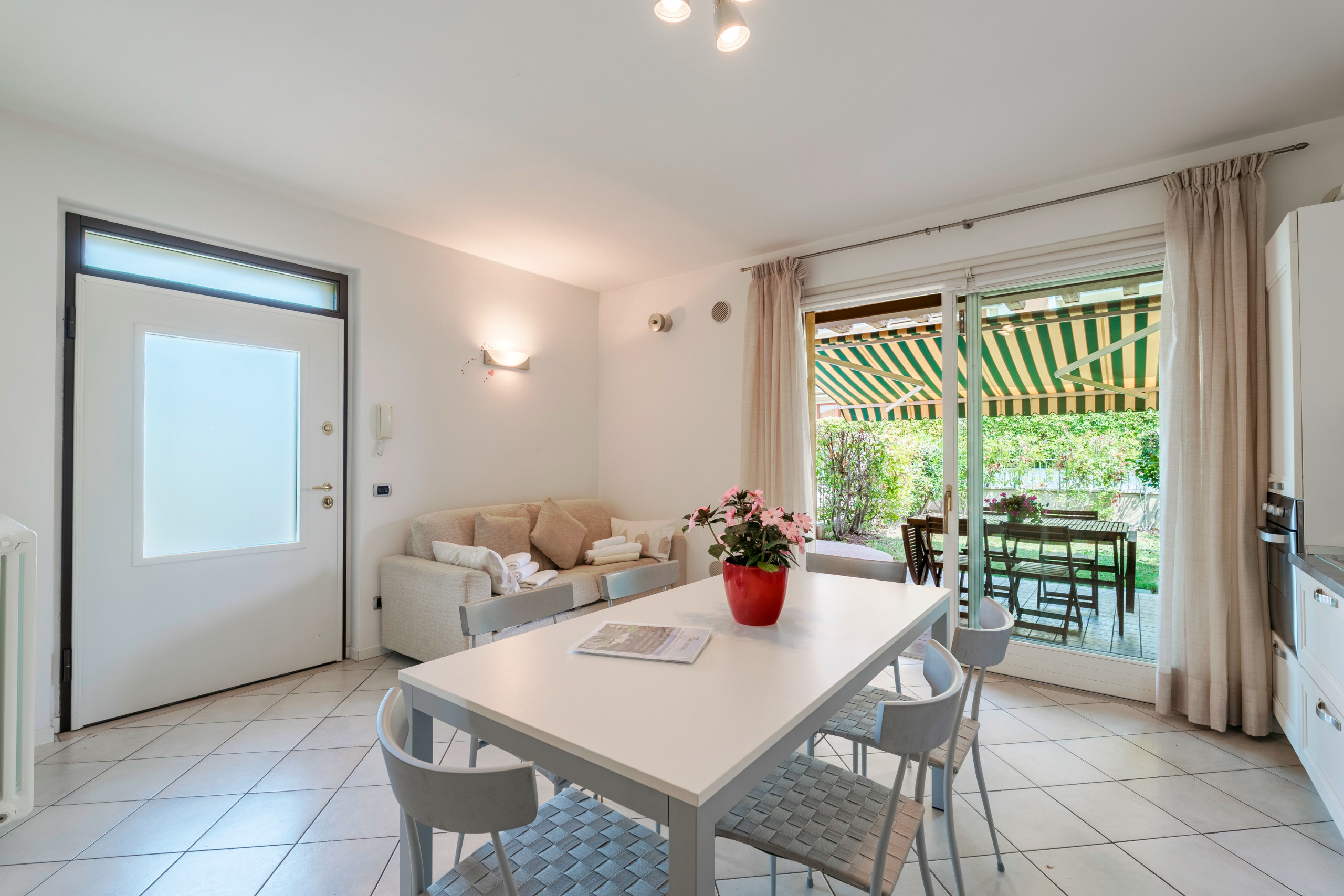 The apartment consists of a bright living area with a kitchenette with gas hob, refrigerator and freezer, dishwasher, electric/microwave oven, kettle, toaster and coffee machine. Wooden table in country chic style suitable for hosting up to 6 people. A comfortable double sofa bed (recommended for one adult or two children) and a reading armchair complete the living room. Air conditioning, satellite TV and wifi available for guests. Double bedroom with wardrobe, small bedroom with bunk bed and wardrobe. Windowed bathroom with shower cabin and convenient washing machine. A covered parking space within the complex available, access manoeuvre with limited space (width 235 cm, height 200 cm, depth 600 cm). Cellar where bicycles can be parked safely, sun loungers available for guests for use in the pool (swimming cap mandatory - pool use guaranteed 15/06-15/09 - open only during lifeguard hours 11.00/13.00 and 15.30/19.30). Pets not allowed, non-smoking apartment.