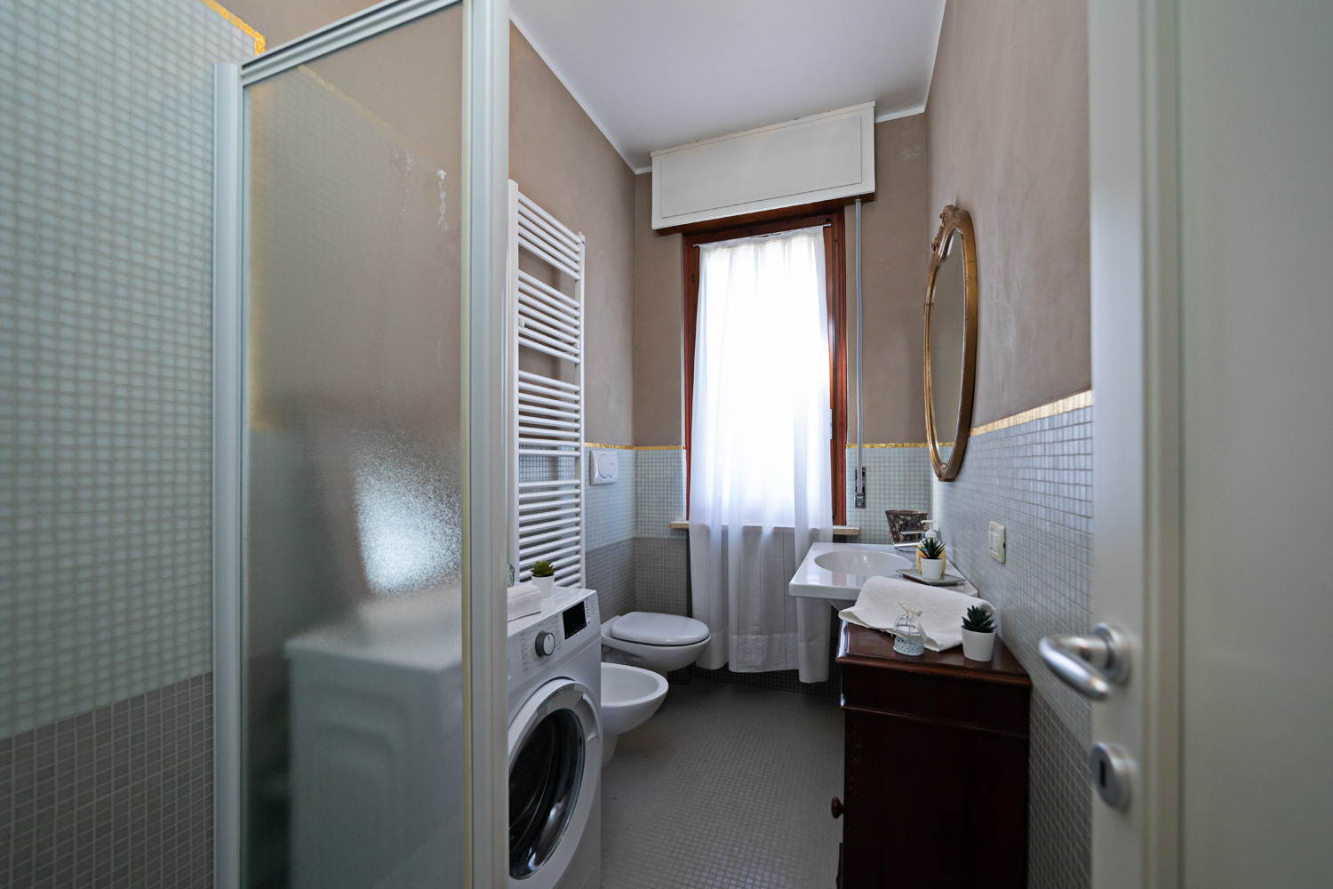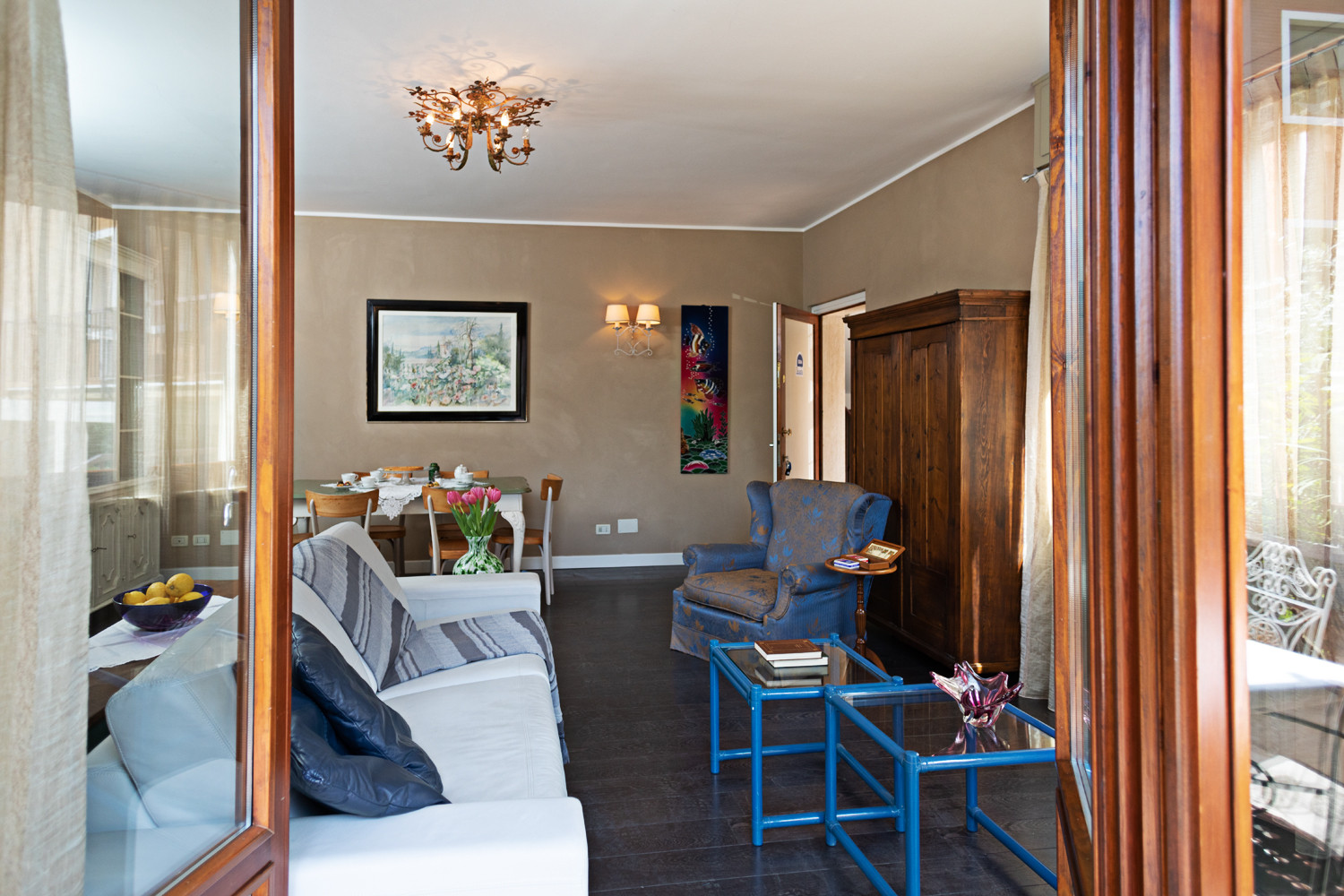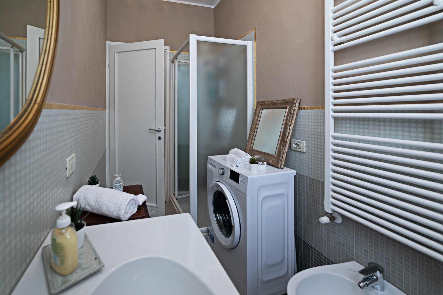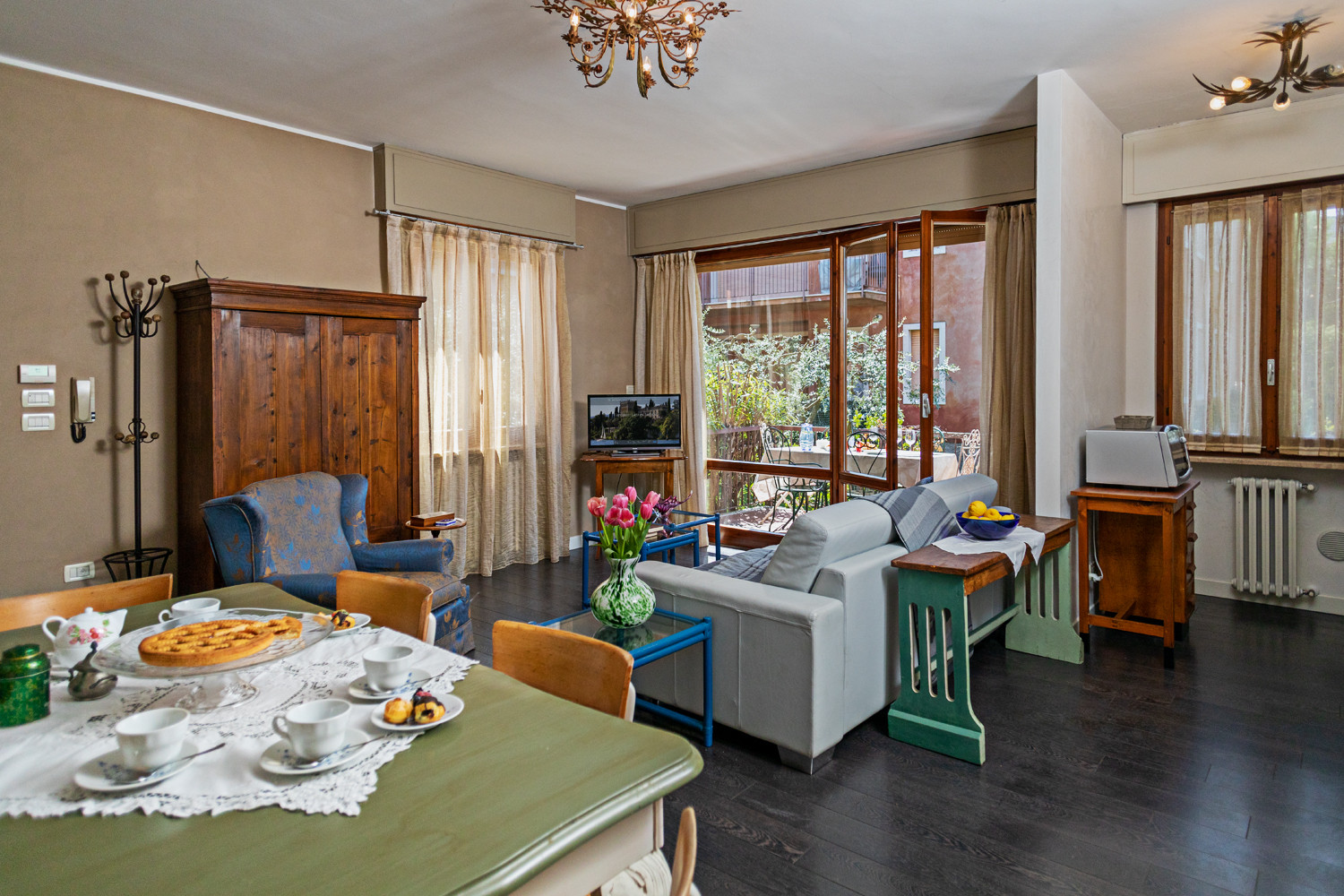 The apartment consists of a bright living area with a kitchenette with gas hob, refrigerator and freezer, dishwasher, electric/microwave oven, kettle, toaster and coffee machine. Wooden table in country chic style suitable for hosting up to 6 people. A comfortable double sofa bed (recommended for one adult or two children) and a reading armchair complete the living room. Air conditioning, satellite TV and wifi available for guests. Double bedroom with wardrobe, small bedroom with bunk bed and wardrobe. Windowed bathroom with shower cabin and convenient washing machine. A covered parking space within the complex available, access manoeuvre with limited space (width 235 cm, height 200 cm, depth 600 cm). Cellar where bicycles can be parked safely, sun loungers available for guests for use in the pool (swimming cap mandatory - pool use guaranteed 15/06-15/09 - open only during lifeguard hours 11.00/13.00 and 15.30/19.30). Pets not allowed, non-smoking apartment.