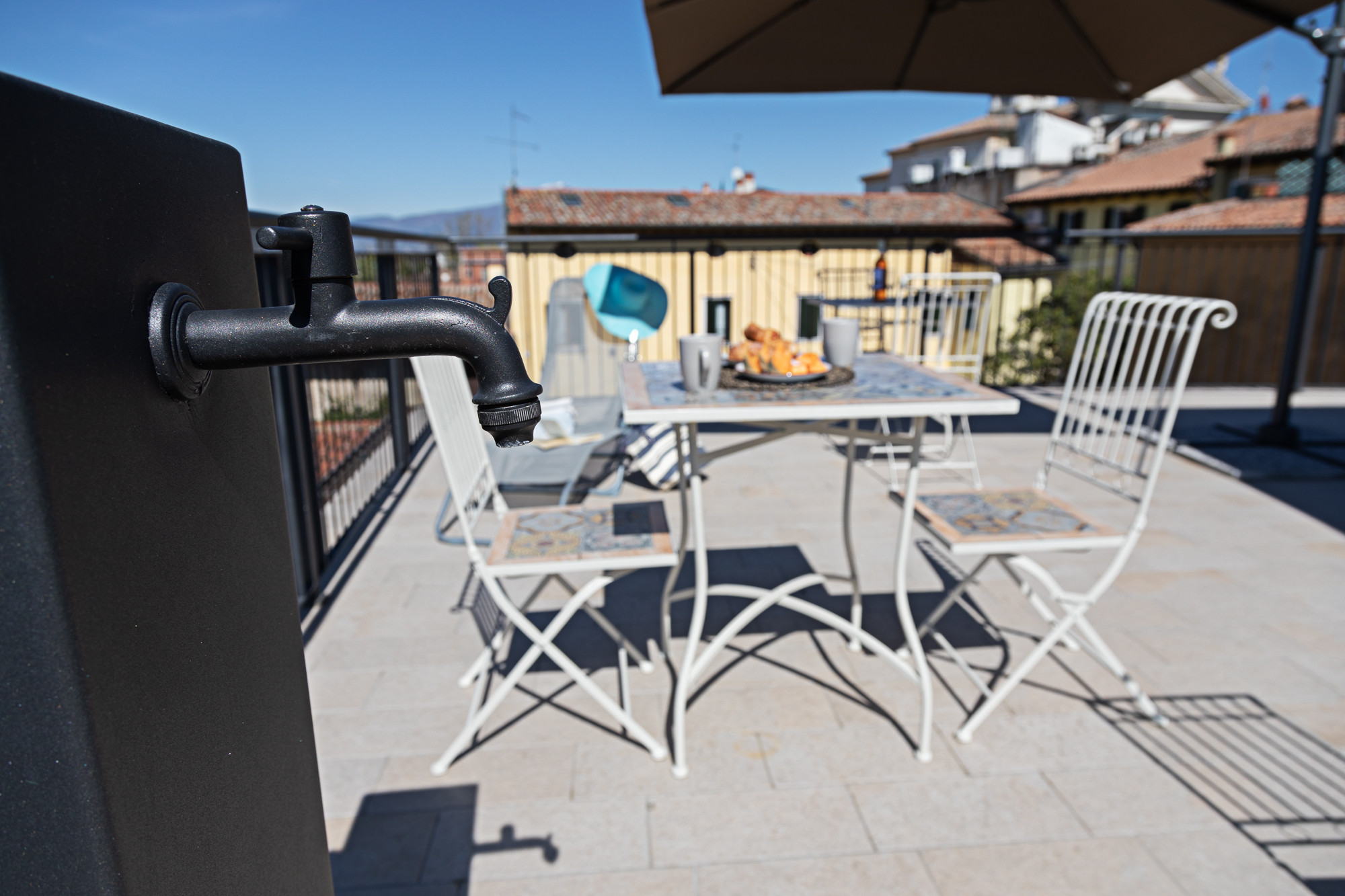 The highlight of the residence is certainly the magnificent shared panoramic solarium terrace with a wide lake view, furnished with 3 coffee tables, a large umbrella, sun loungers and sunbeds for guests' use. Here you will also find a convenient shower to refresh yourself on hot summer days and a shared washing machine.