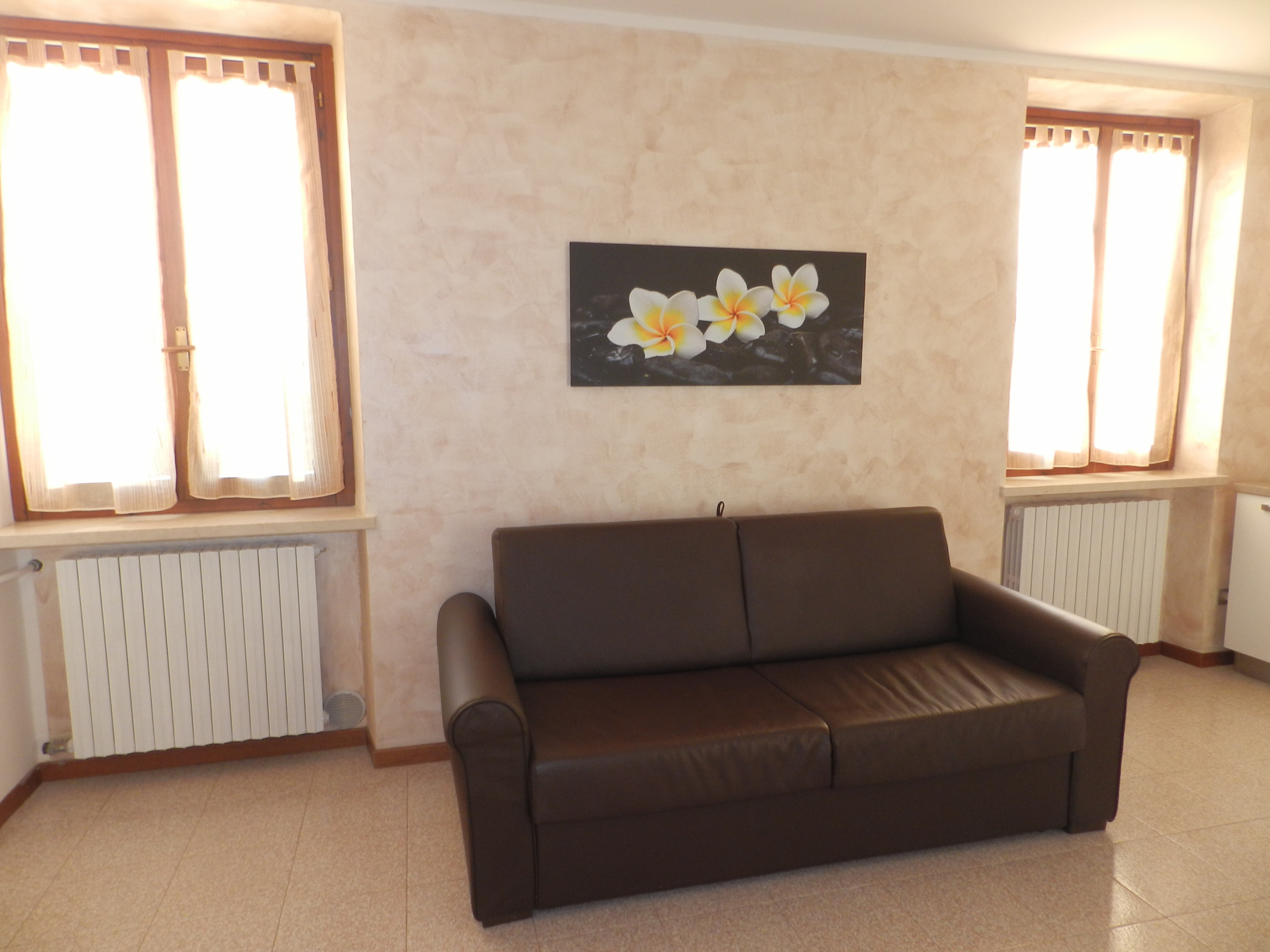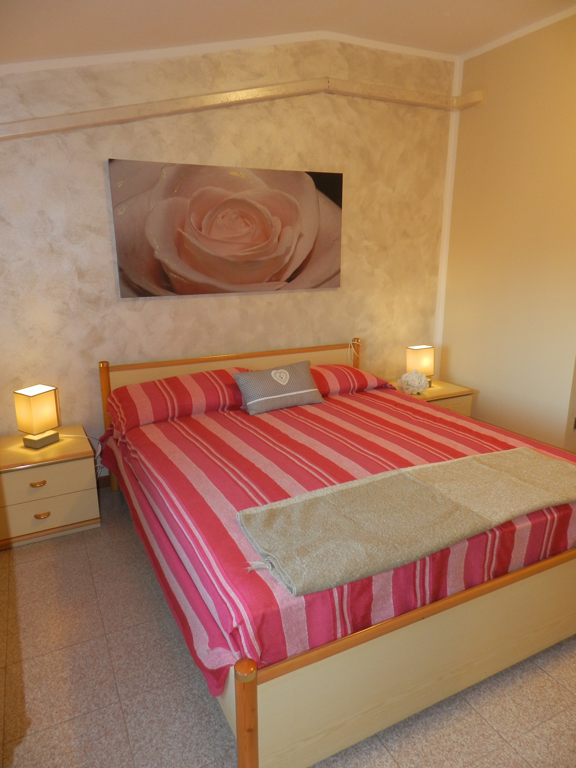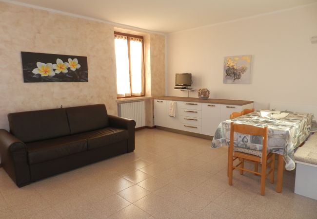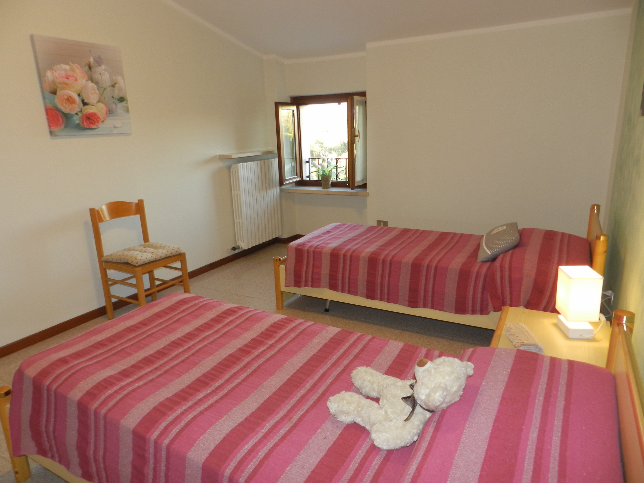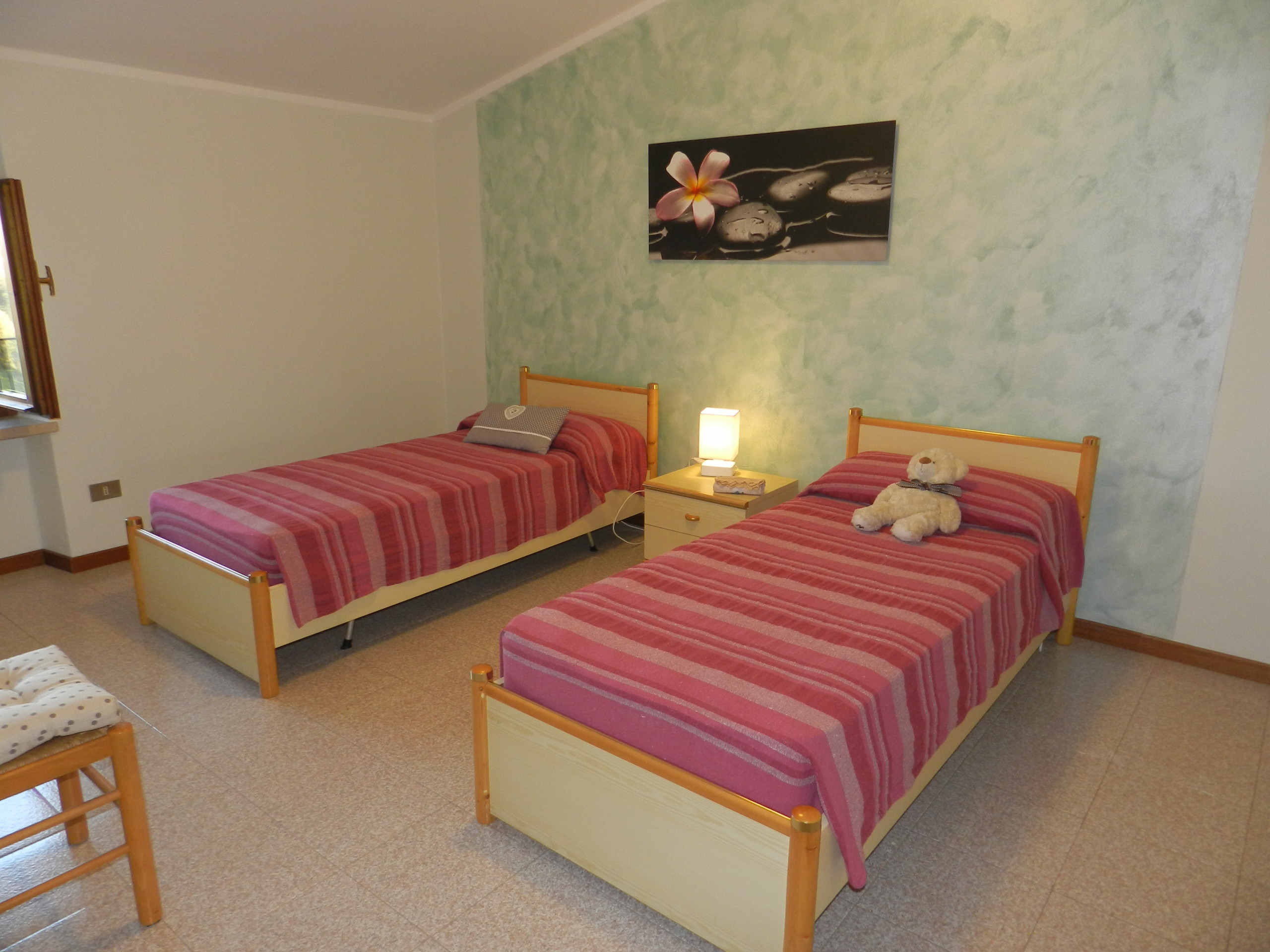 Bright three-room apartment located on the first floor, consisting of a living room with a kitchenette, refrigerator with freezer, table with chairs, coffee machine, toaster, cooktop. Sofa bed, Sat-Tv, Wi-fi, air conditioning/heating (only in the living room). Double bedroom with wardrobe, safe. Room with two single beds (can be positioned next to each other), small wardrobe, bathroom with shower box, bidet, mirror and washing machine. Access through stairs to the large garden furnished with tables, chairs and umbrellas. We suggest this apartment to families with children or groups of friends looking for a place near the lake, in a quiet location with all the comforts of a holiday village.