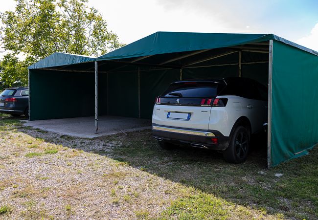 The master bedroom has ample manoeuvring space at the foot of the bed, a safe and a large wardrobe. The second bedroom consists of a bunk bed (beds measure 80x190 cm) and a pull-out bed as well as a wardrobe and a bookshelf. Both rooms overlook the porch with sun shade and the large rear garden. The living area consists of a double sofa bed and a large equipped kitchen with gas hob, refrigerator, freezer, oven, toaster, American coffee machine and dishwasher. Air conditioning and wifi are available to guests. The living area overlooks a second covered porch with sun shade, barbecue/fireplace and a second table with chairs. In the accessible basement, accessible through a ramp, there is a parking space in the garage and a cellar with washing machine and bicycle parking with the possibility of charging e-bikes. On the ground floor, near the apartment entrance, there is a second private uncovered parking space. Pets are not allowed. Smoking is prohibited in the house.