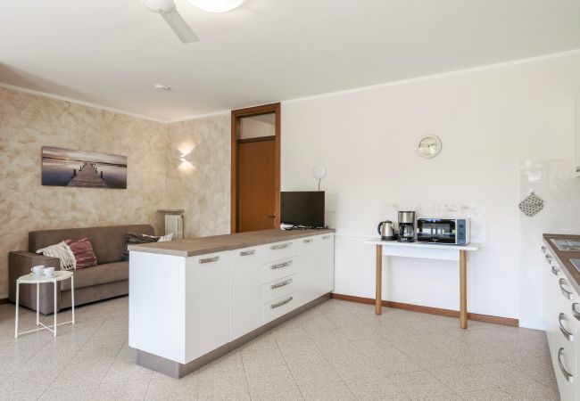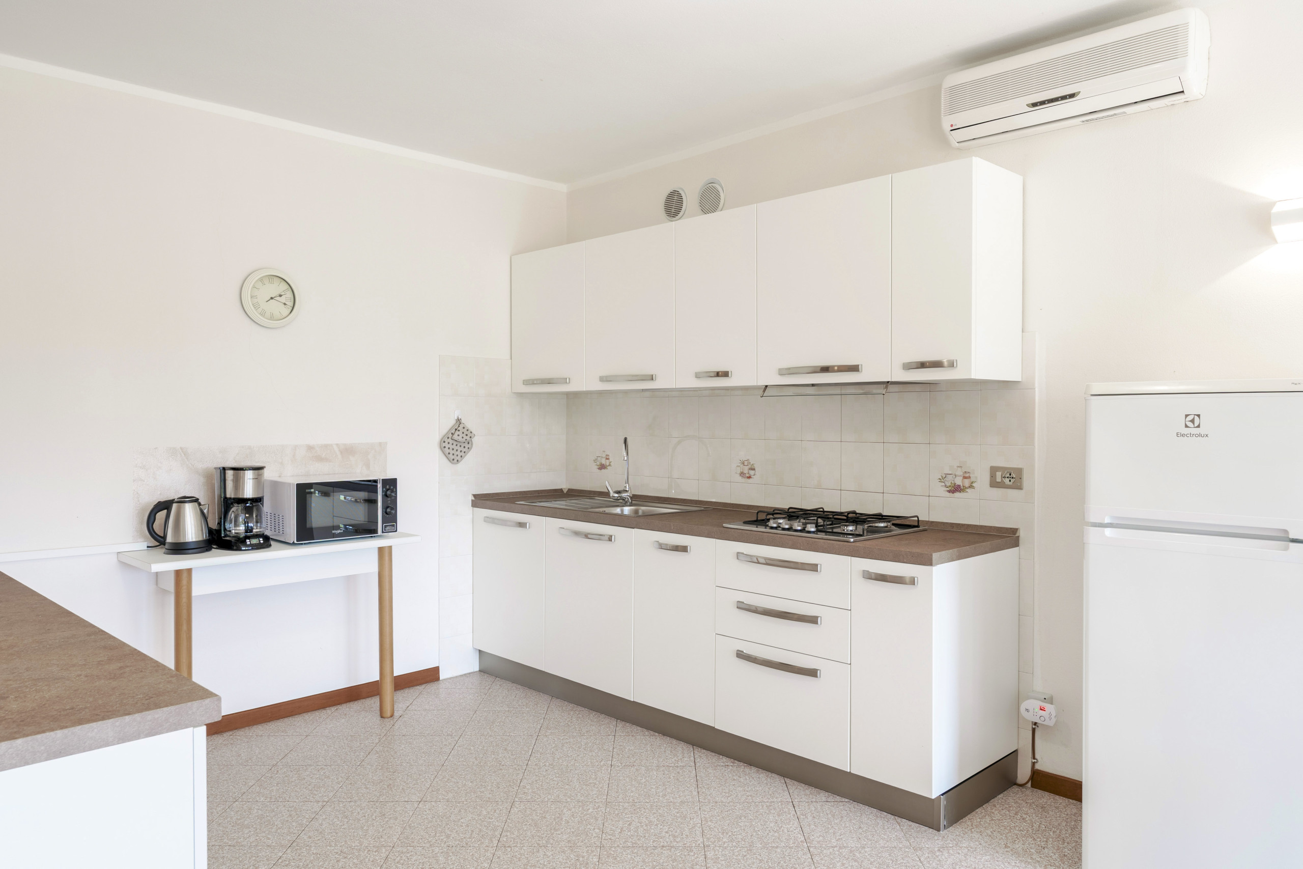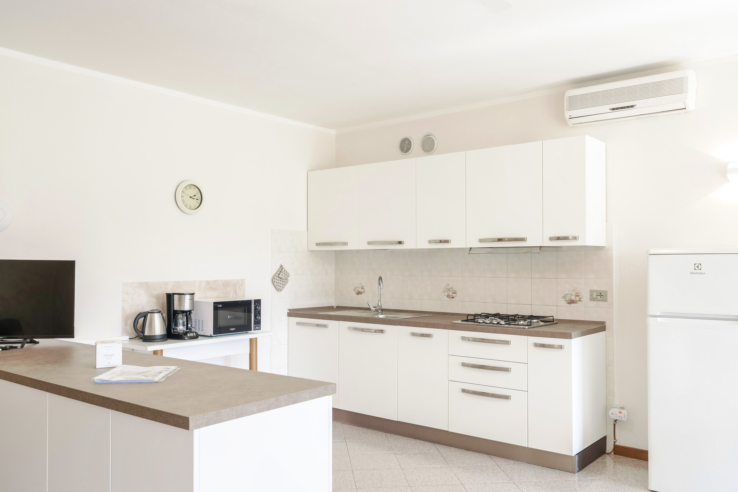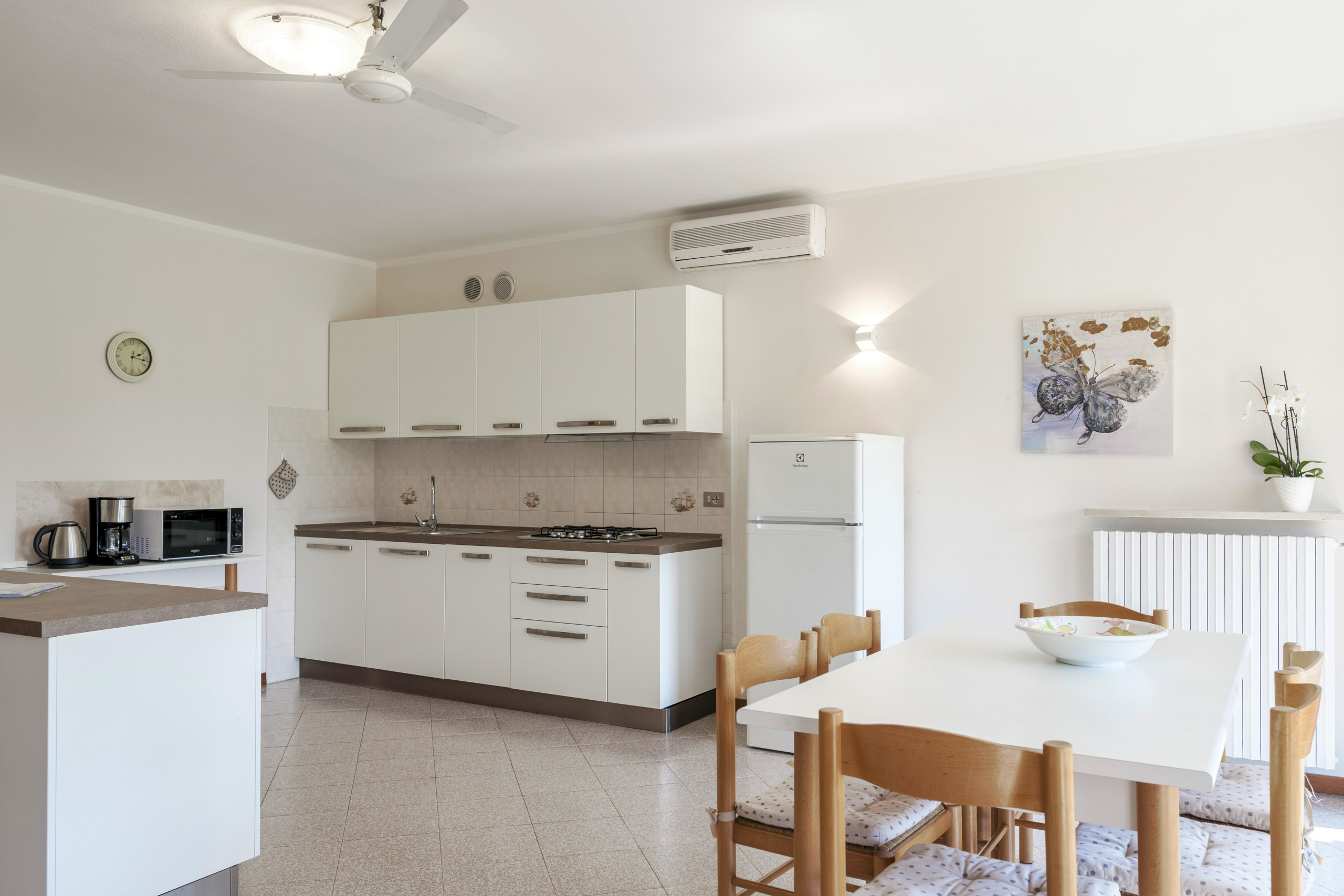Three-room ground floor apartment consisting of a bright living area with a new equipped kitchen with refrigerator with freezer, table and chairs, coffee machine, toaster, 4-burner hob, microwave and dishwasher. Sofa bed, Sat-Tv, Wi-fi, air conditioning/heating. New master bedroom with double bed, wardrobe, safe. New room with two single beds, small wardrobe. Bathroom with window, shower box, bidet and mirror. Direct access to the large garden furnished with tables, chairs and umbrellas. We suggest this apartment to families with children or groups of friends looking for a place near the lake, in a quiet location with all the comforts of a holiday village.