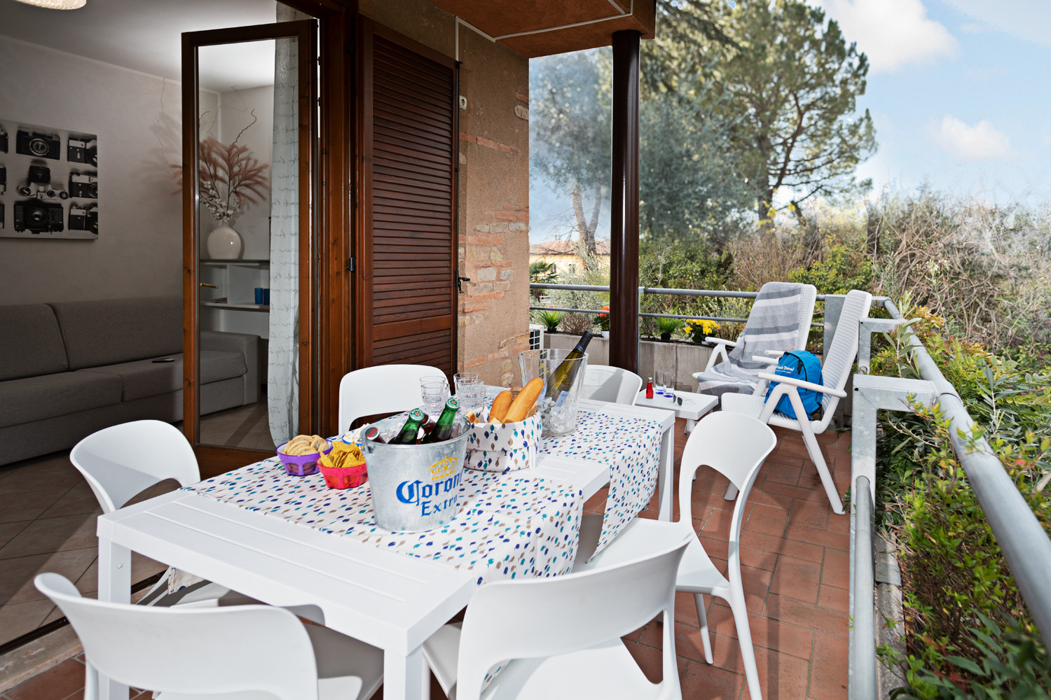 The comfortable 65 sq.m. Sissi House apartment is located on the first floor and offers a spacious covered terrace, equipped with a sun awning, with views of the surrounding greenery and the swimming pool. The terrace is furnished with a table and chairs where you can relax or have an aperitif at the end of a day discovering the beauty of Lake Garda.