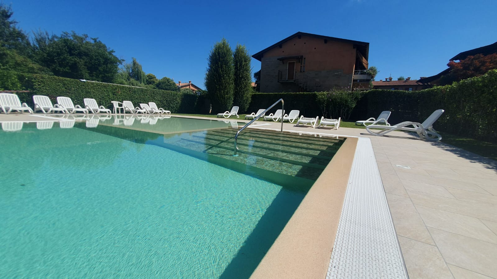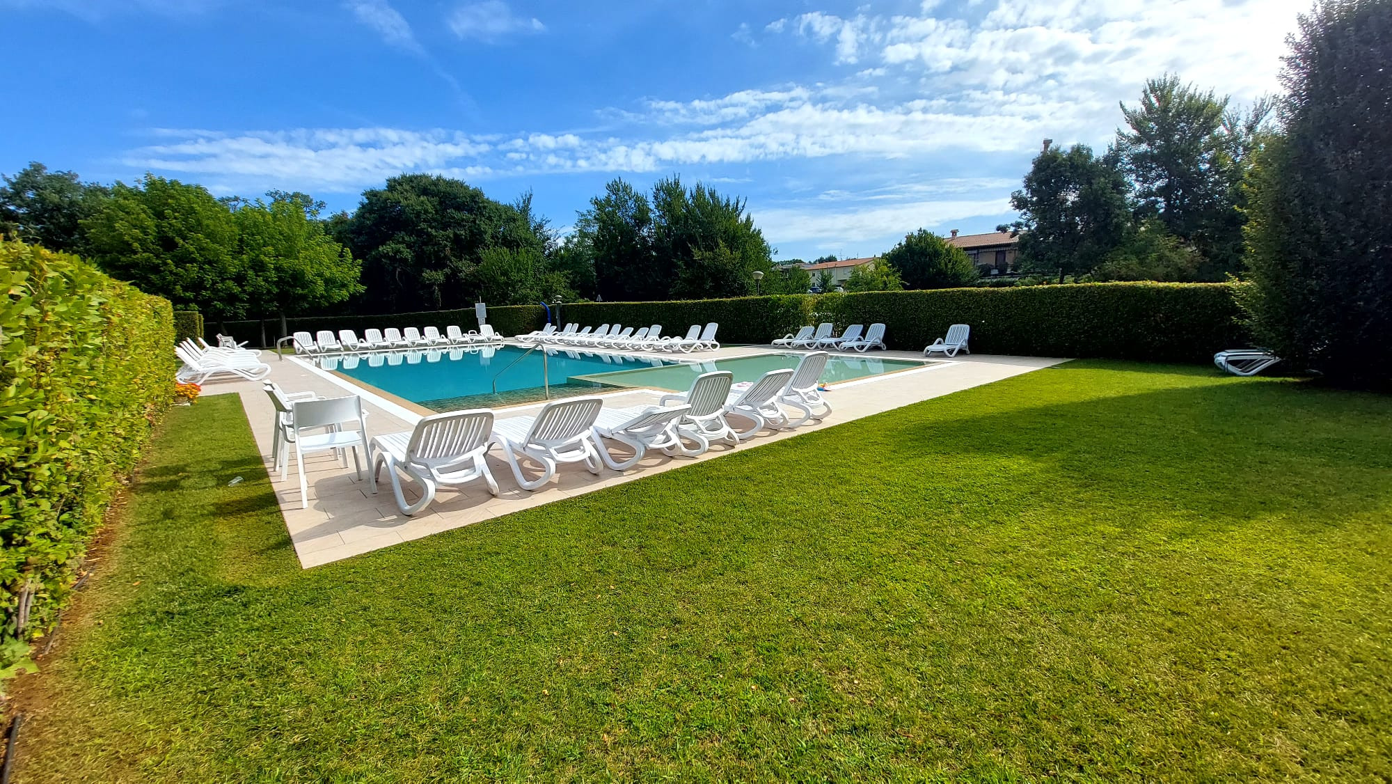Charming two-room apartment located in the Gardenia residential complex in Lazise, about 1.2 km from the center of Lazise (15 minutes walking) and 1.5 km from the beach. The intimate residential context of only 8 units has a swimming pool (guaranteed opening period 15/05-30/09) and a large green area. The completely renovated apartment opens onto a welcoming living area with a view of the pool and a terrace furnished with a table, chairs, and a sun shade. The living room has a kitchenette with a refrigerator, freezer, oven, gas stove, dishwasher, toaster, American coffee machine, and capsule coffee machine. Relaxation corner with satellite TV, free WiFi, air conditioning, and a comfortable double sofa bed. Modern bathroom with shower cabin and hairdryer available for guests. Spacious storage room with changing area and pantry. The double bedroom, with direct access to the shaded rear garden furnished with an umbrella and sun loungers, has a spacious wardrobe and a canopy bed. Covered parking space in the garage. Cellar with laundry and two bicycles available for guests. Non-smoking apartment, pets not allowed. We recommend this apartment to couples or families looking for a modern accommodation in a small context convenient to the historic center of Lazise.