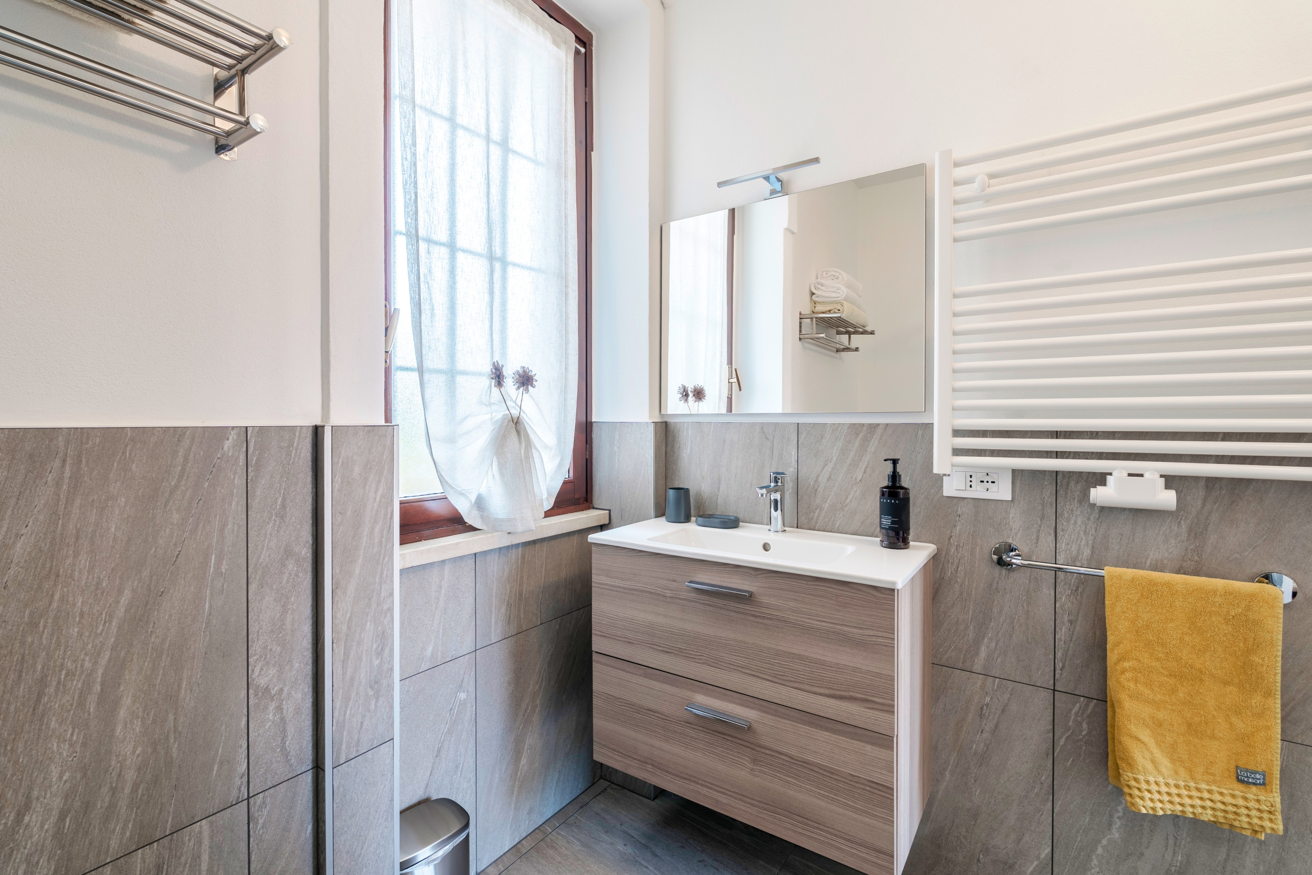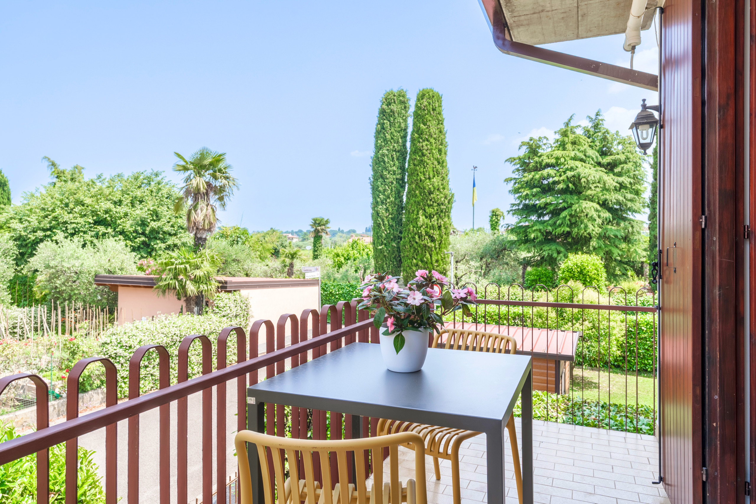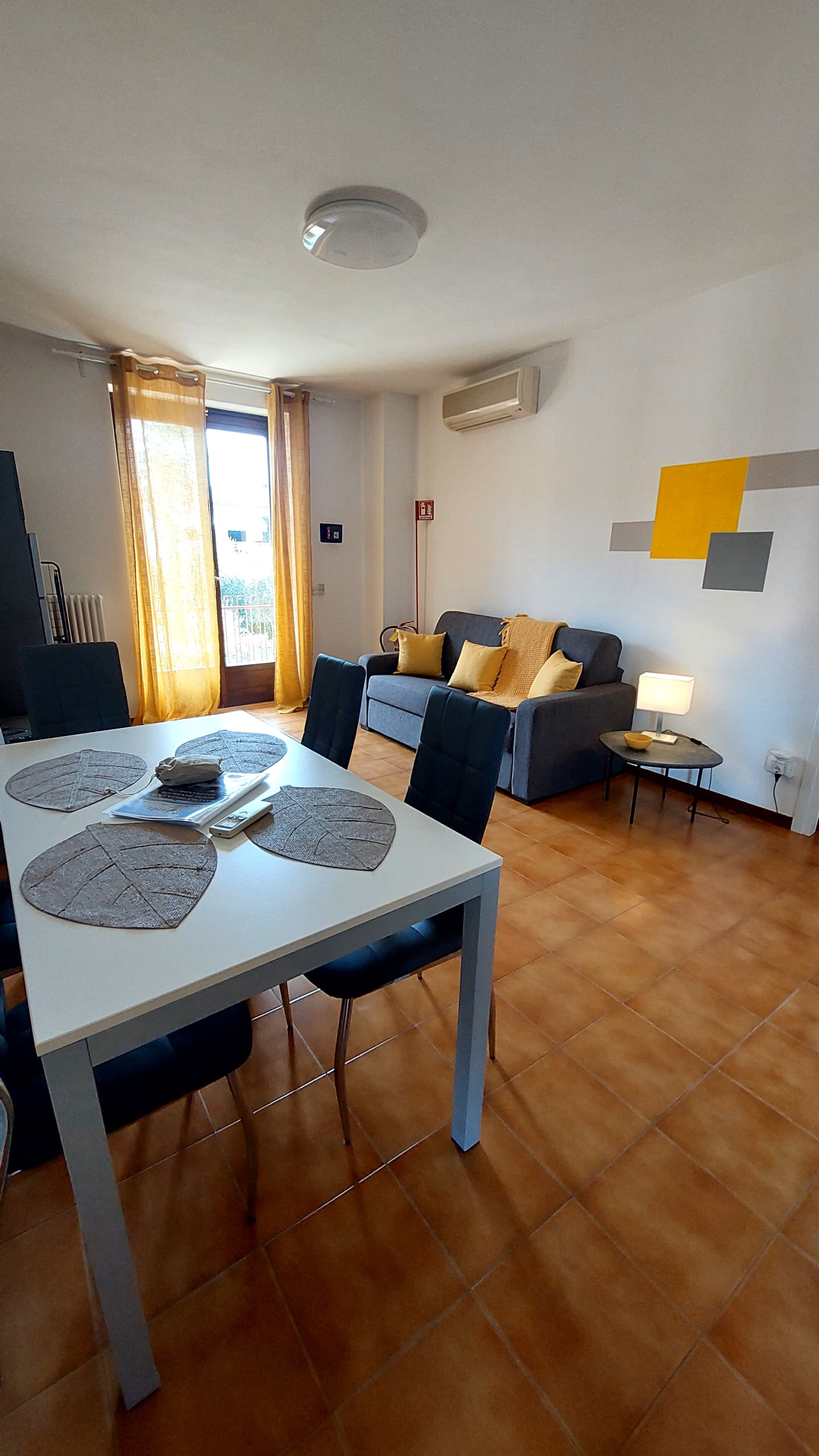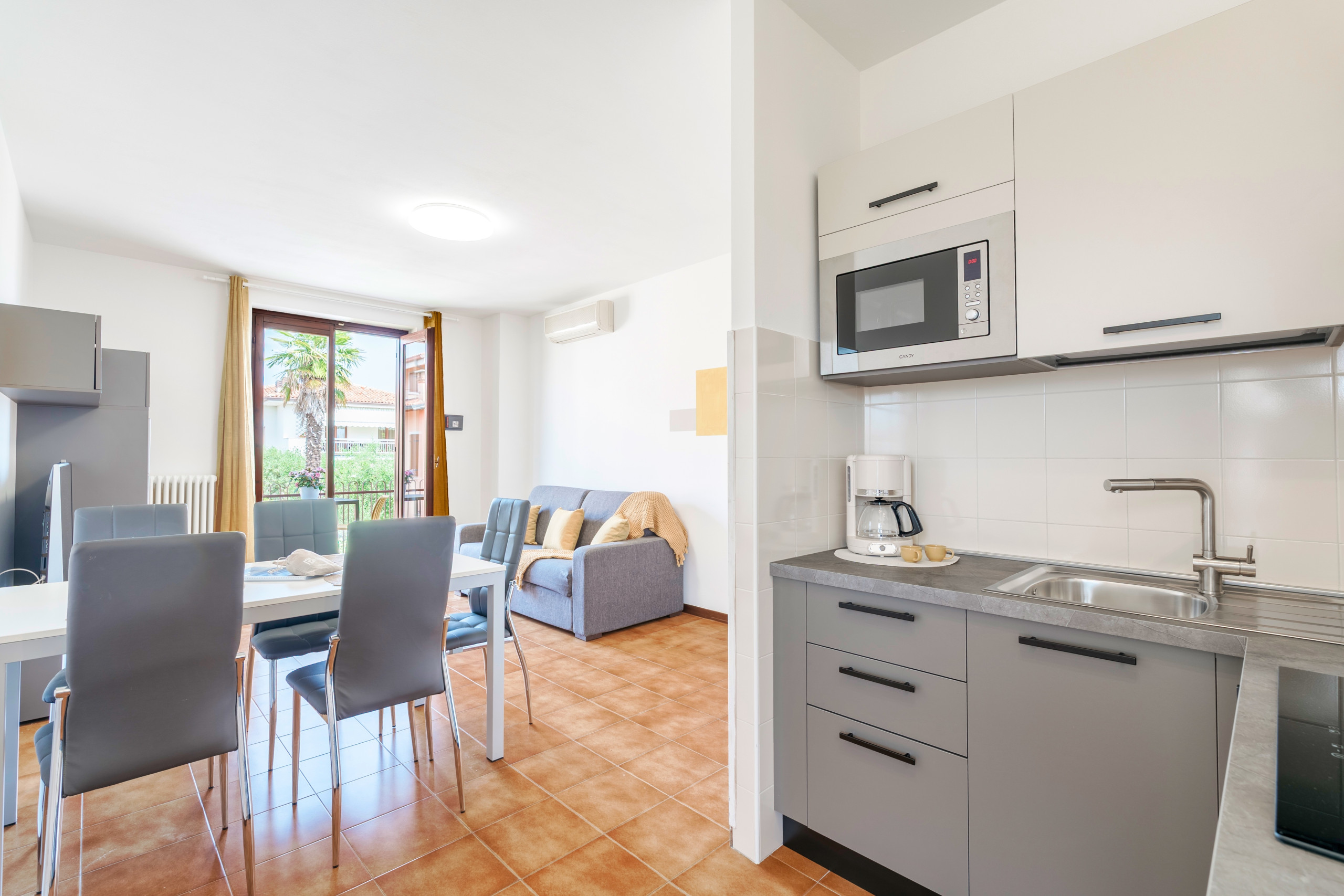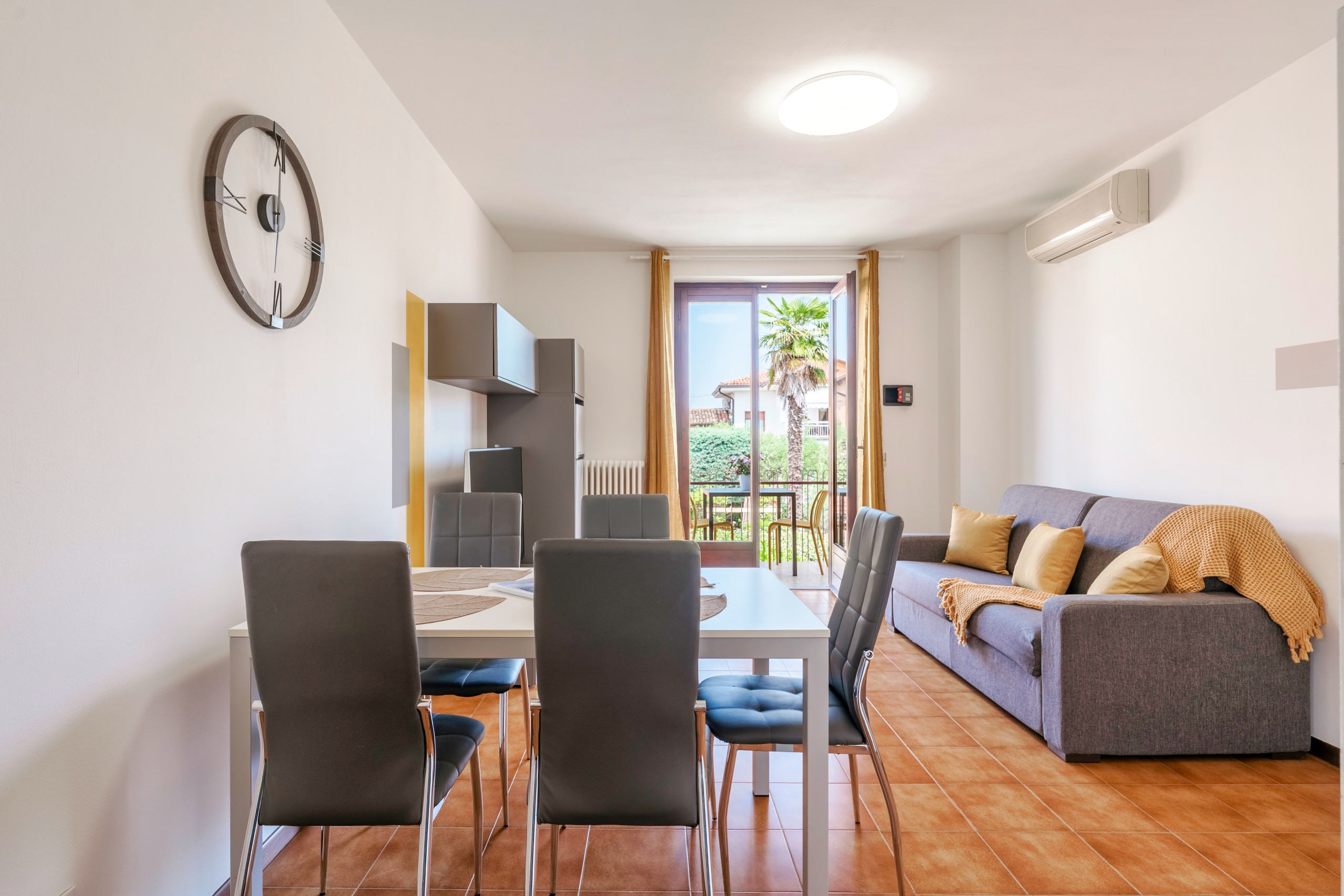 The Apple apartment is located on the first floor within the quiet Vigneti del Garda residential complex, about 3 km from Lazise and the lakeshore, directly in the centre of the Colà district where there are bars, some typical restaurants, a small supermarket and the Garda Thermal Park. The residential complex has an adult swimming pool with sun loungers, a children's pool (guaranteed opening dates from 15.06 - 21.09 with hours displayed at the pool entrance and lifeguard presence), ping pong and a small children's playground. The two-bedroom apartment can accommodate 3 adults or two adults and two children and features a bedroom with balcony with a view, bathroom with shower cabin and washing machine, living area with sofa bed, satellite TV, air conditioning, wifi and a kitchen equipped with dishwasher, refrigerator with freezer, oven, coffee maker, toaster. Furnished terrace with table and chairs for outdoor meals. On the ground floor, guests have access to a small private garden with a semi-covered parking area for bicycles. Private covered parking space within the complex. Small animals allowed with supplement. Non-smoking apartment.
