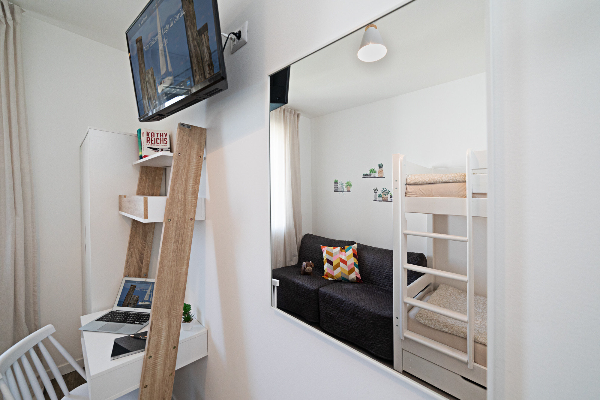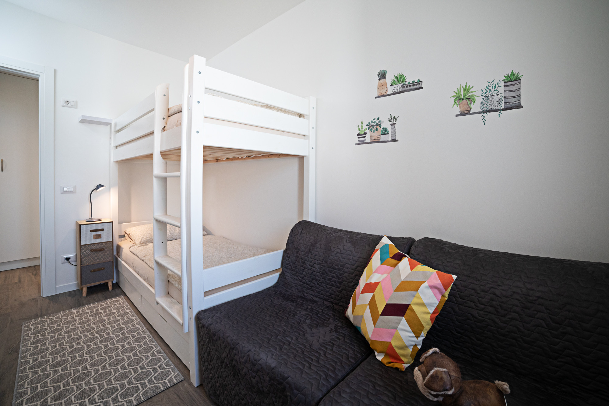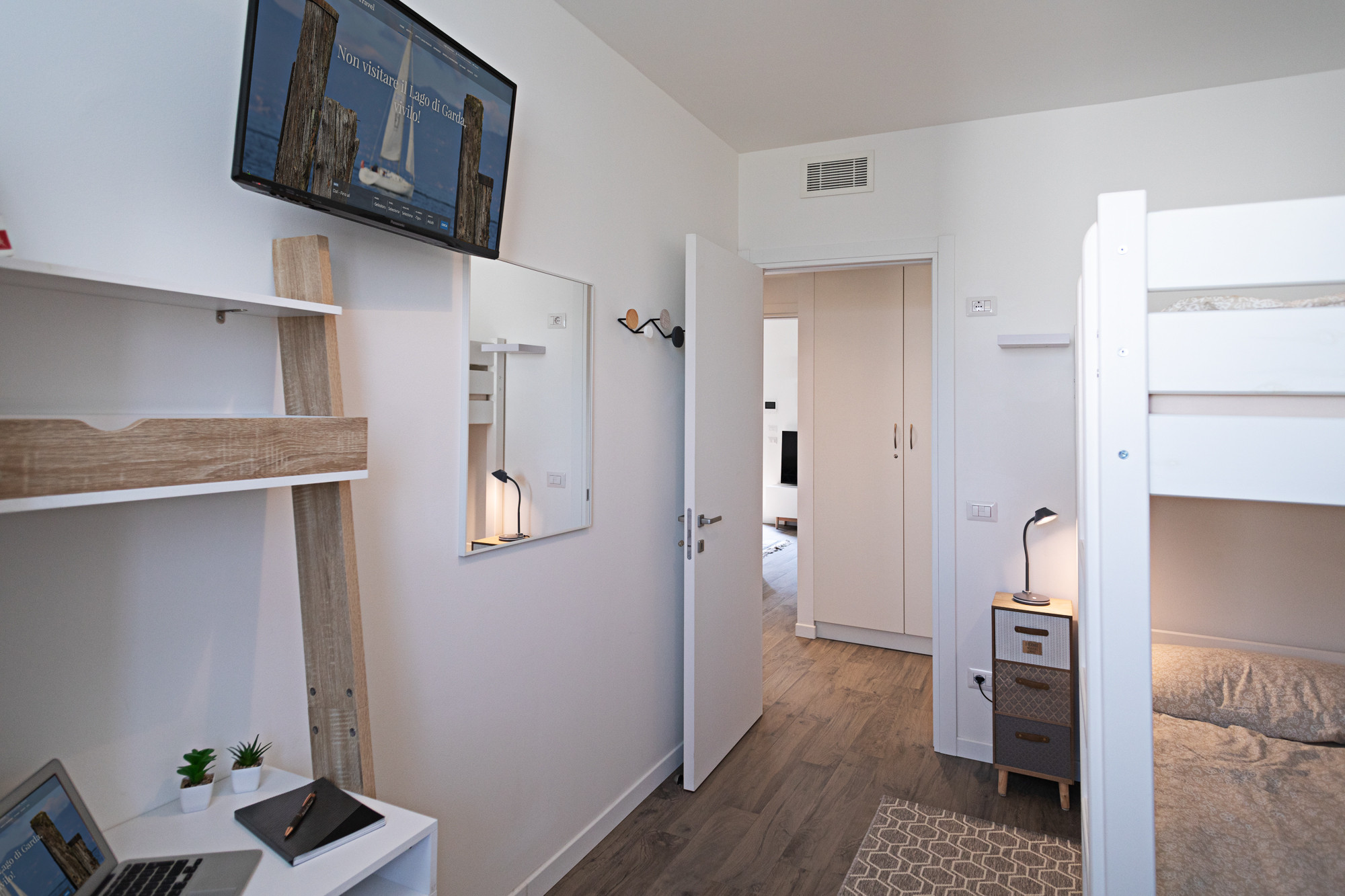 The Costa del Sole 2 three-room apartment is a bright apartment of approximately 65 sqm located in Pacengo di Lazise, within walking distance of Movieland and Caneva World and about 4 km from the historic centre of Lazise. It is situated in the Costa del Sole residential complex, with a communal swimming pool (guaranteed opening 15/05-30/09). The apartment is suitable for people with reduced mobility as it is completely on the ground floor and all rooms have manoeuvring spaces suitable for a wheelchair. The bathroom is fully accessible and designed to ensure comfort and safety. It is equipped with a wide sliding door to facilitate wheelchair access, floor-level shower with support handles. The washbasin is installed at an accessible height with free space underneath to allow wheelchair approach. The WC is equipped with a handrail on one side and a foldable grab bar on the other for easy and safe use. Non-slip surfaces and adequate lighting complete a functional and inclusive environment.