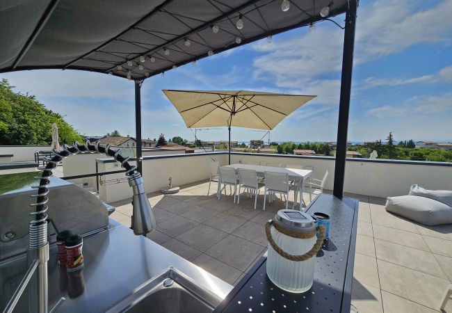 The master bedroom has ample manoeuvring space at the foot of the bed, a safe and a large wardrobe. The second bedroom consists of a bunk bed (beds measure 80x190 cm) and a pull-out bed as well as a wardrobe and a bookshelf. Both rooms overlook the porch with sun shade and the large rear garden. The living area consists of a double sofa bed and a large equipped kitchen with gas hob, refrigerator, freezer, oven, toaster, American coffee machine and dishwasher. Air conditioning and wifi are available to guests. The living area overlooks a second covered porch with sun shade, barbecue/fireplace and a second table with chairs. In the accessible basement, accessible through a ramp, there is a parking space in the garage and a cellar with washing machine and bicycle parking with the possibility of charging e-bikes. On the ground floor, near the apartment entrance, there is a second private uncovered parking space. Pets are not allowed. Smoking is prohibited in the house.