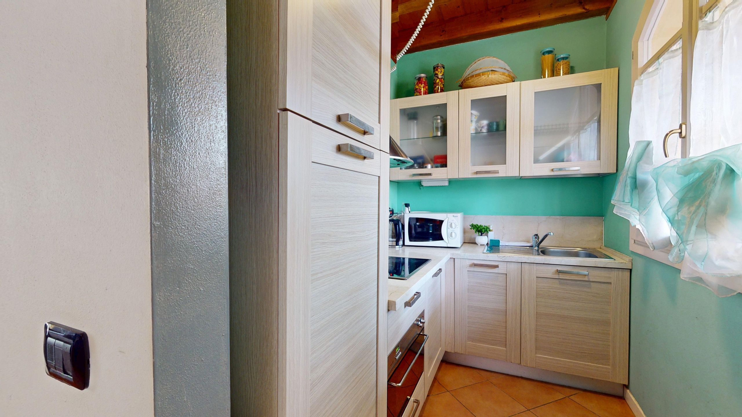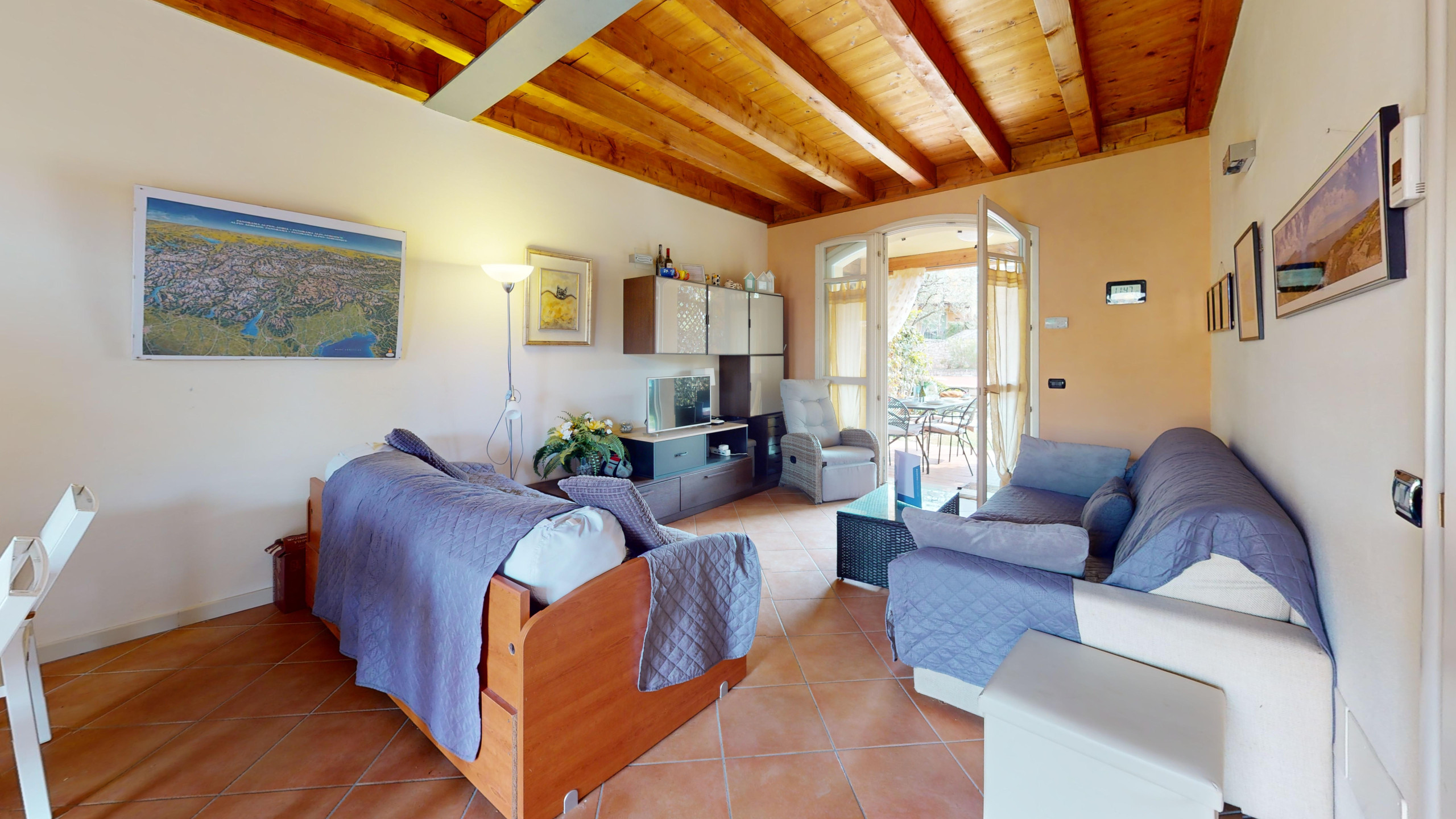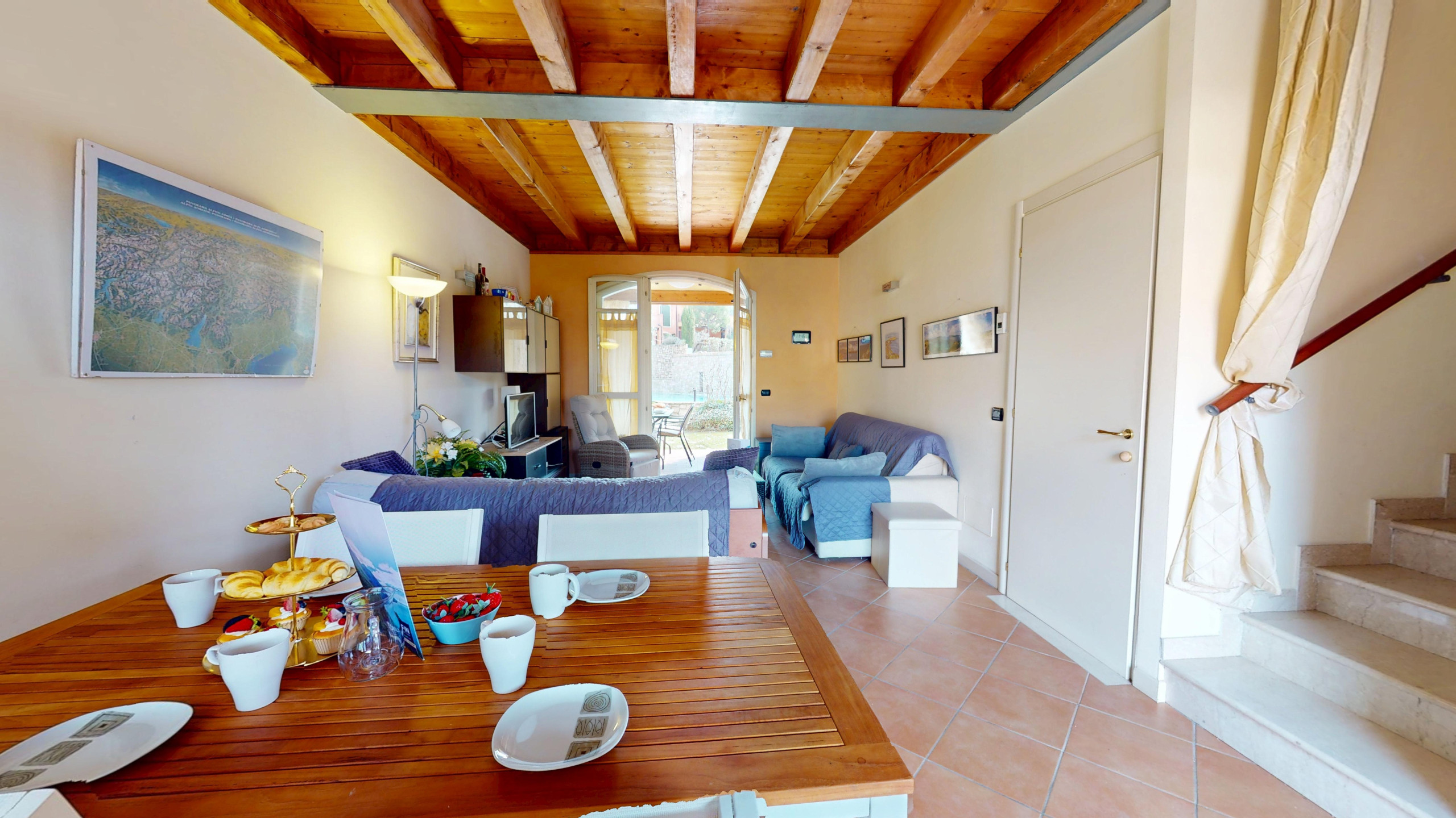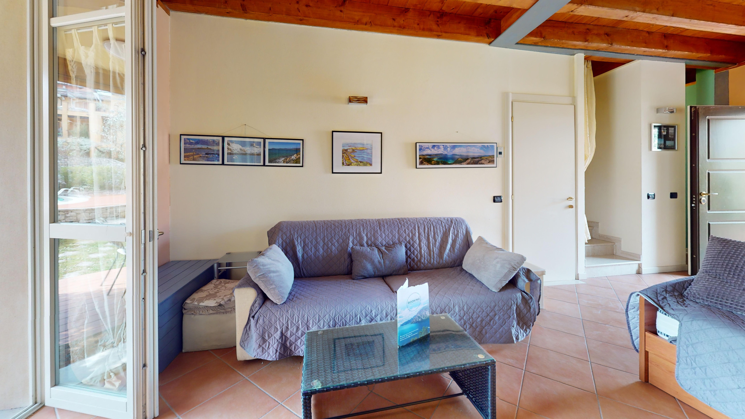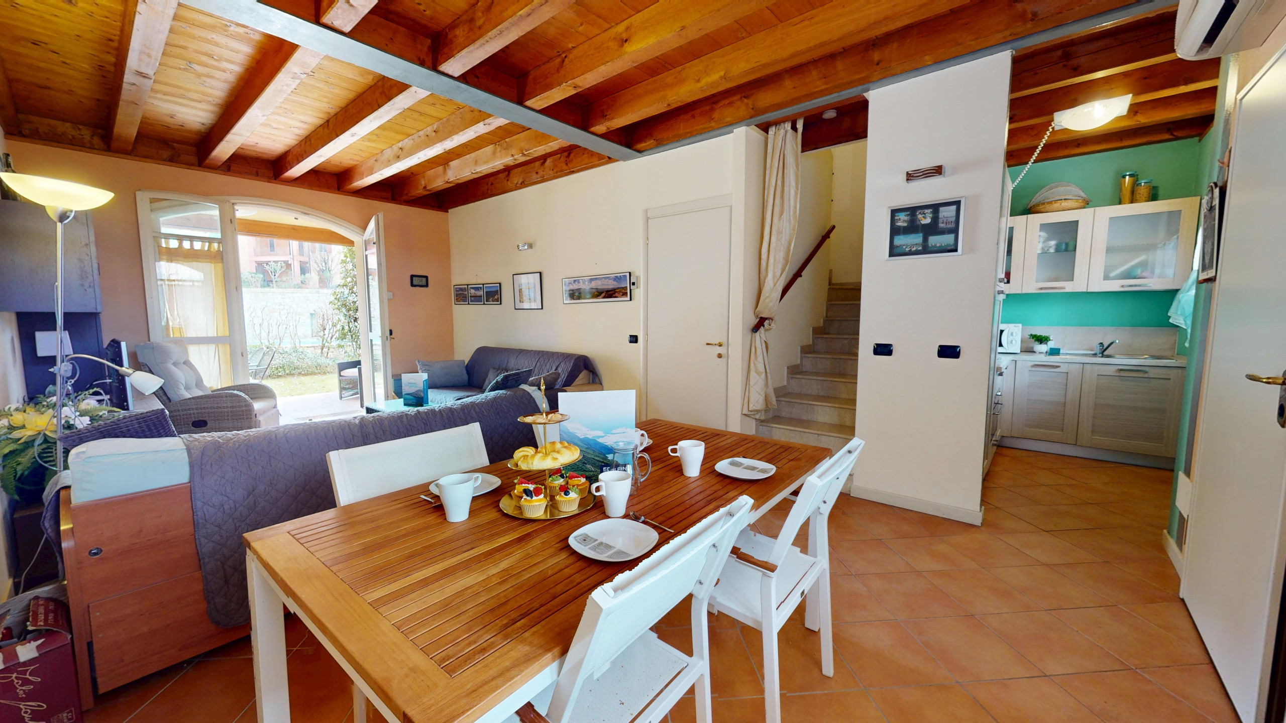 The apartment, bright and functional, is the ideal refuge after a day spent exploring Lake Garda: the fully equipped American kitchen will make you feel at home, whether you want to cook comfortably or enjoy a morning coffee, comfortable sofa bed in the living area, double bedroom, second room with bunk beds, both overlooking the garden.