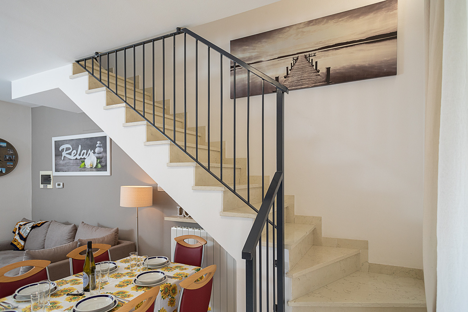 On the ground floor there is a spacious living area with kitchenette, fridge and freezer, dishwasher, washing machine and oven. Toaster and German coffee machine are provided. The living room, which overlooks a well-kept garden, has a comfortable sofa bed that can accommodate an adult or a child, and satellite TV.