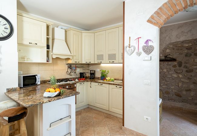 The Rustico Petra is spread over two floors and consists of a spacious living area with a decorative fireplace (not usable), a double sofa bed, a large dining table for 8 people, satellite TV, and air conditioning. The equipped kitchen area includes a large refrigerator, a 4-burner gas stove, dishwasher, and oven. A windowed bathroom with a shower cabin. On the first floor, there are 3 bedrooms: a large double bedroom with a large wardrobe and two rooms with single beds and a pull-out bed, air conditioning, washing machine, and an elegant windowed bathroom with a shower and integrated whirlpool bathtub. All windows are equipped with mosquito nets. High-quality finishes such as marble flooring and exposed stone walls give great charm to this dwelling. Covered outdoor parking space and a small garden furnished with a gazebo, table, and chairs. Pets not allowed. Non-smoking apartment. From Monday to Saturday, the municipal bus shuttle is available to reach the center of Bardolino.