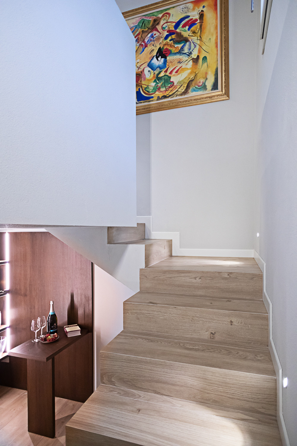 Inside, the spaces are spacious and bright, with high ceilings featuring exposed beams and refined architectural details.