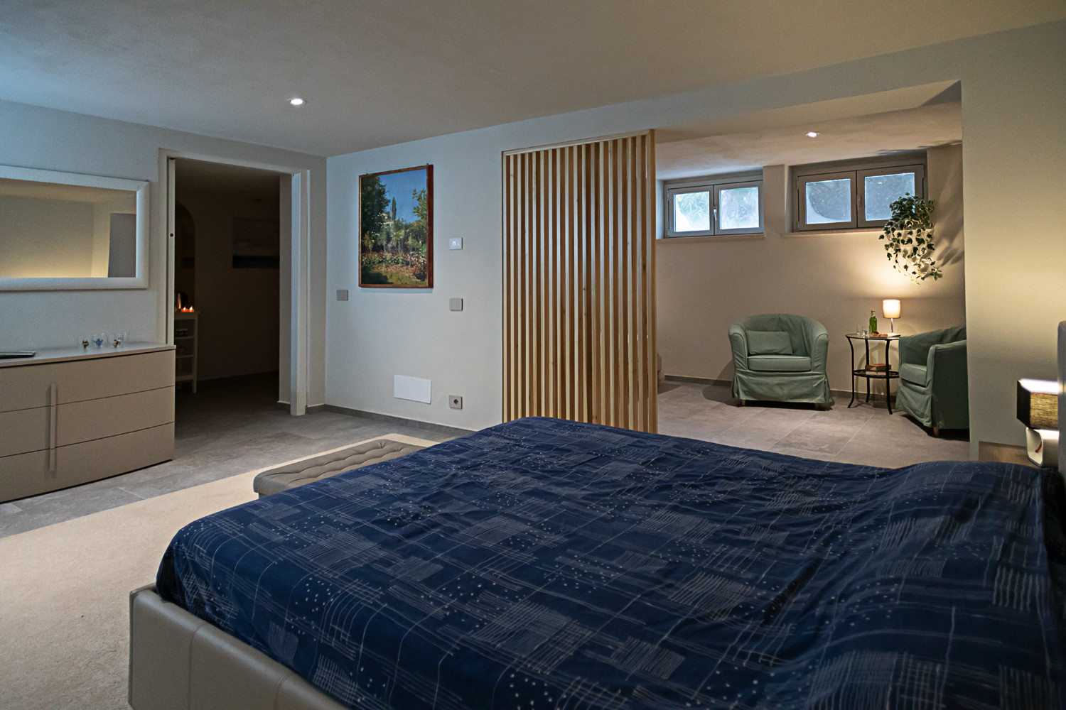 On the ground floor there are also two bedrooms with private bathroom. The master bedroom, of generous dimensions, has a spacious walk-in wardrobe. The second bedroom offers a spacious wardrobe.